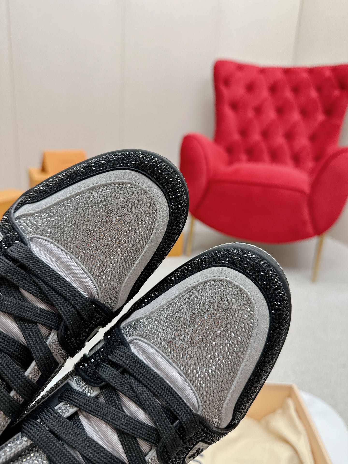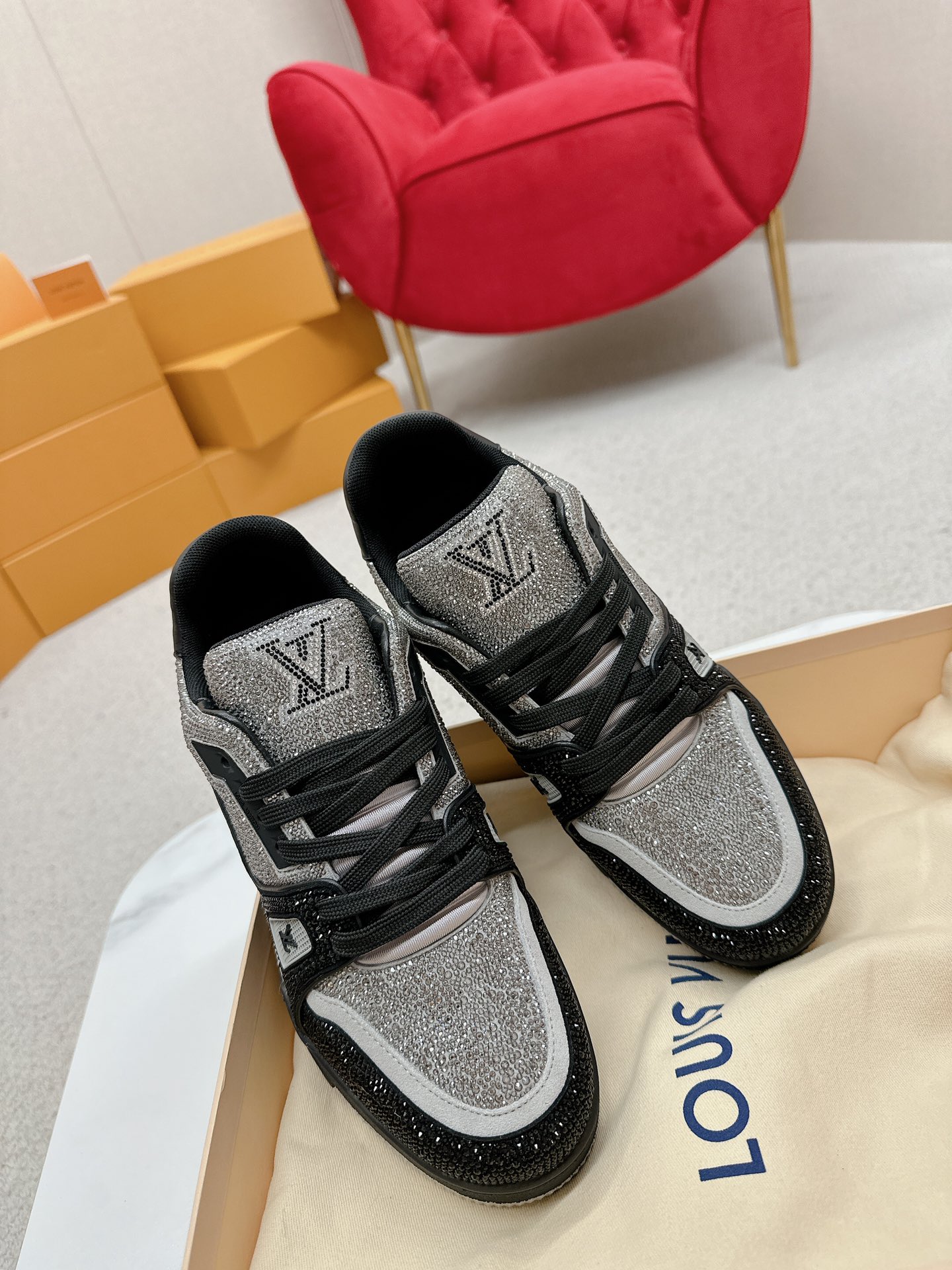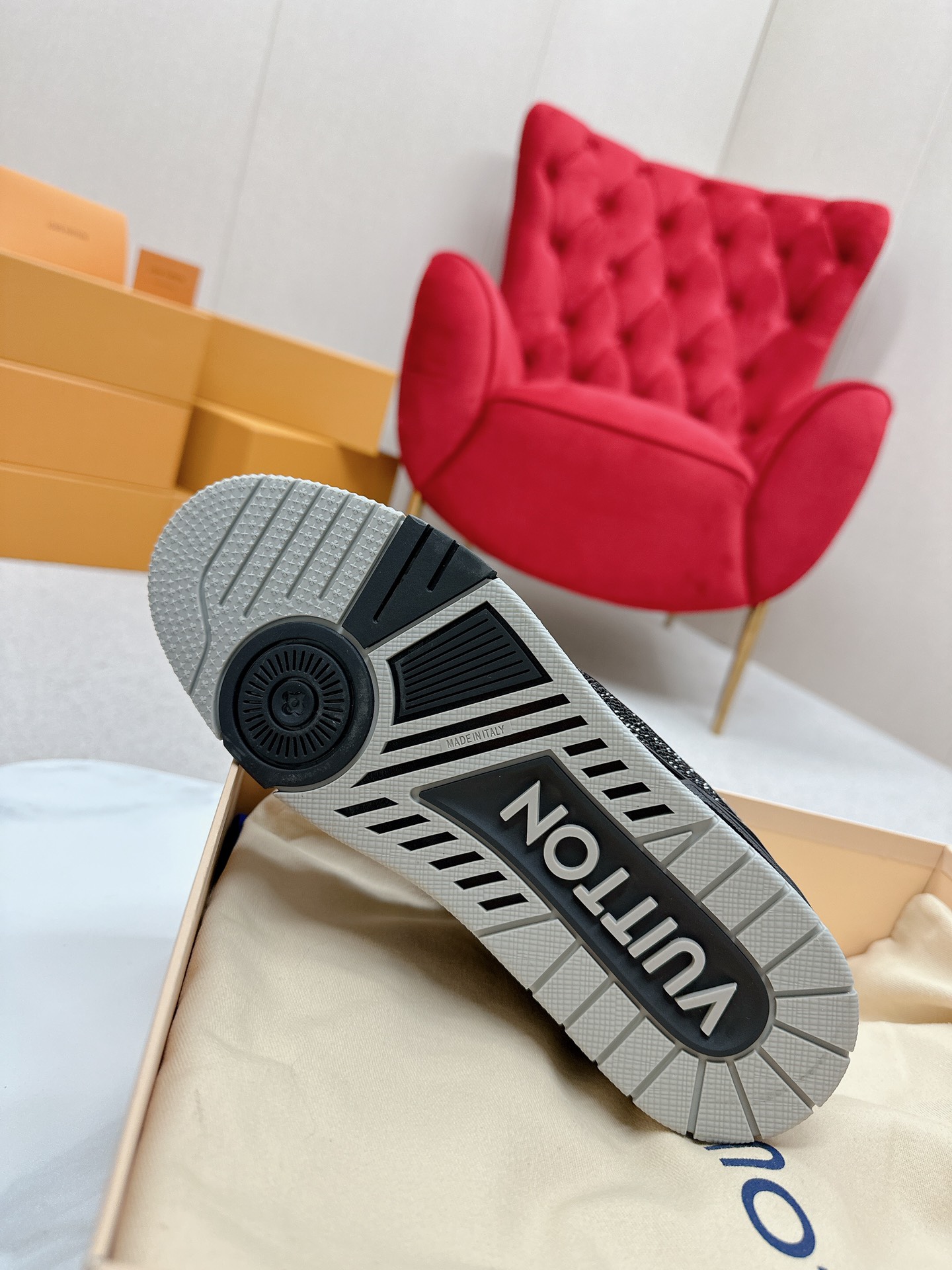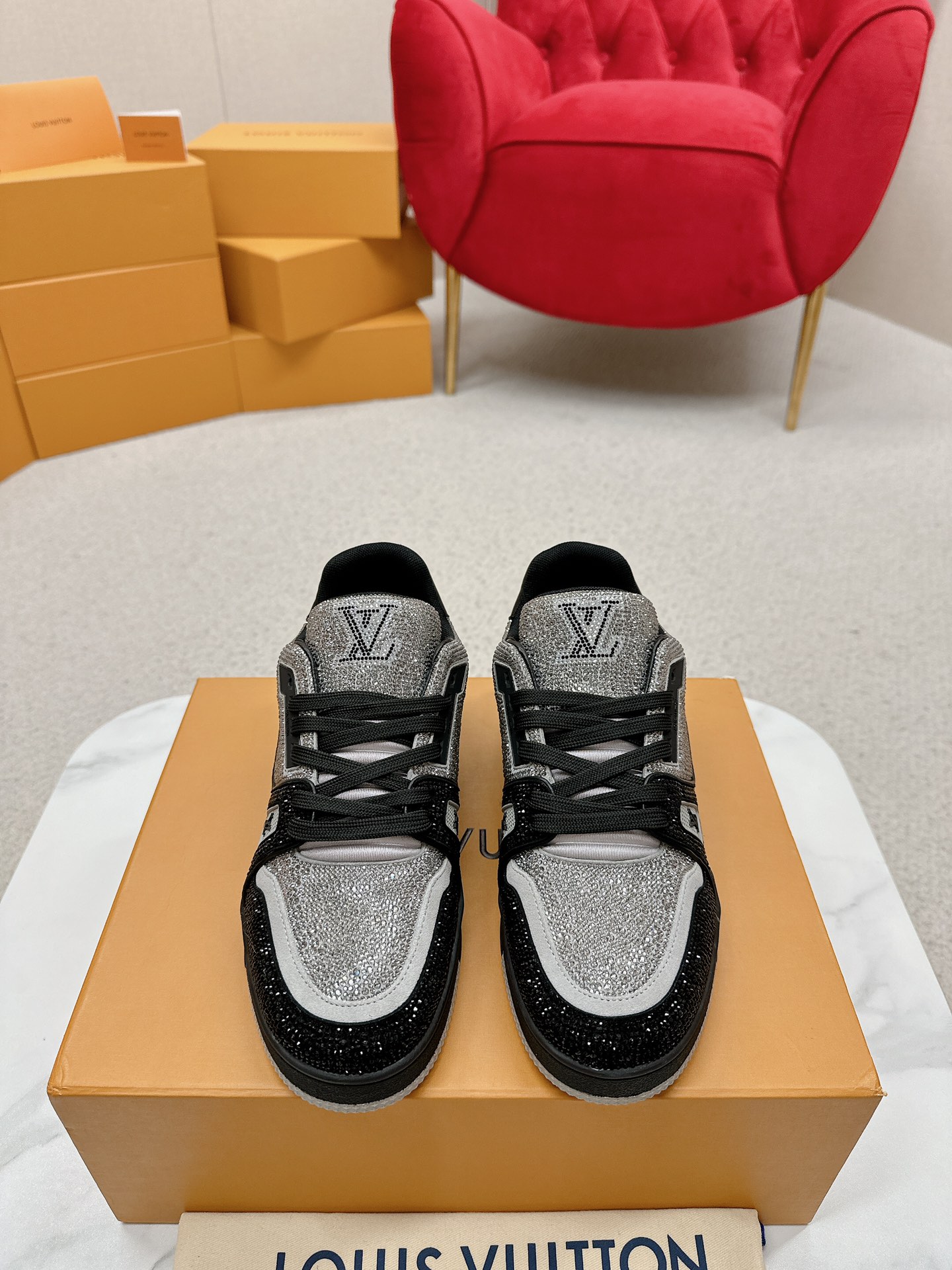 这款鞋子是AAAAA 1:1 质量 (非常棒). 使用了和原版一模一样的材料. 商标部分也保持了和路易威登/Louis Vuitton一样. 图片拍摄是实物鞋子拍摄, 您所收到的实物保证和我们图片一模一样.