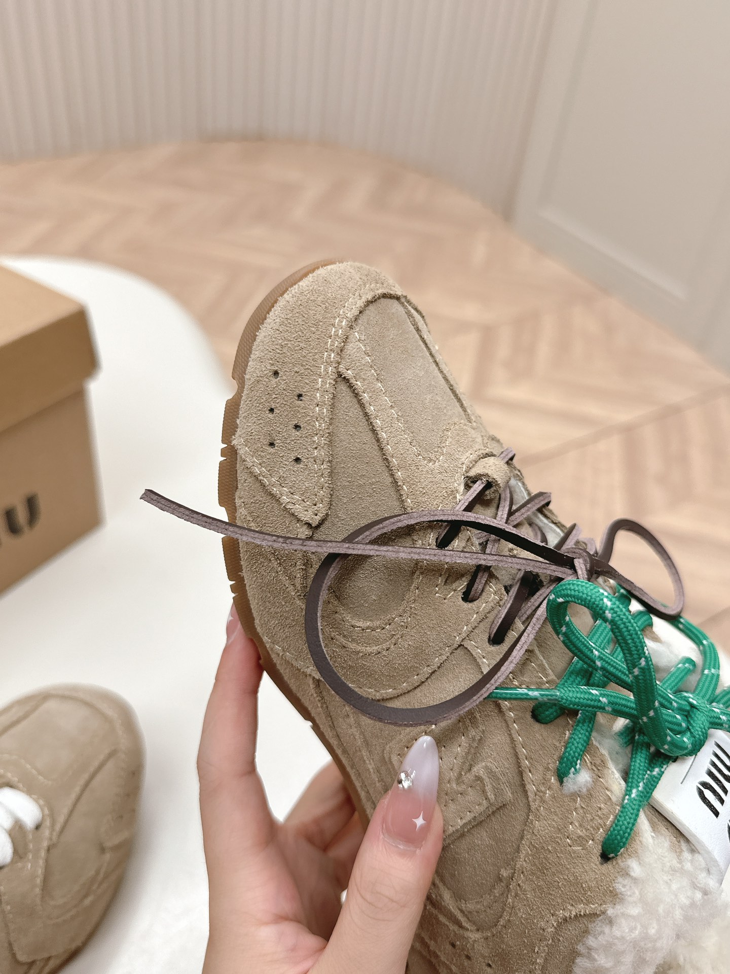 这款鞋子是AAAAA 1:1 质量 (非常棒). 使用了和原版一模一样的材料. 商标部分也保持了和缪缪/Miu Miu一样. 图片拍摄是实物鞋子拍摄, 您所收到的实物保证和我们图片一模一样.