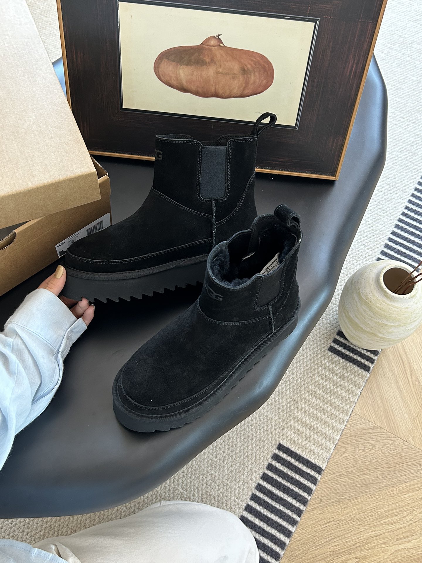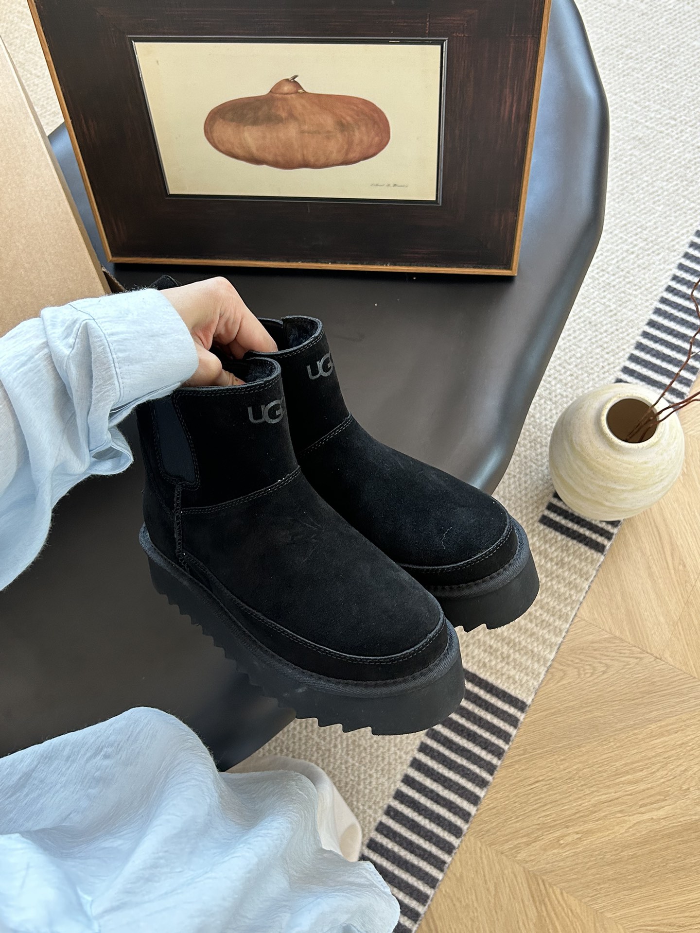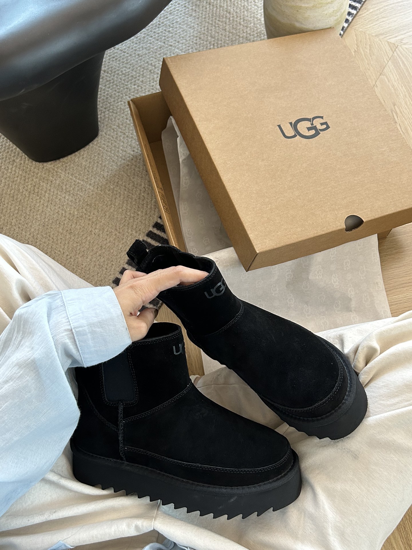 这款鞋子是AAAAA 1:1 质量 (非常棒). 使用了和原版一模一样的材料. 商标部分也保持了和UGG雪地靴一样. 图片拍摄是实物鞋子拍摄, 您所收到的实物保证和我们图片一模一样.