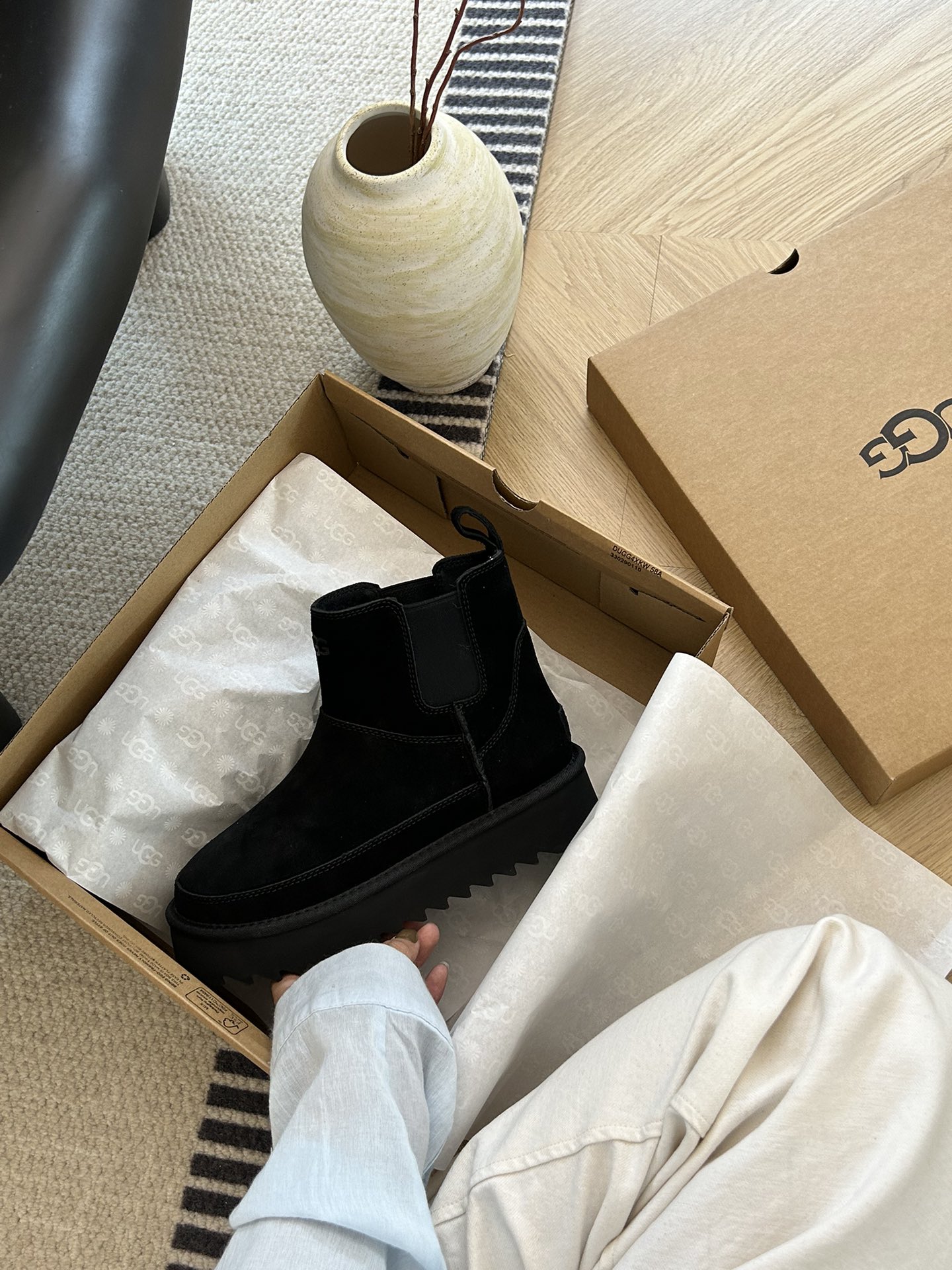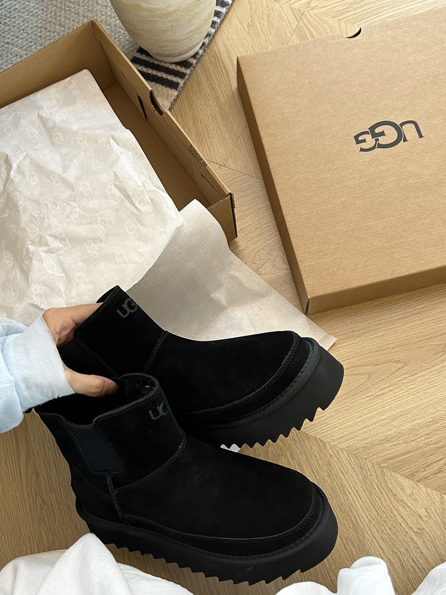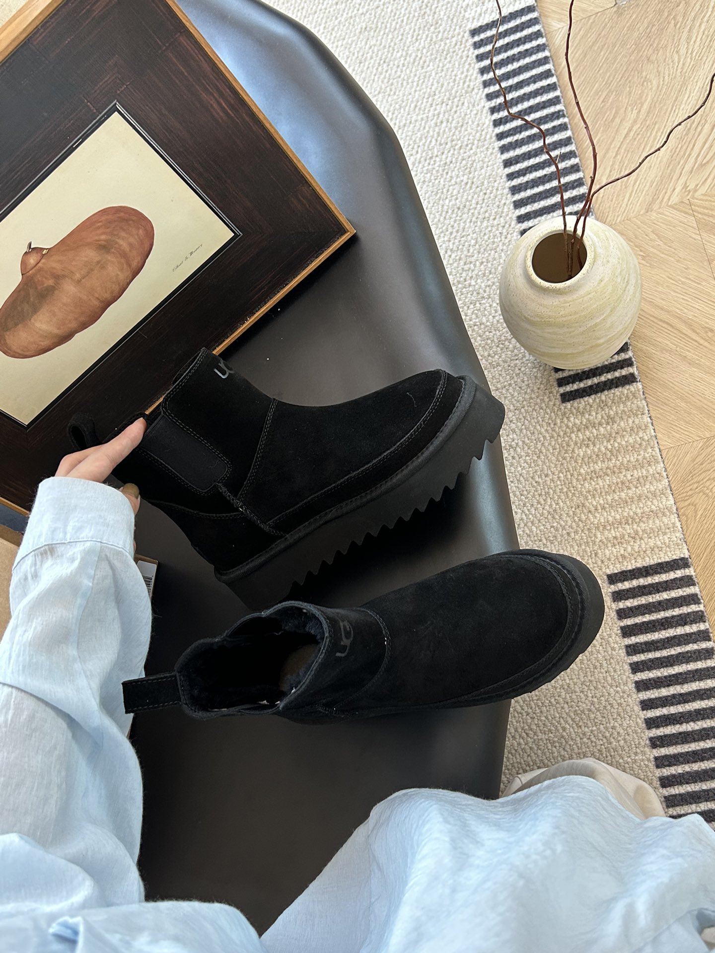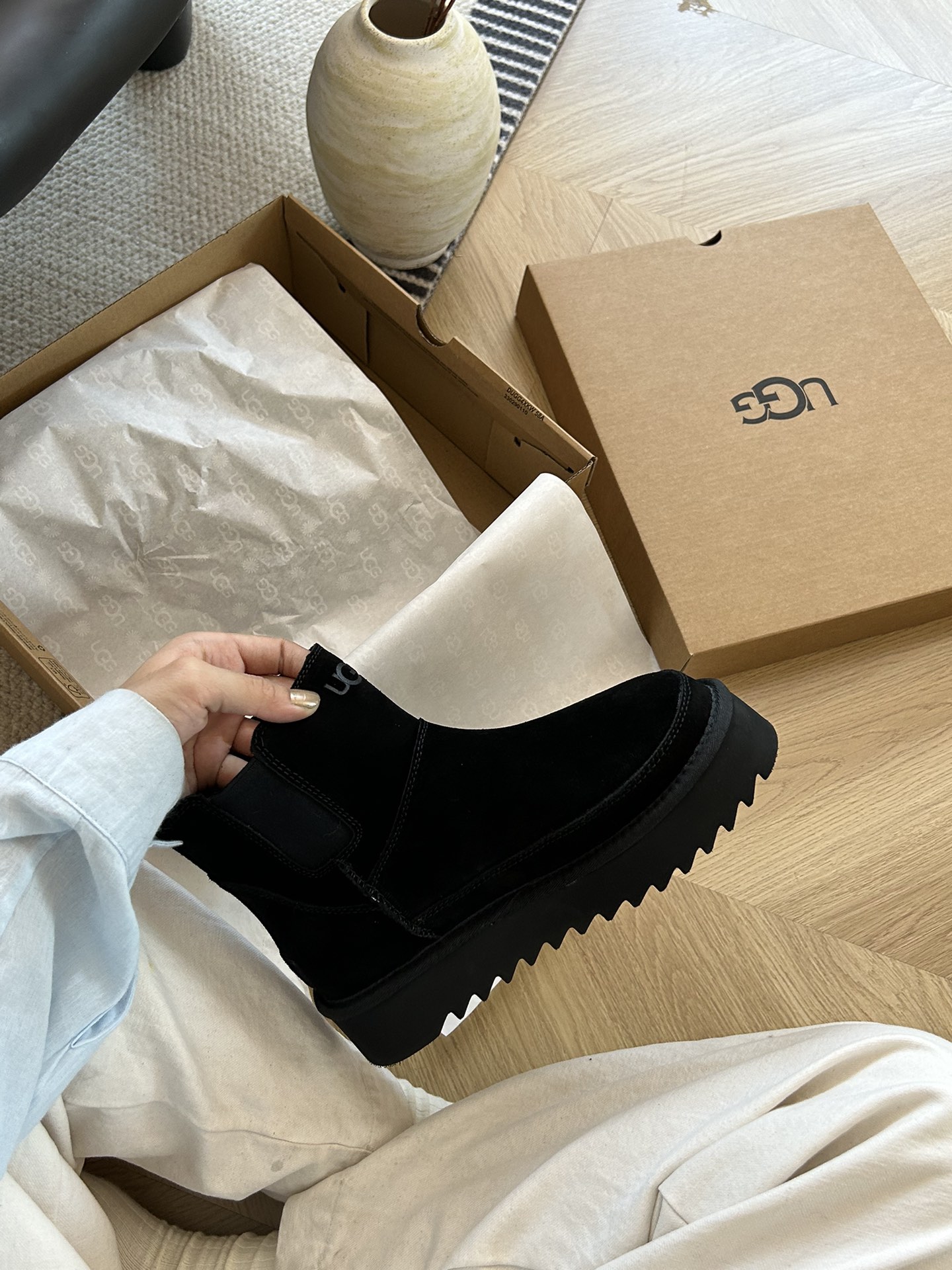 这款鞋子是AAAAA 1:1 质量 (非常棒). 使用了和原版一模一样的材料. 商标部分也保持了和UGG雪地靴一样. 图片拍摄是实物鞋子拍摄, 您所收到的实物保证和我们图片一模一样.