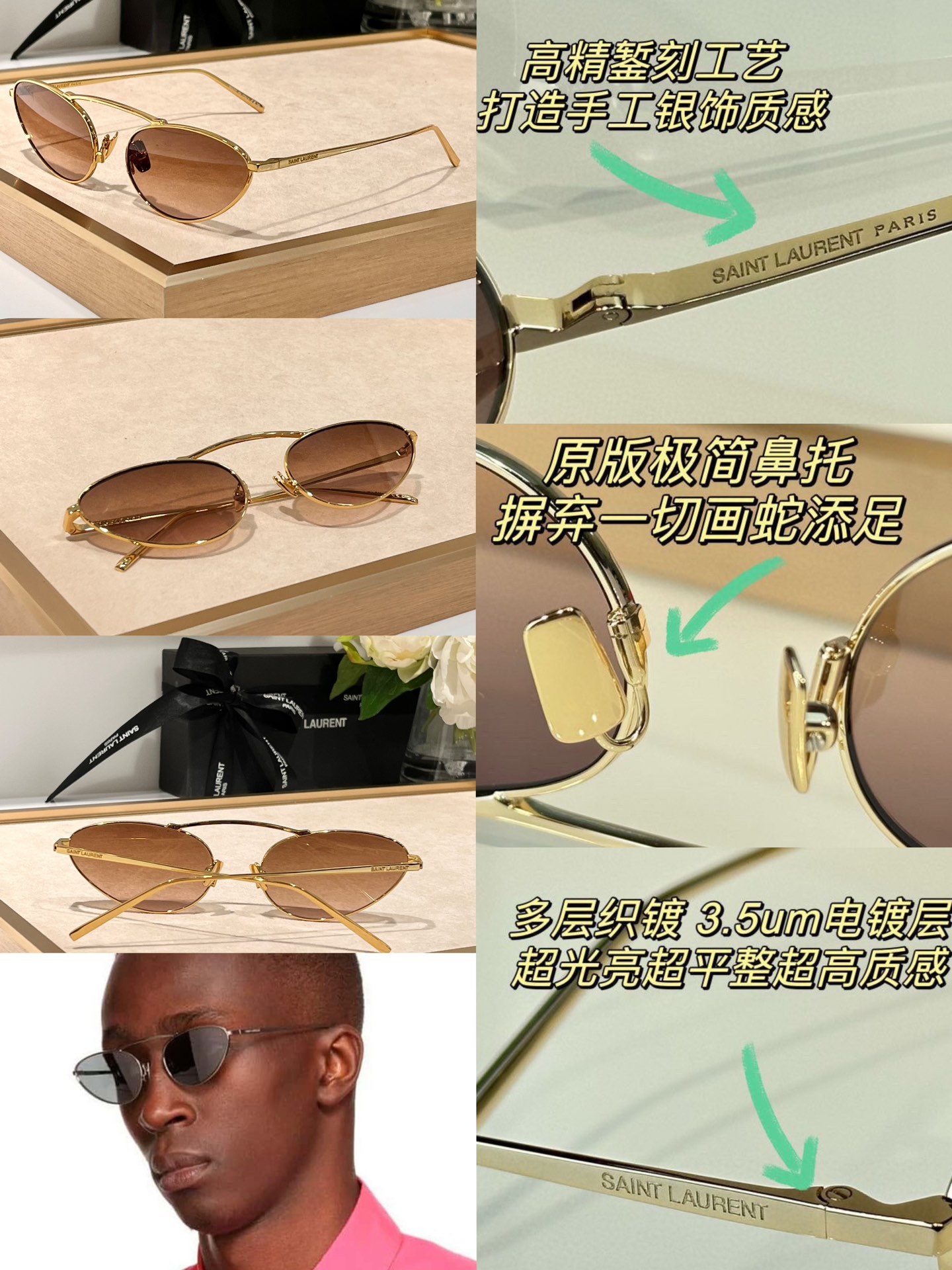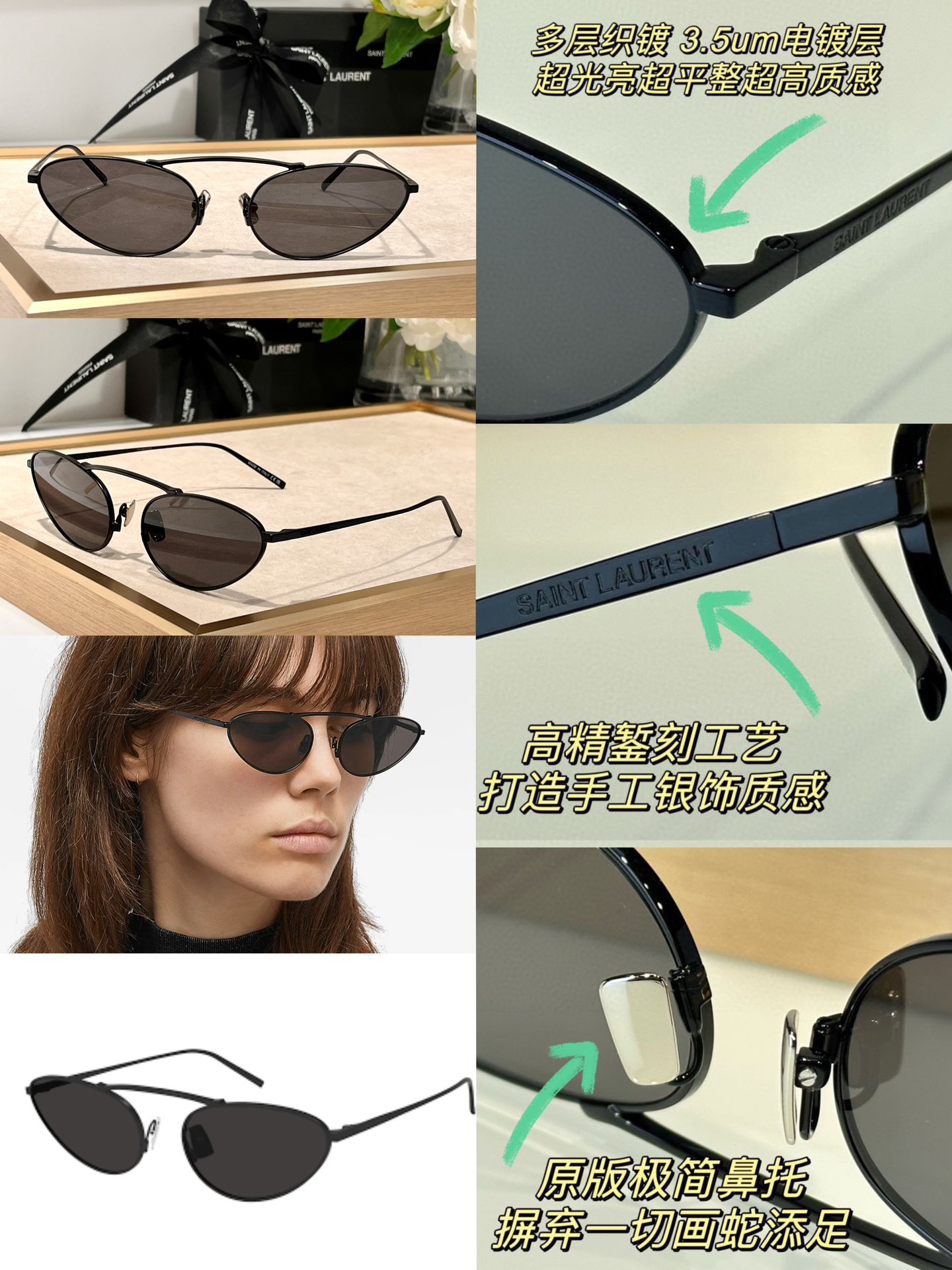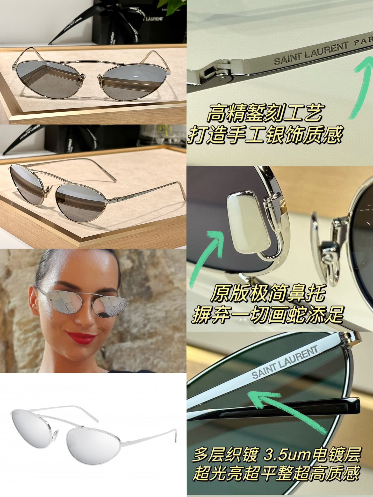 这款太阳眼镜是AAAAA 1:1 质量 (非常棒). 使用了和原版一模一样的材料. 商标部分也保持了和圣罗兰/Saint Laurent一样. 图片拍摄是实物太阳眼镜拍摄, 您所收到的实物保证和我们图片一模一样.