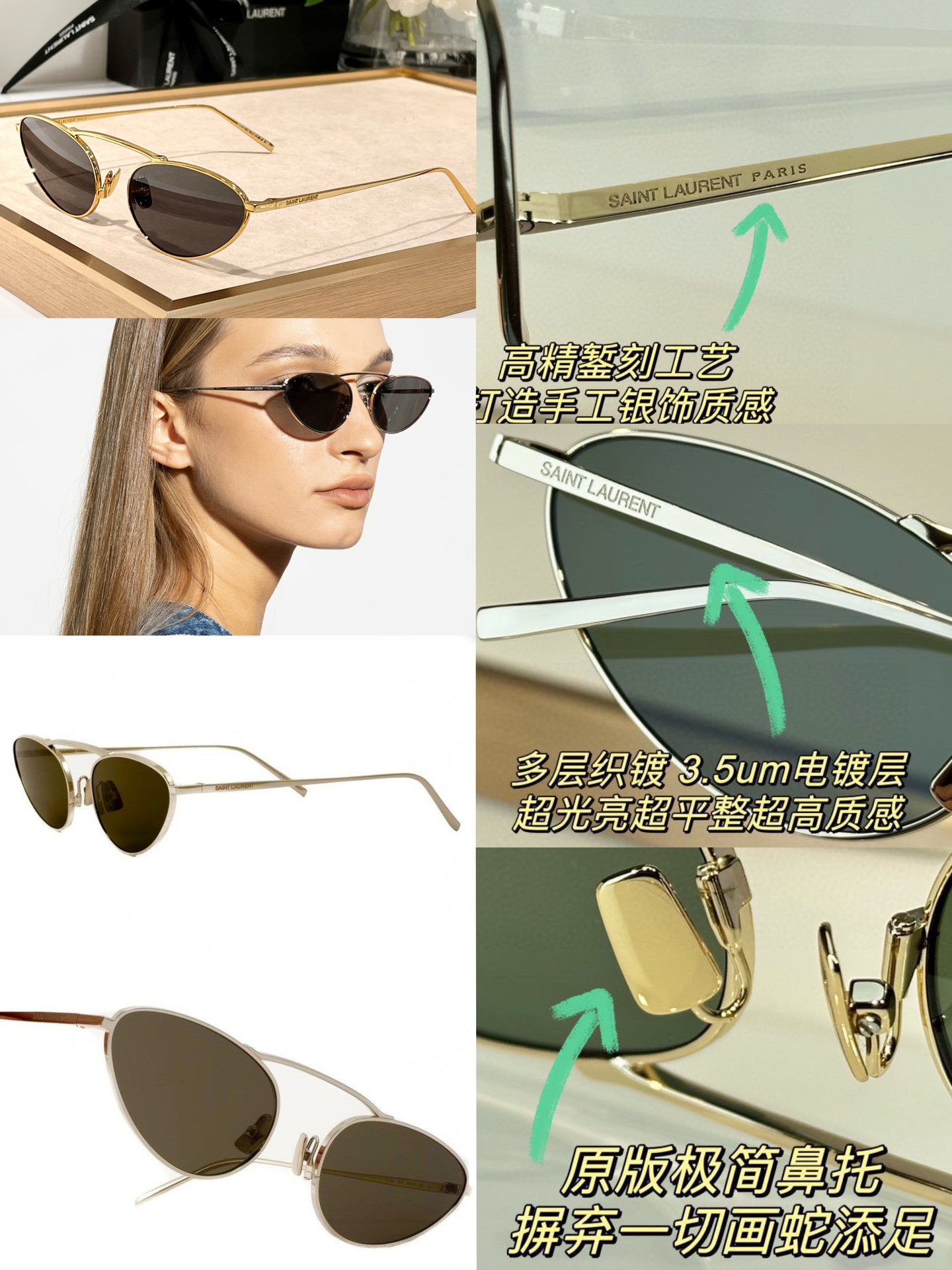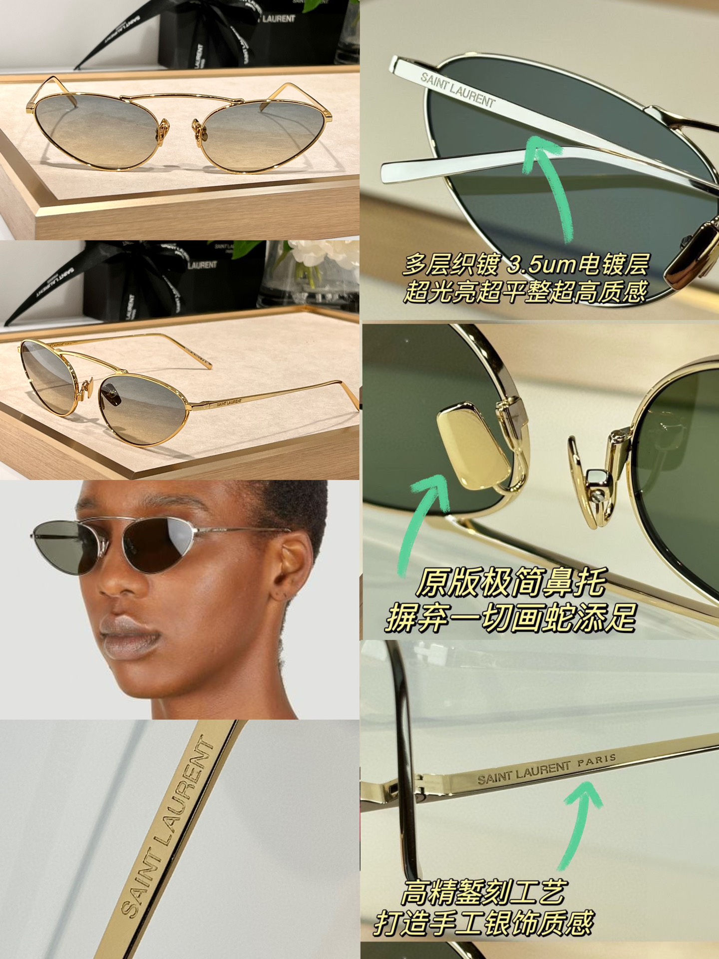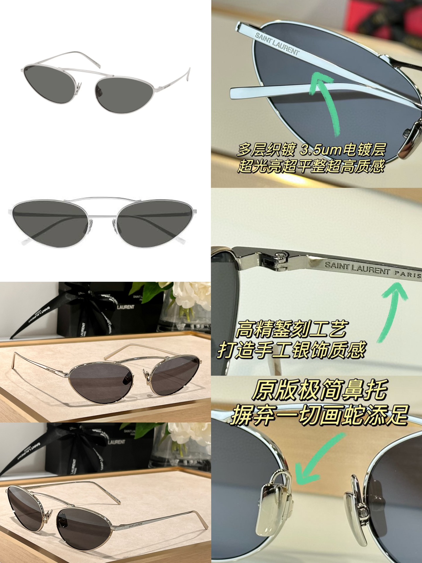 这款太阳眼镜是AAAAA 1:1 质量 (非常棒). 使用了和原版一模一样的材料. 商标部分也保持了和圣罗兰/Saint Laurent一样. 图片拍摄是实物太阳眼镜拍摄, 您所收到的实物保证和我们图片一模一样.