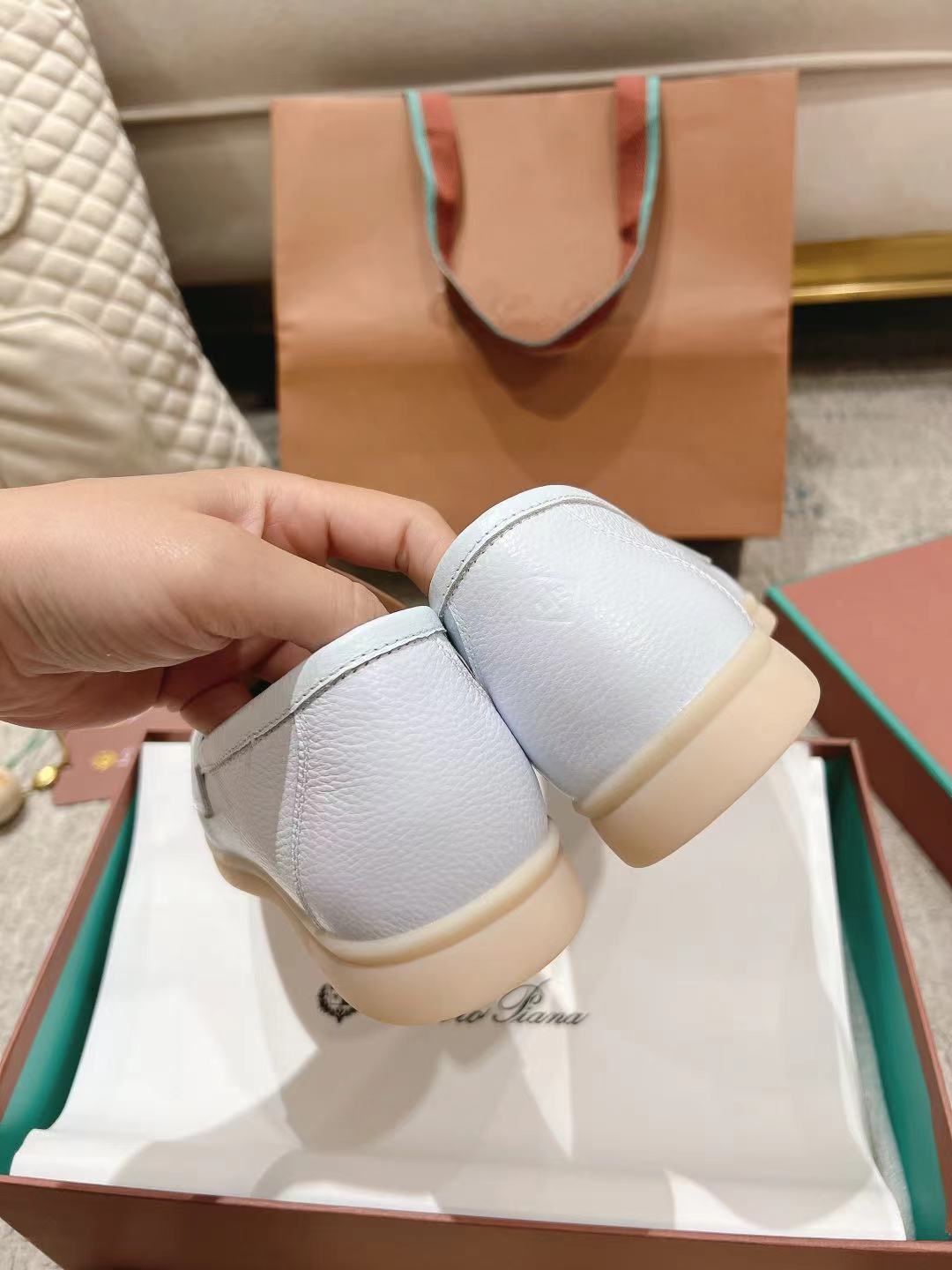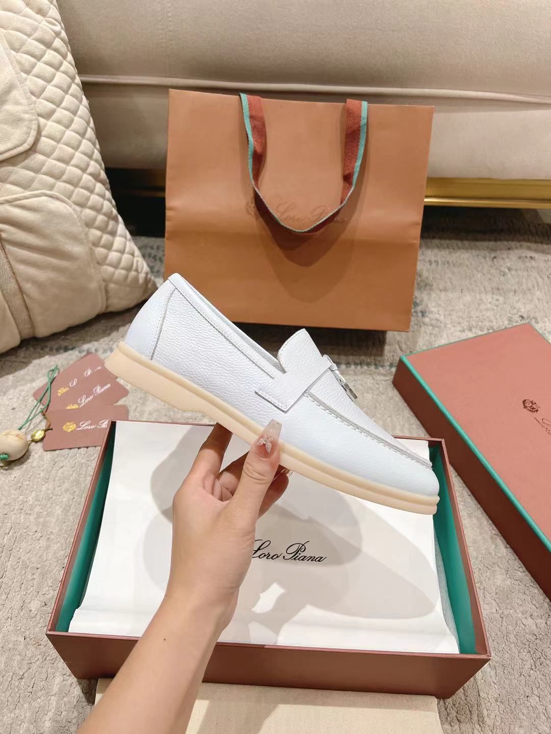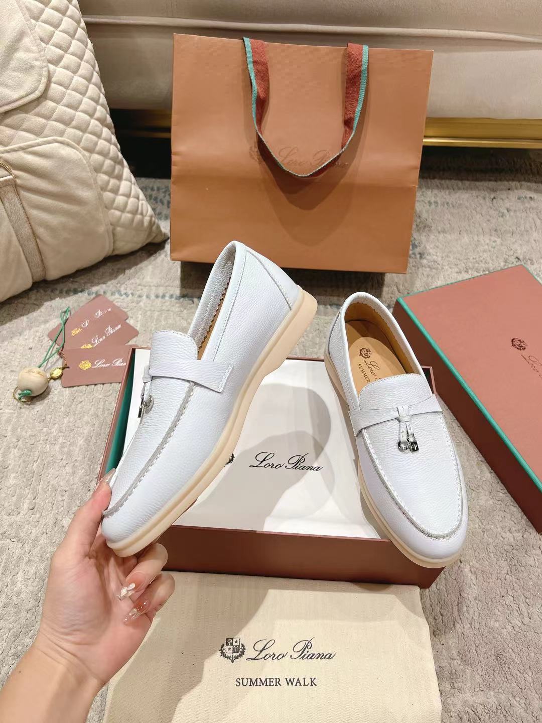 这款鞋子是AAAAA 1:1 质量 (非常棒). 使用了和原版一模一样的材料. 商标部分也保持了和洛罗皮亚纳/Loro Piana一样. 图片拍摄是实物鞋子拍摄, 您所收到的实物保证和我们图片一模一样.