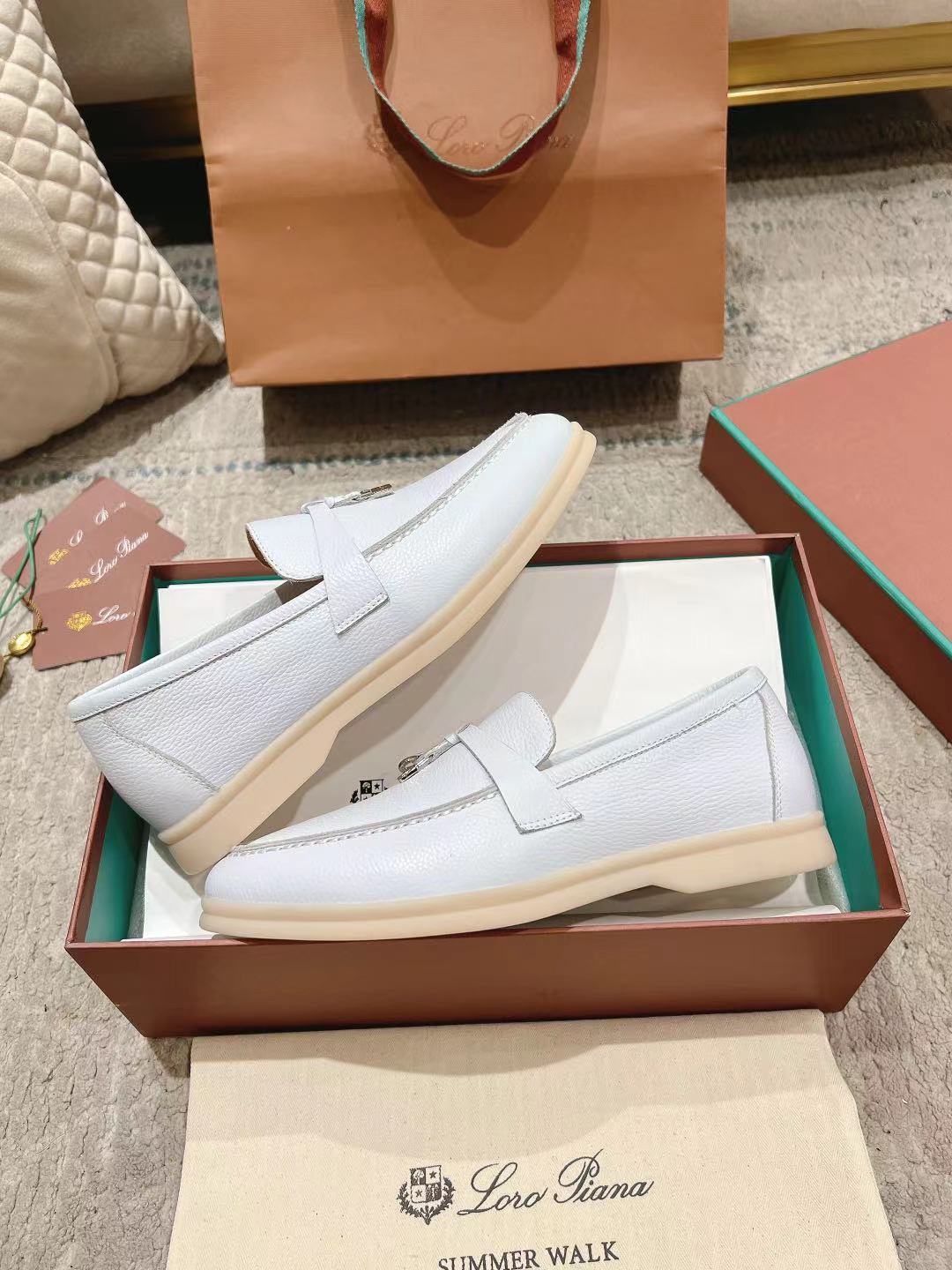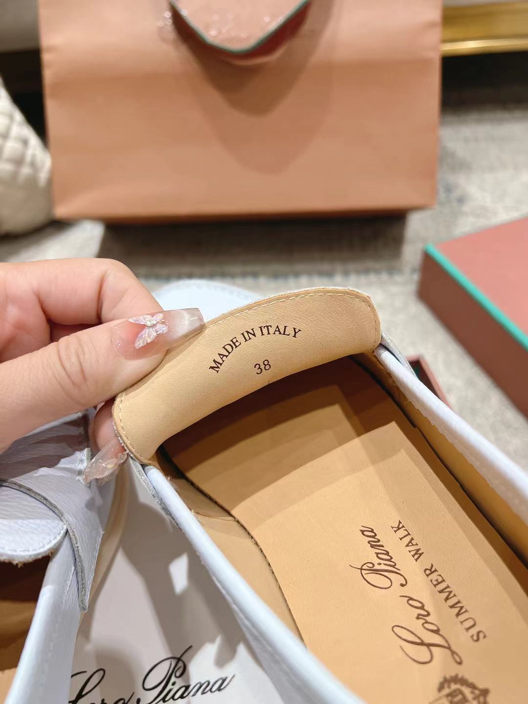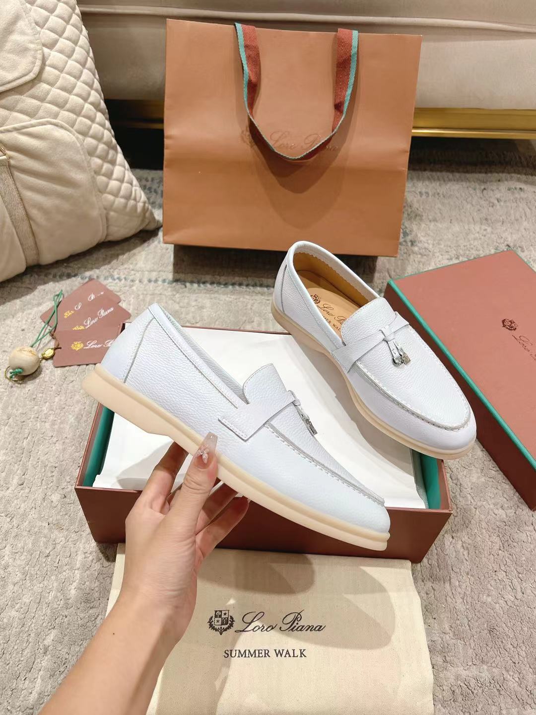 这款鞋子是AAAAA 1:1 质量 (非常棒). 使用了和原版一模一样的材料. 商标部分也保持了和洛罗皮亚纳/Loro Piana一样. 图片拍摄是实物鞋子拍摄, 您所收到的实物保证和我们图片一模一样.
