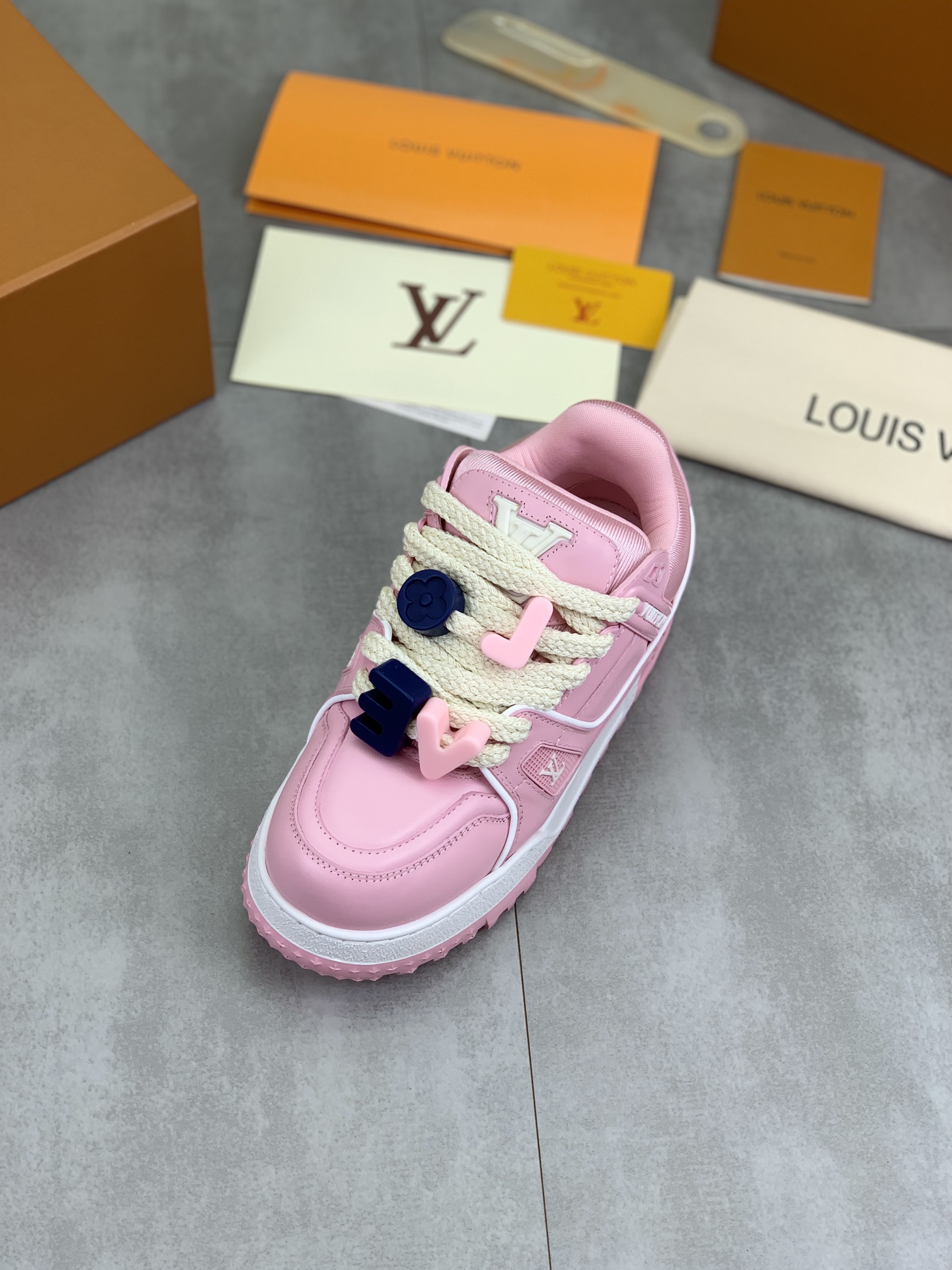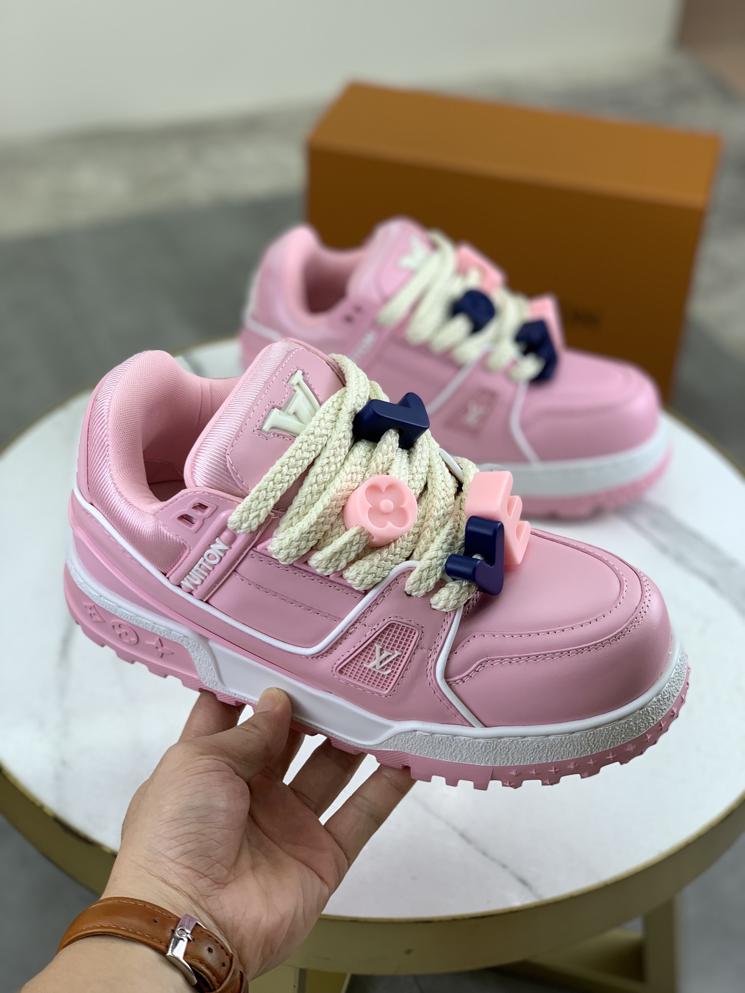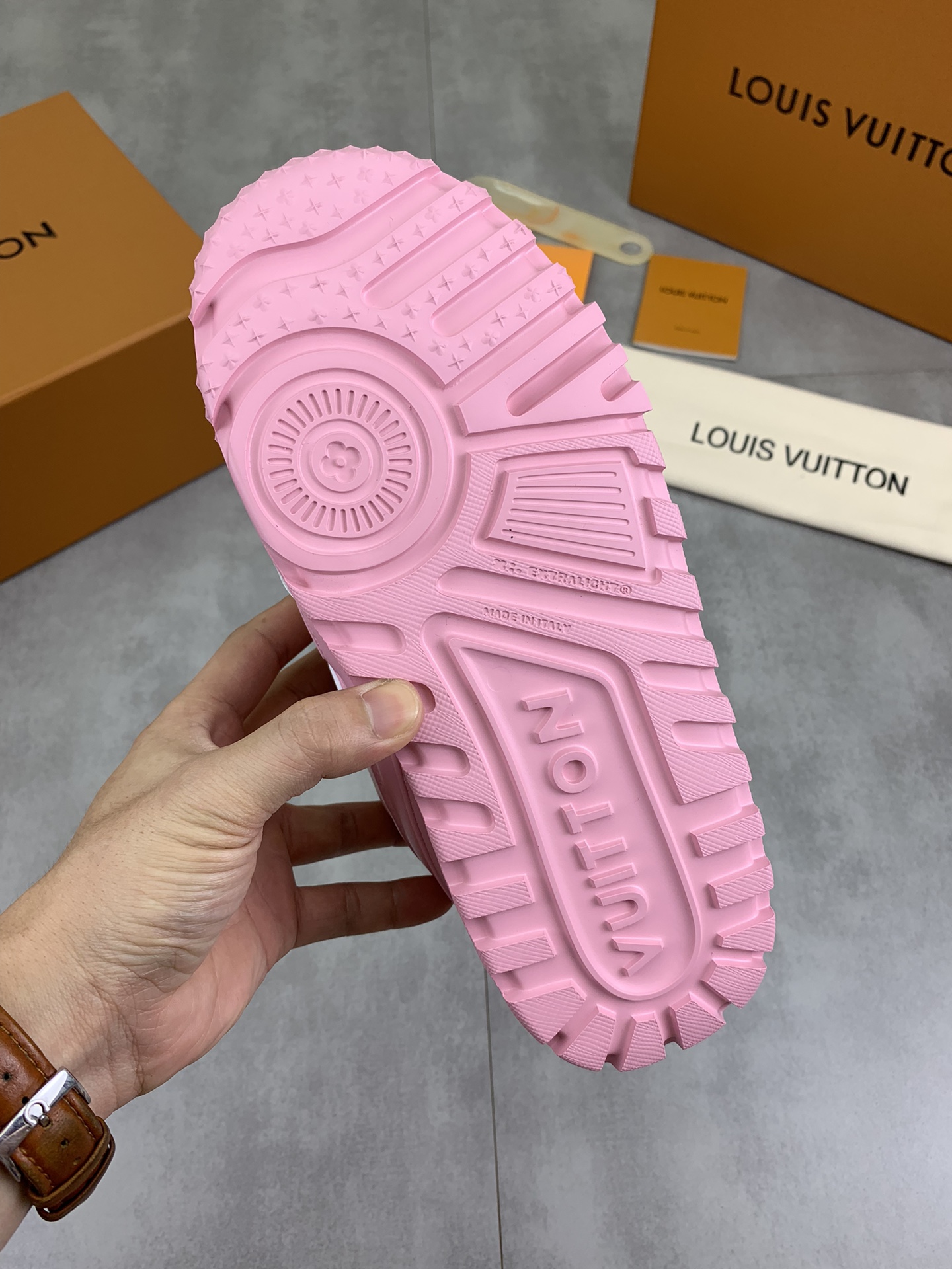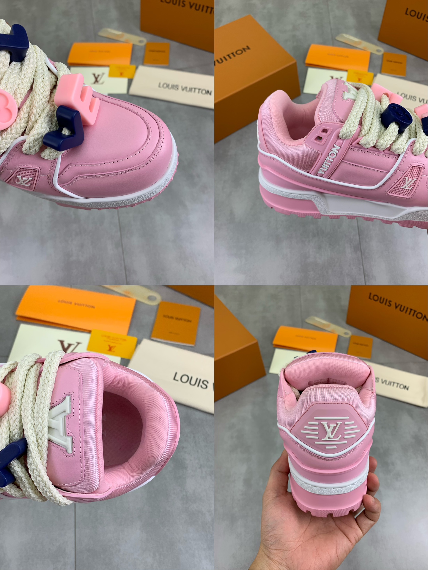 这款鞋子是AAAAA 1:1 质量 (非常棒). 使用了和原版一模一样的材料. 商标部分也保持了和路易威登/Louis Vuitton一样. 图片拍摄是实物鞋子拍摄, 您所收到的实物保证和我们图片一模一样.