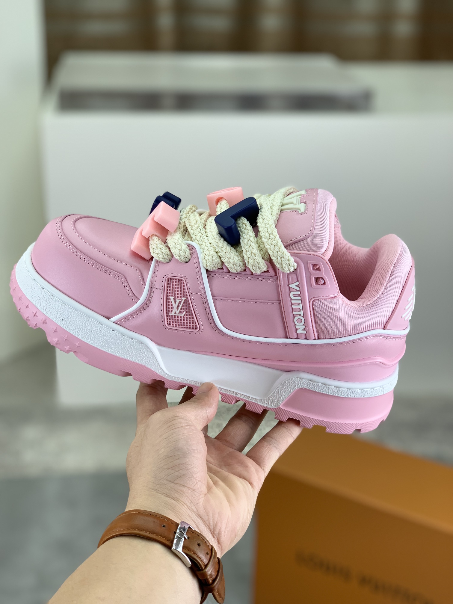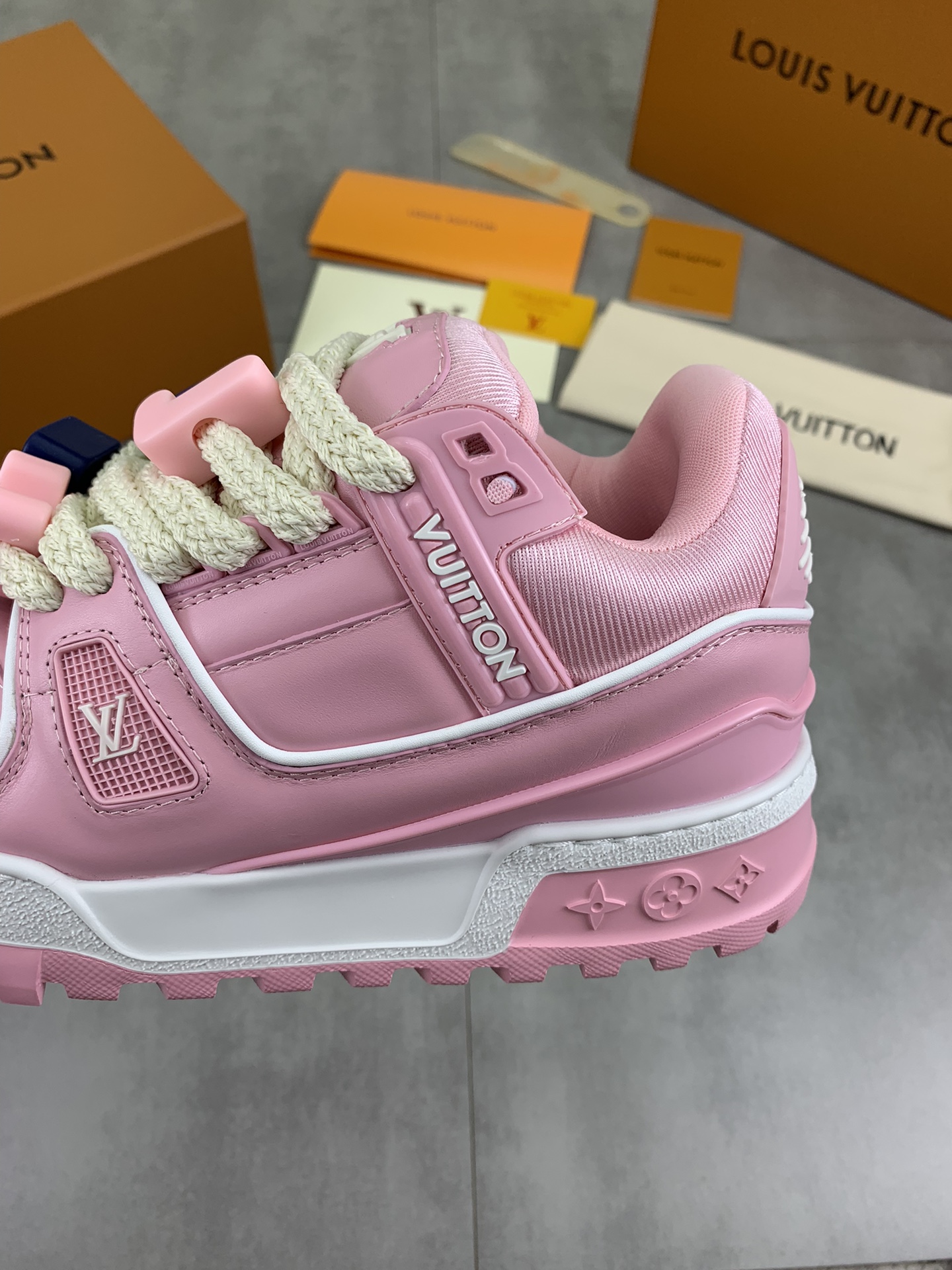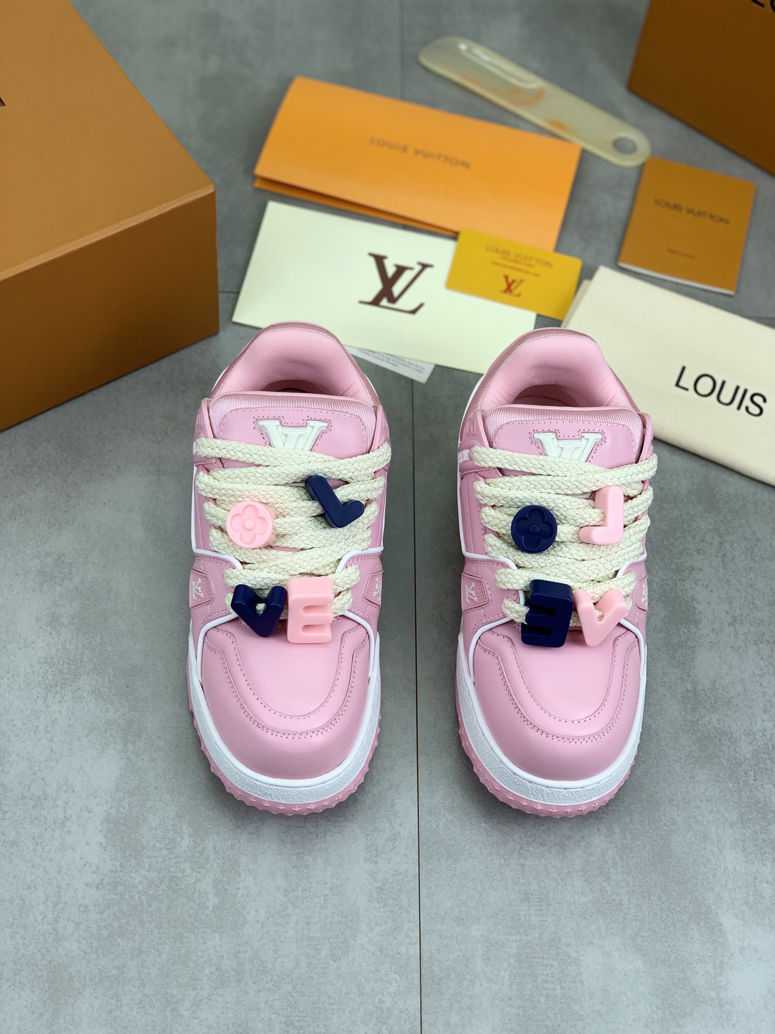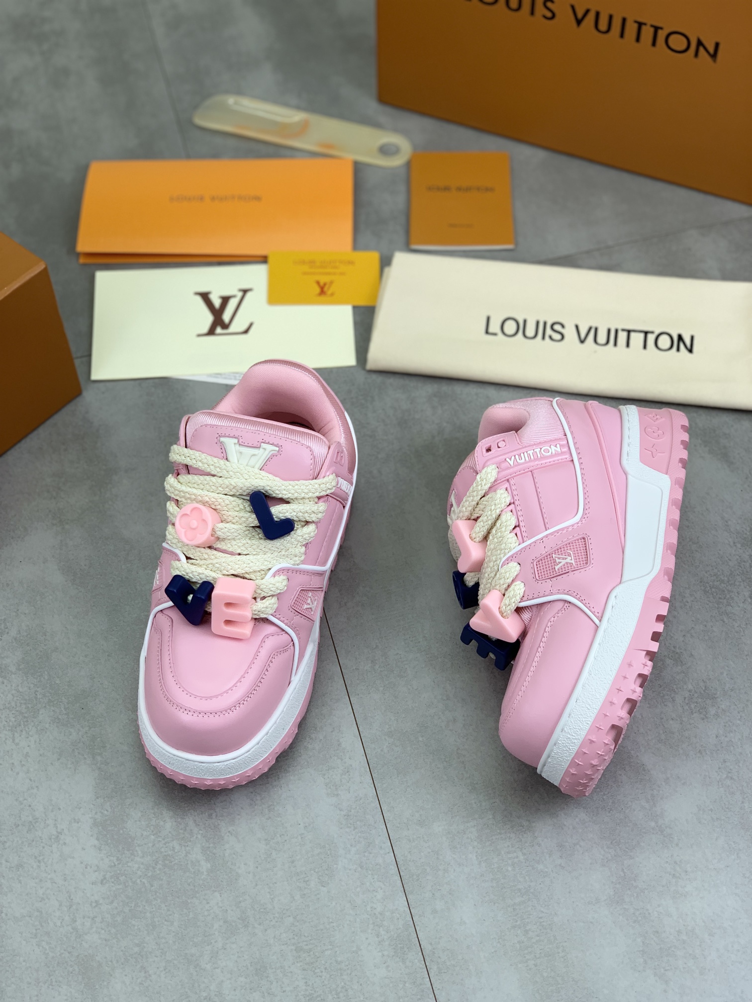 这款鞋子是AAAAA 1:1 质量 (非常棒). 使用了和原版一模一样的材料. 商标部分也保持了和路易威登/Louis Vuitton一样. 图片拍摄是实物鞋子拍摄, 您所收到的实物保证和我们图片一模一样.