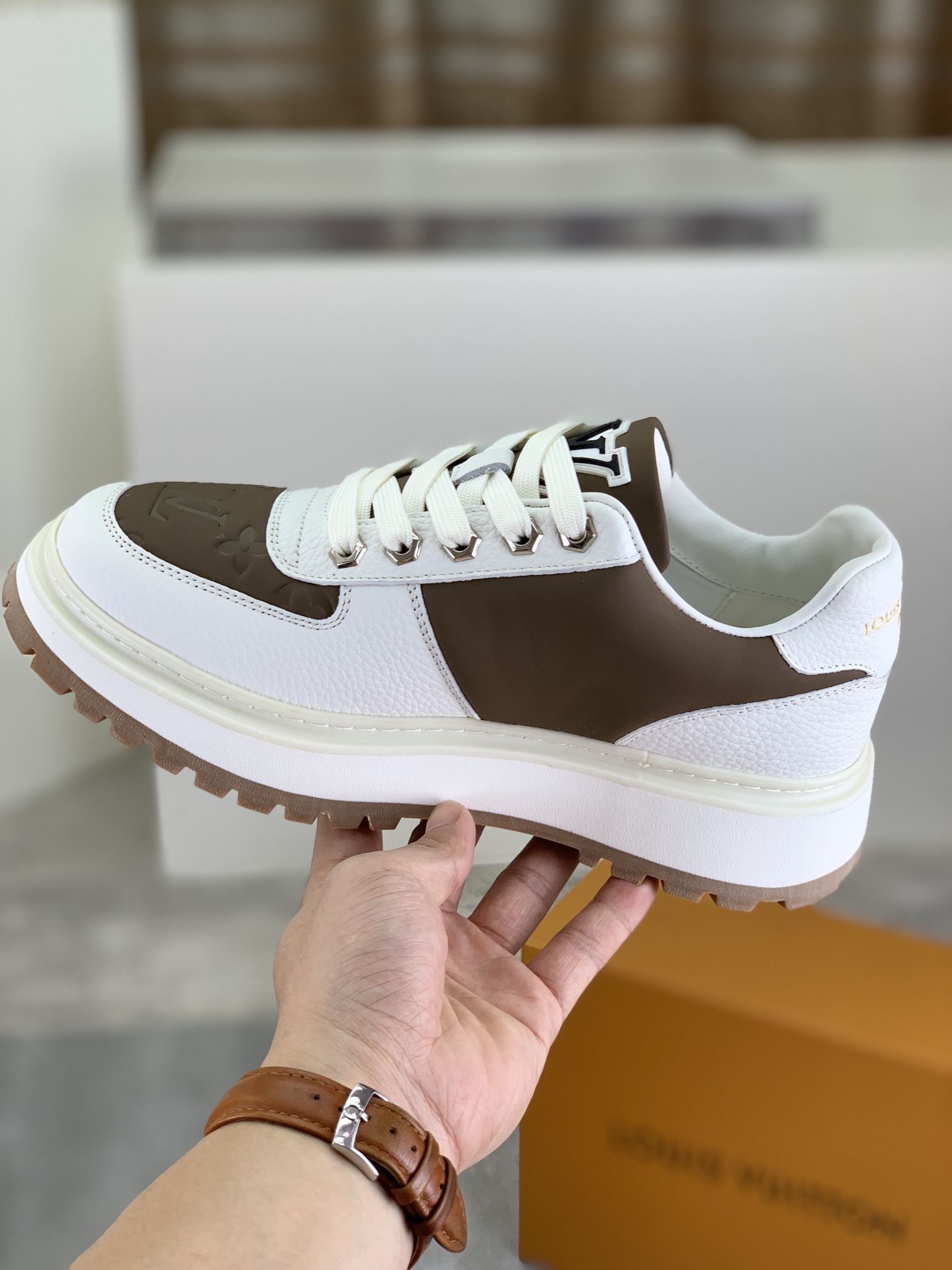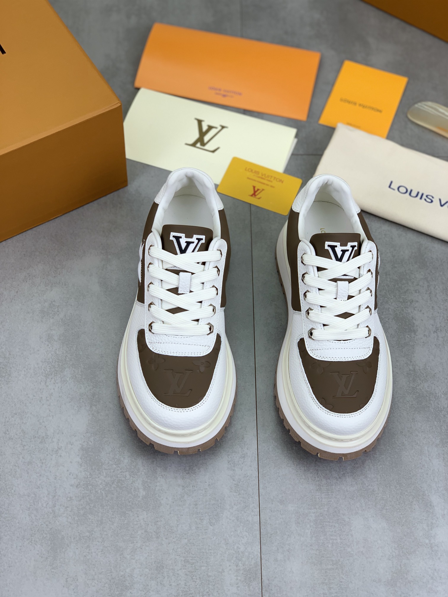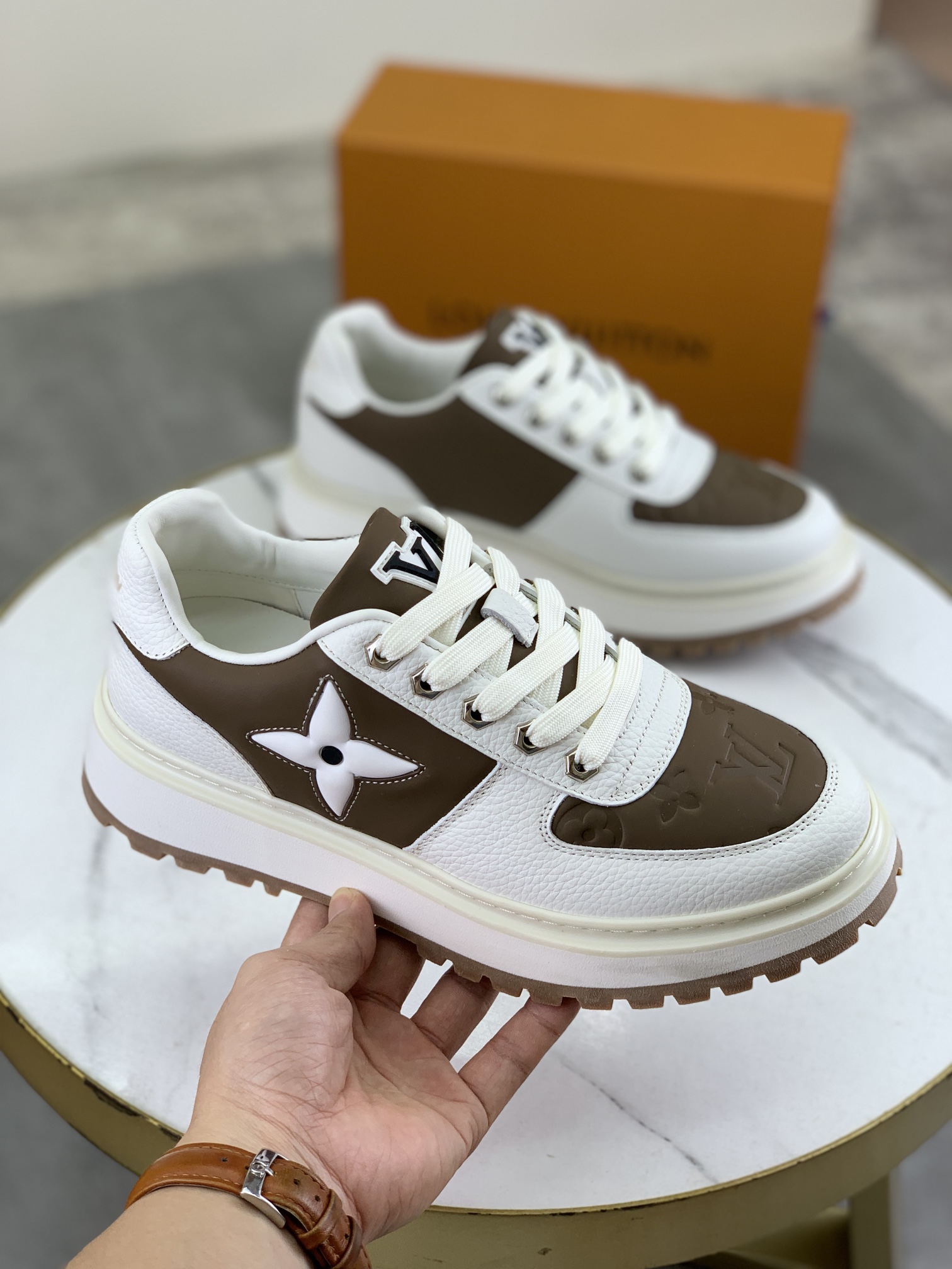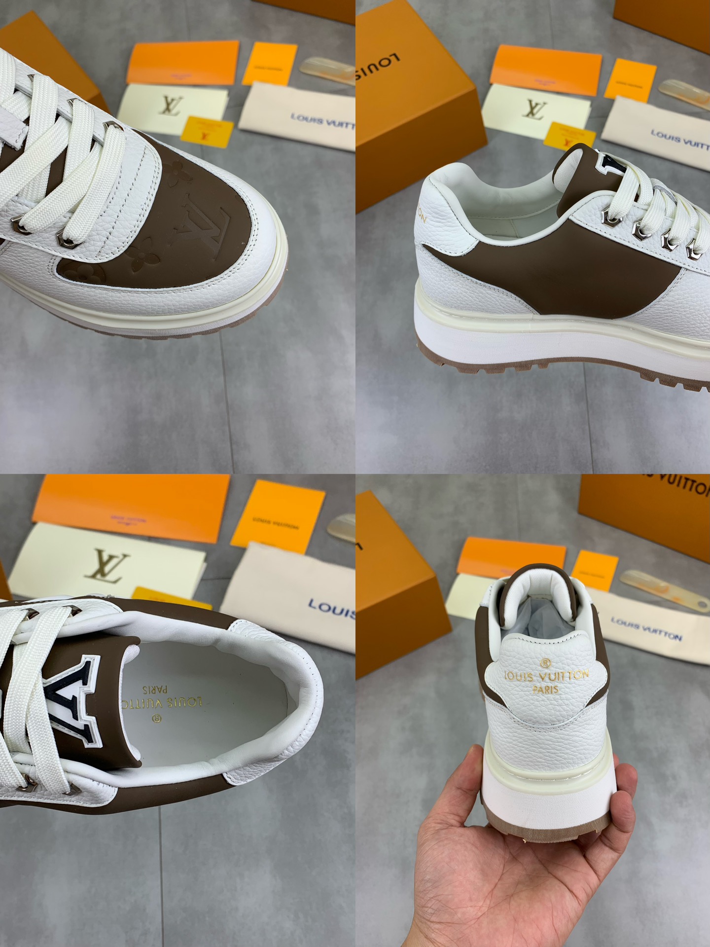 这款鞋子是AAAAA 1:1 质量 (非常棒). 使用了和原版一模一样的材料. 商标部分也保持了和路易威登/Louis Vuitton一样. 图片拍摄是实物鞋子拍摄, 您所收到的实物保证和我们图片一模一样.