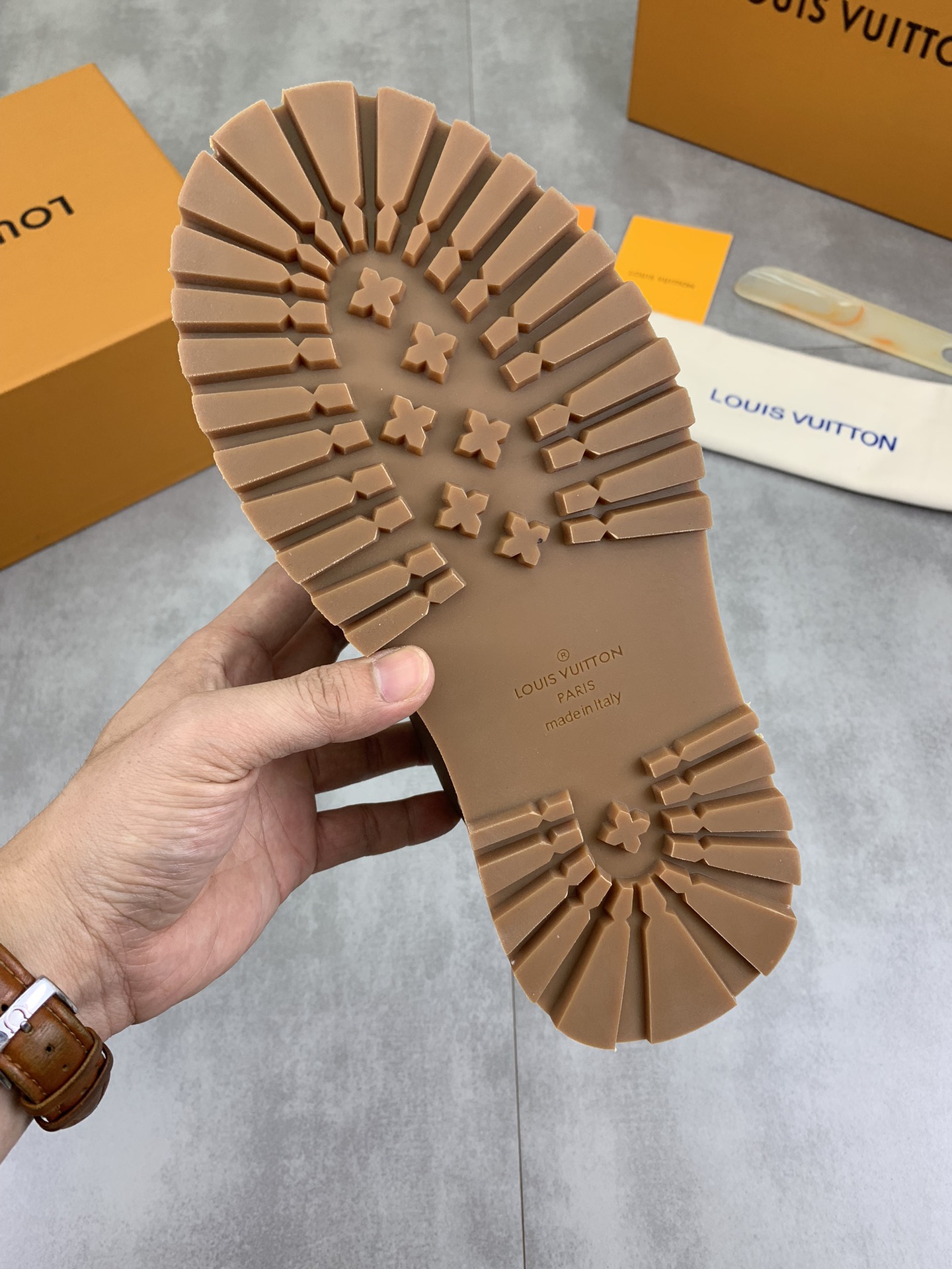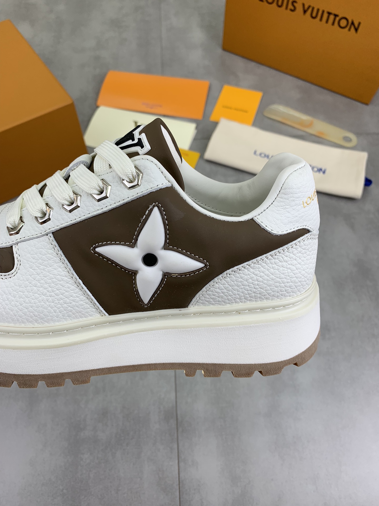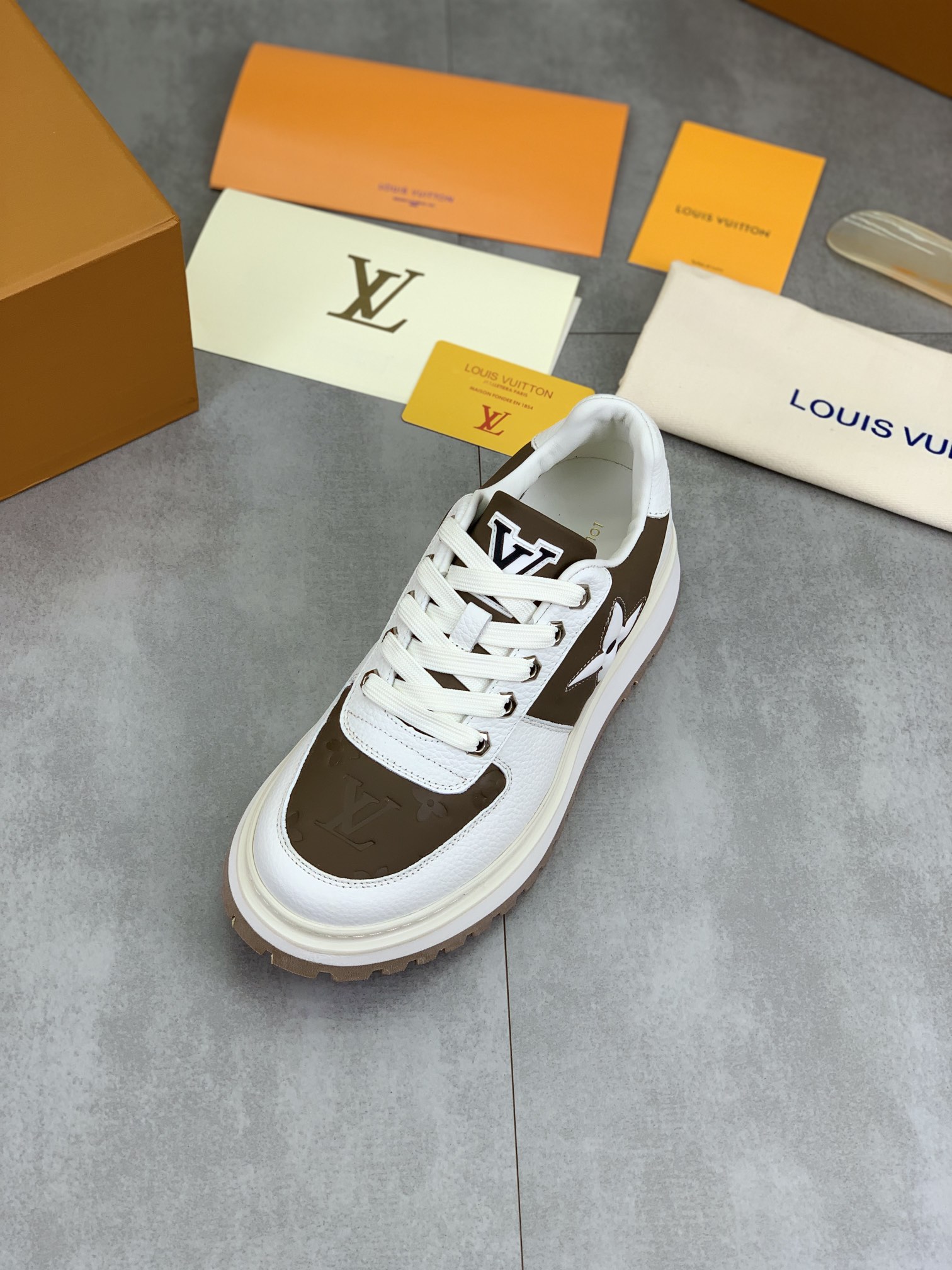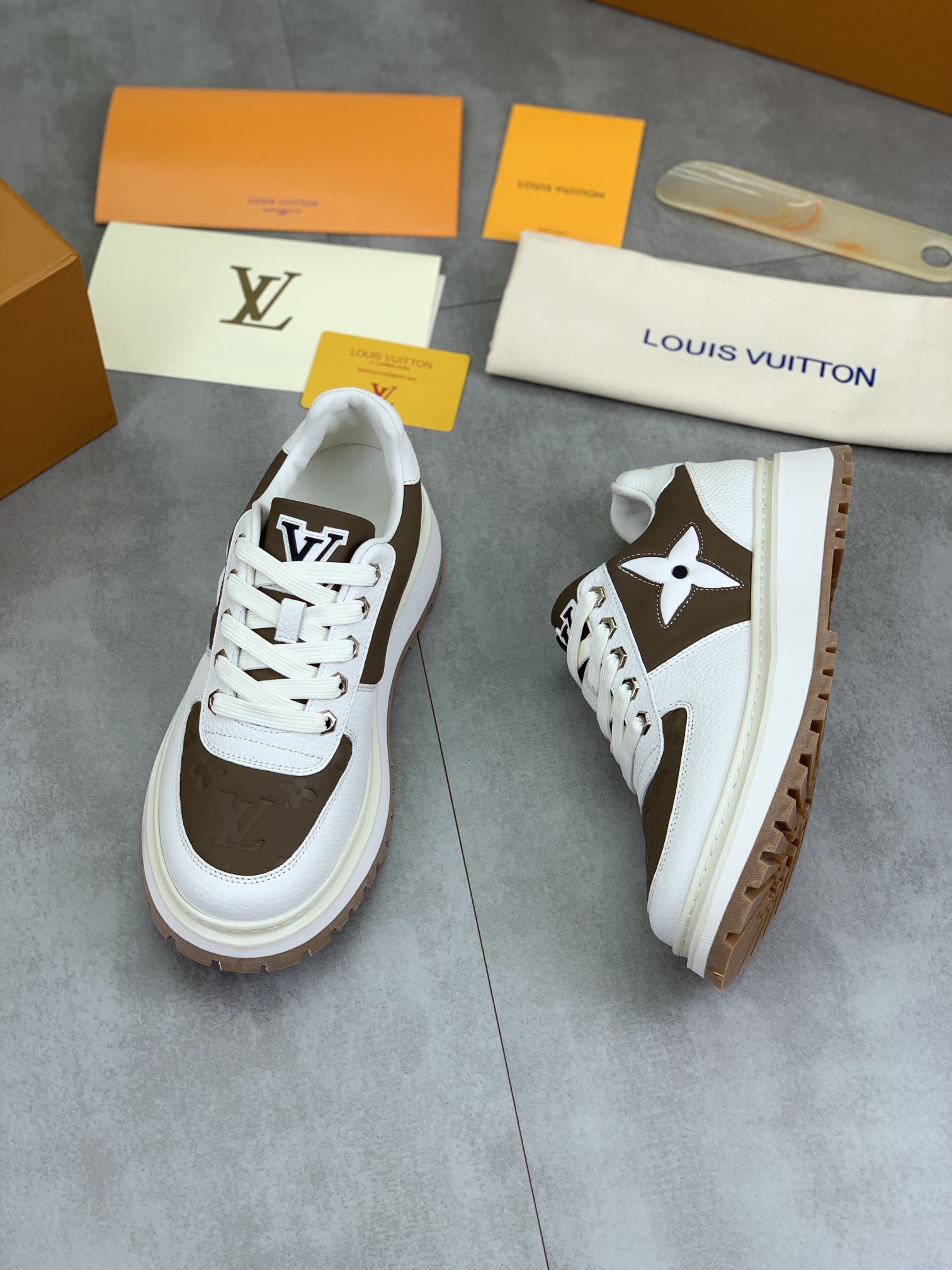 这款鞋子是AAAAA 1:1 质量 (非常棒). 使用了和原版一模一样的材料. 商标部分也保持了和路易威登/Louis Vuitton一样. 图片拍摄是实物鞋子拍摄, 您所收到的实物保证和我们图片一模一样.