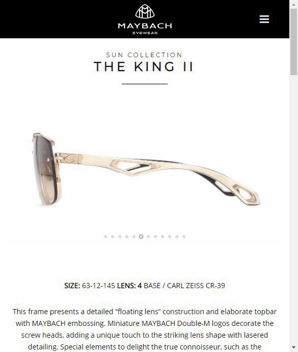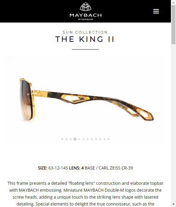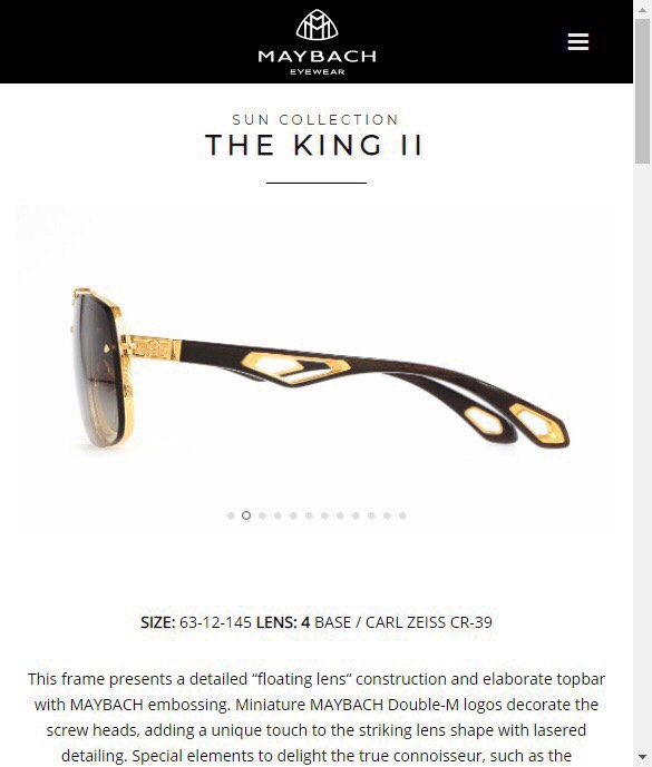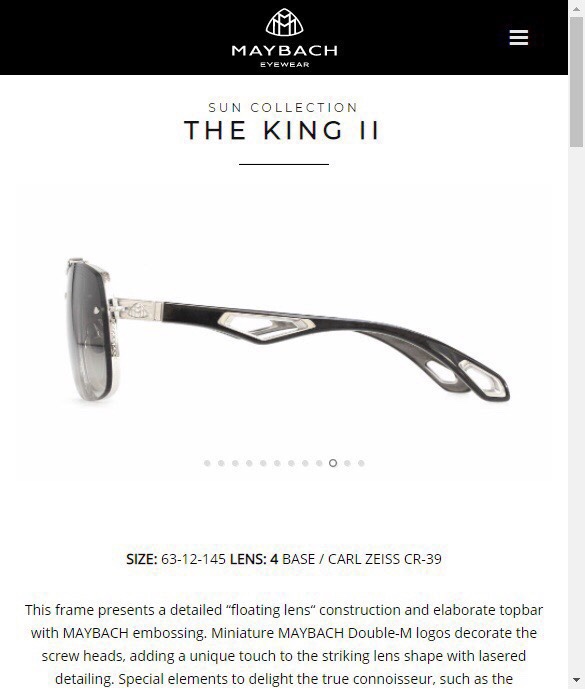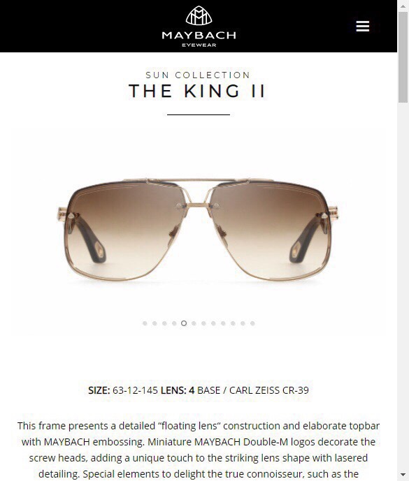 这款太阳眼镜是AAAAA 1:1 质量 (非常棒). 使用了和原版一模一样的材料. 商标部分也保持了和MAYBACH一样. 图片拍摄是实物太阳眼镜拍摄, 您所收到的实物保证和我们图片一模一样.