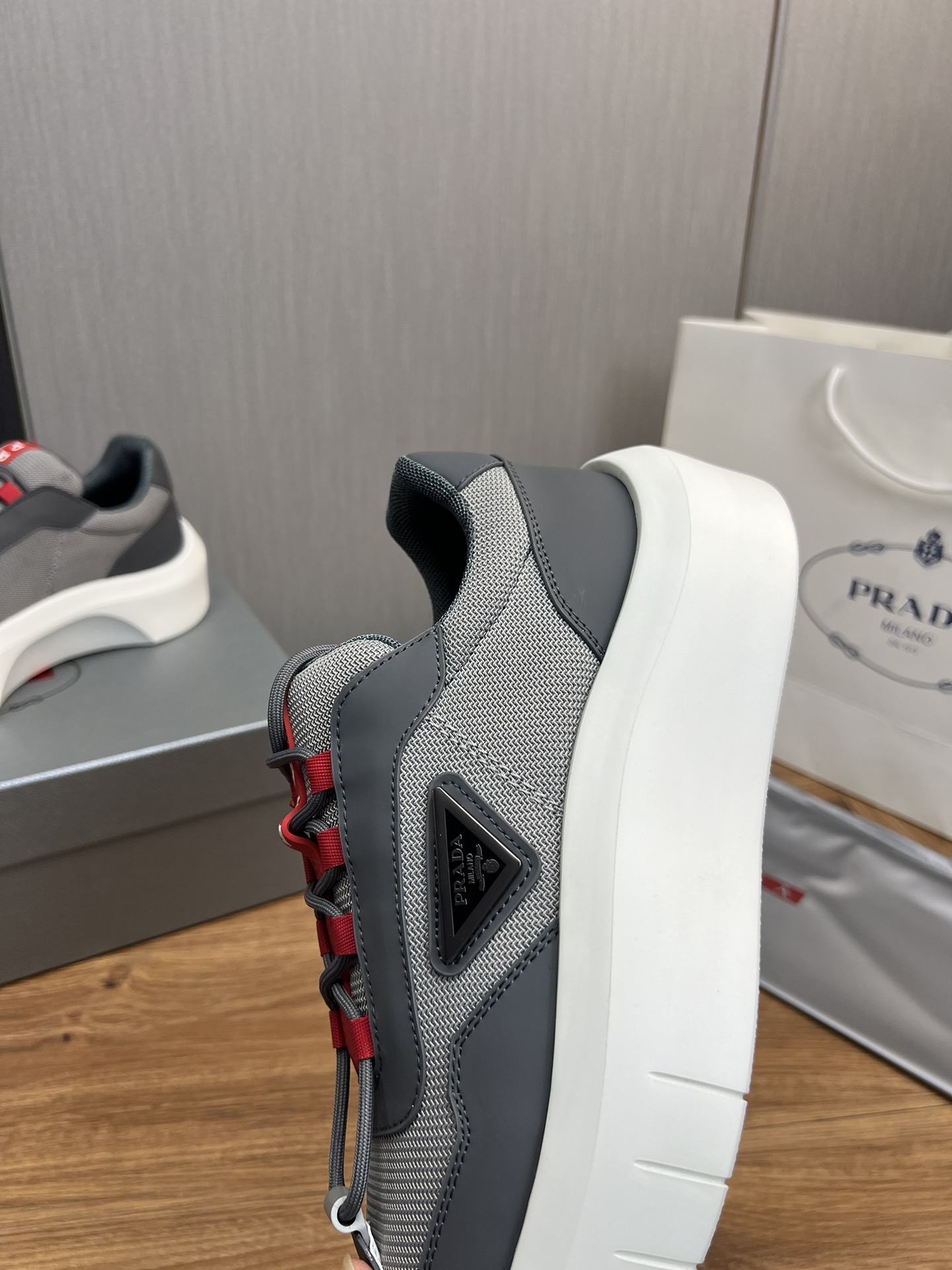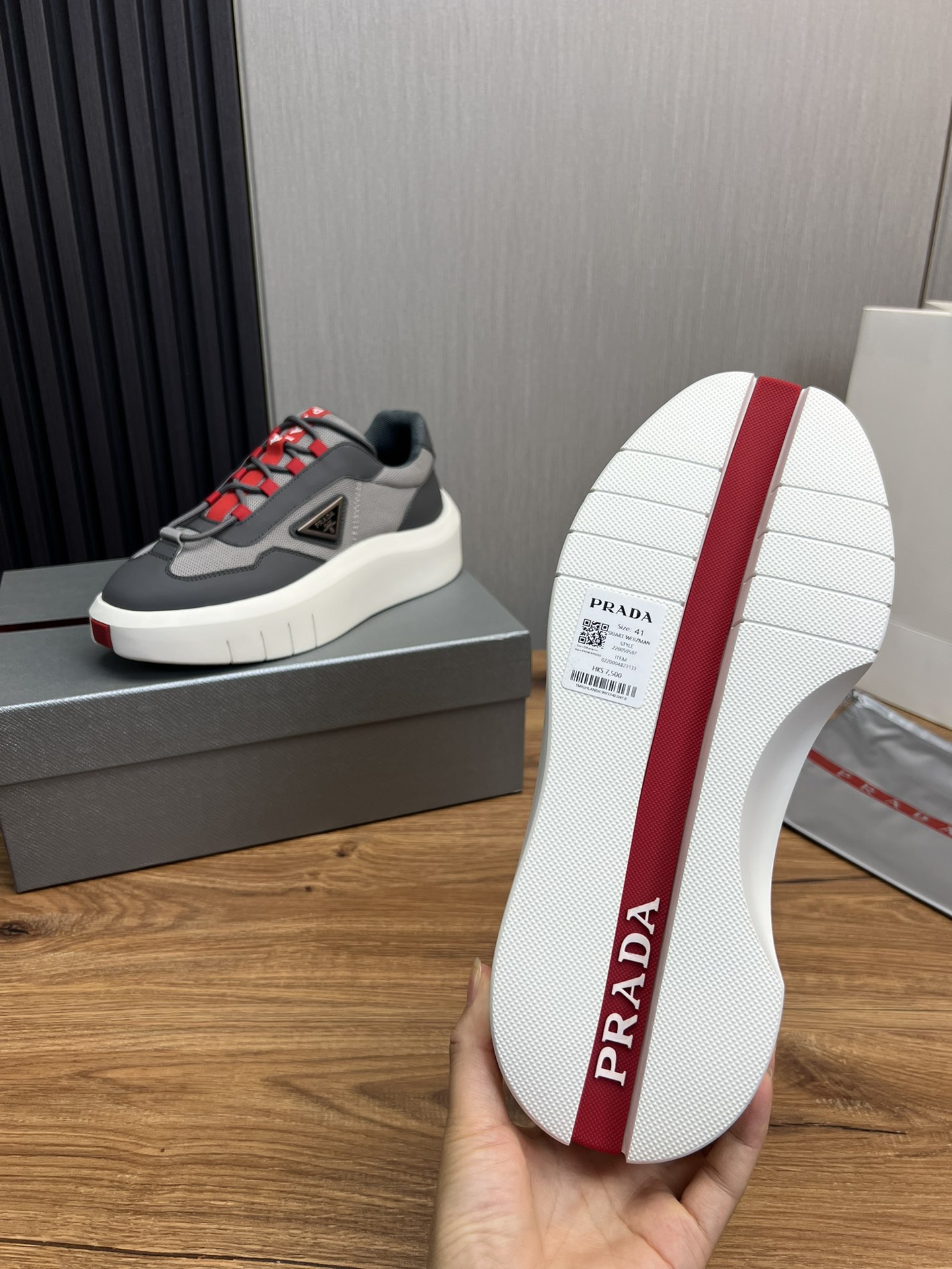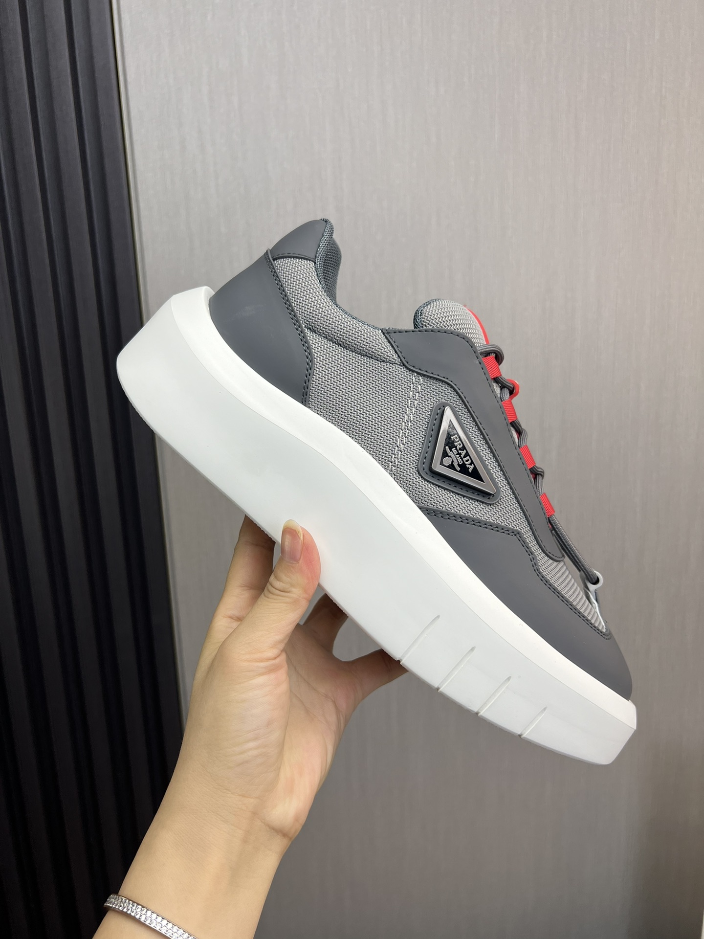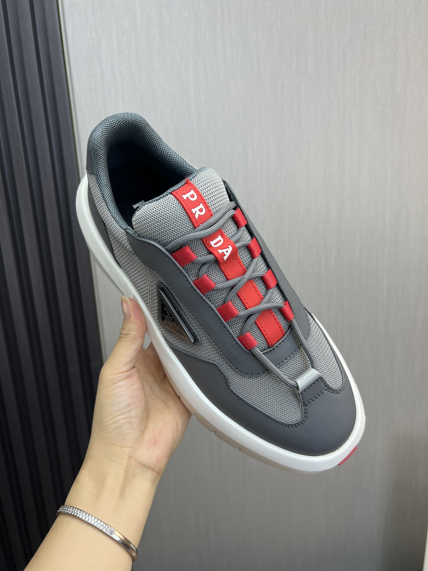 这款鞋子是AAAAA 1:1 质量 (非常棒). 使用了和原版一模一样的材料. 商标部分也保持了和普拉达/Prada一样. 图片拍摄是实物鞋子拍摄, 您所收到的实物保证和我们图片一模一样.