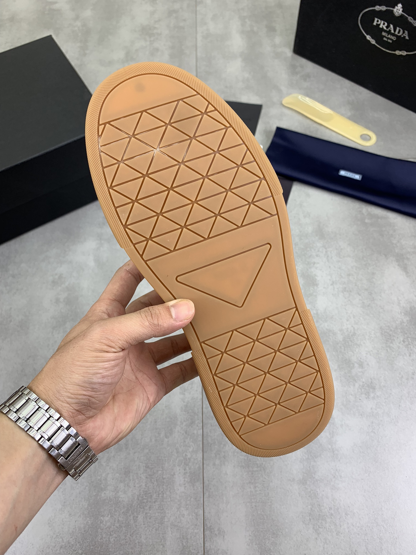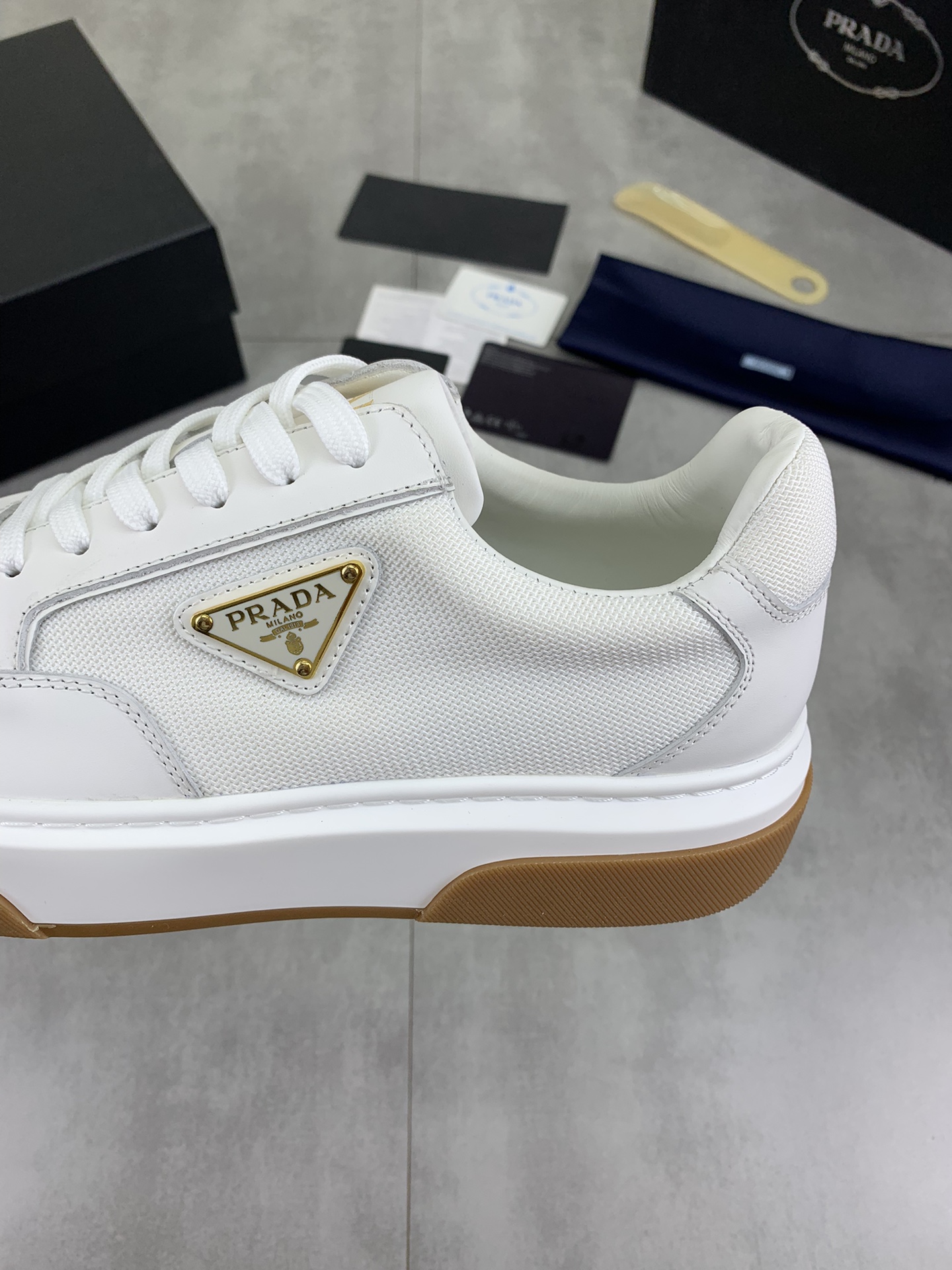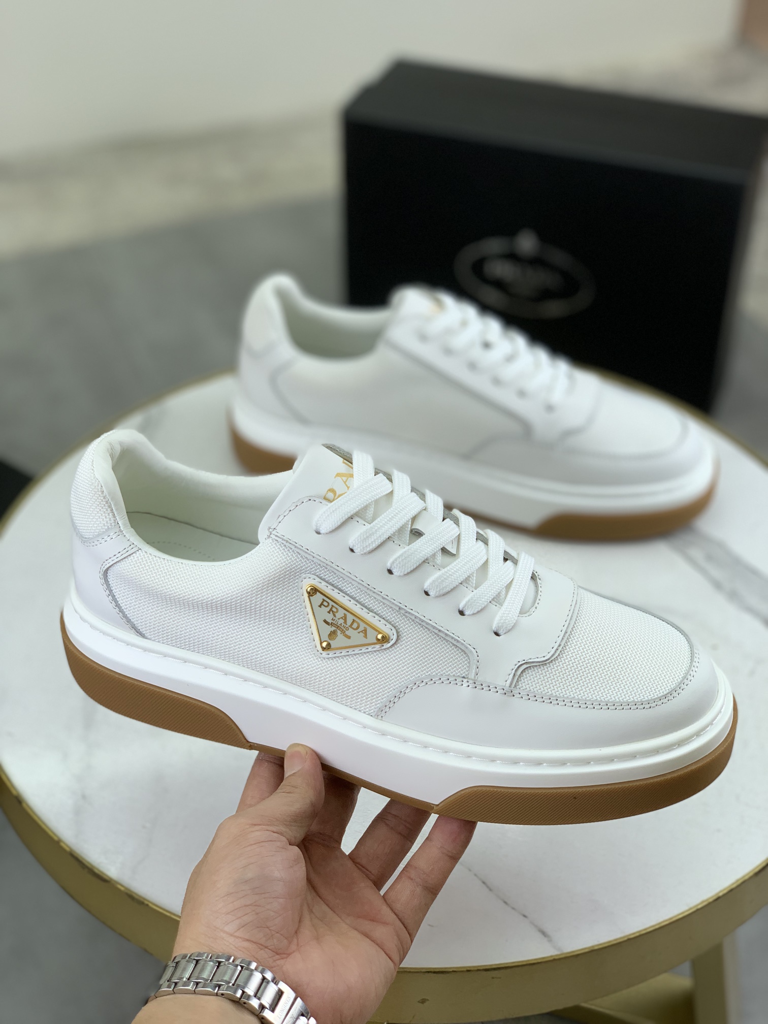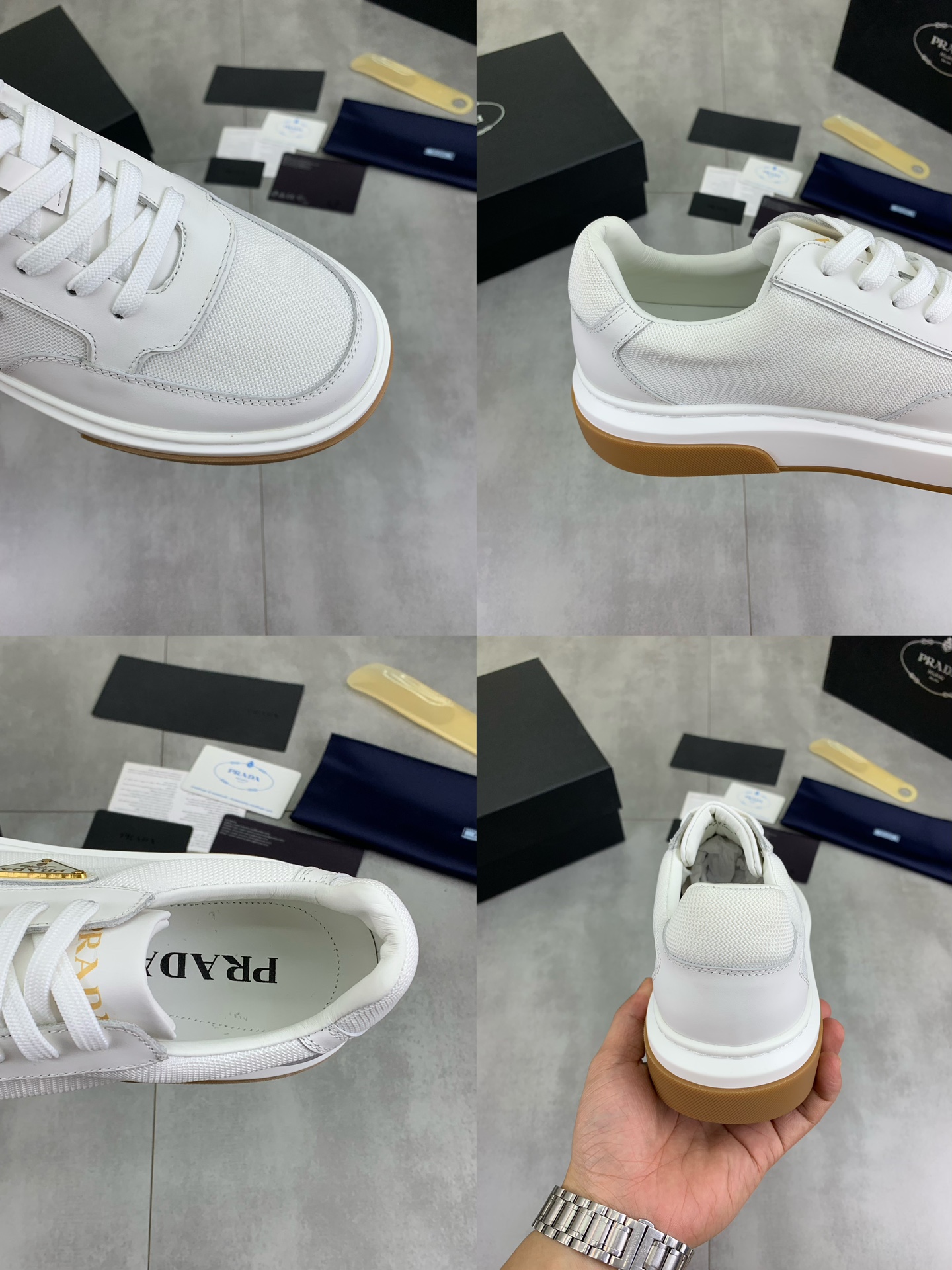 这款鞋子是AAAAA 1:1 质量 (非常棒). 使用了和原版一模一样的材料. 商标部分也保持了和普拉达/Prada一样. 图片拍摄是实物鞋子拍摄, 您所收到的实物保证和我们图片一模一样.