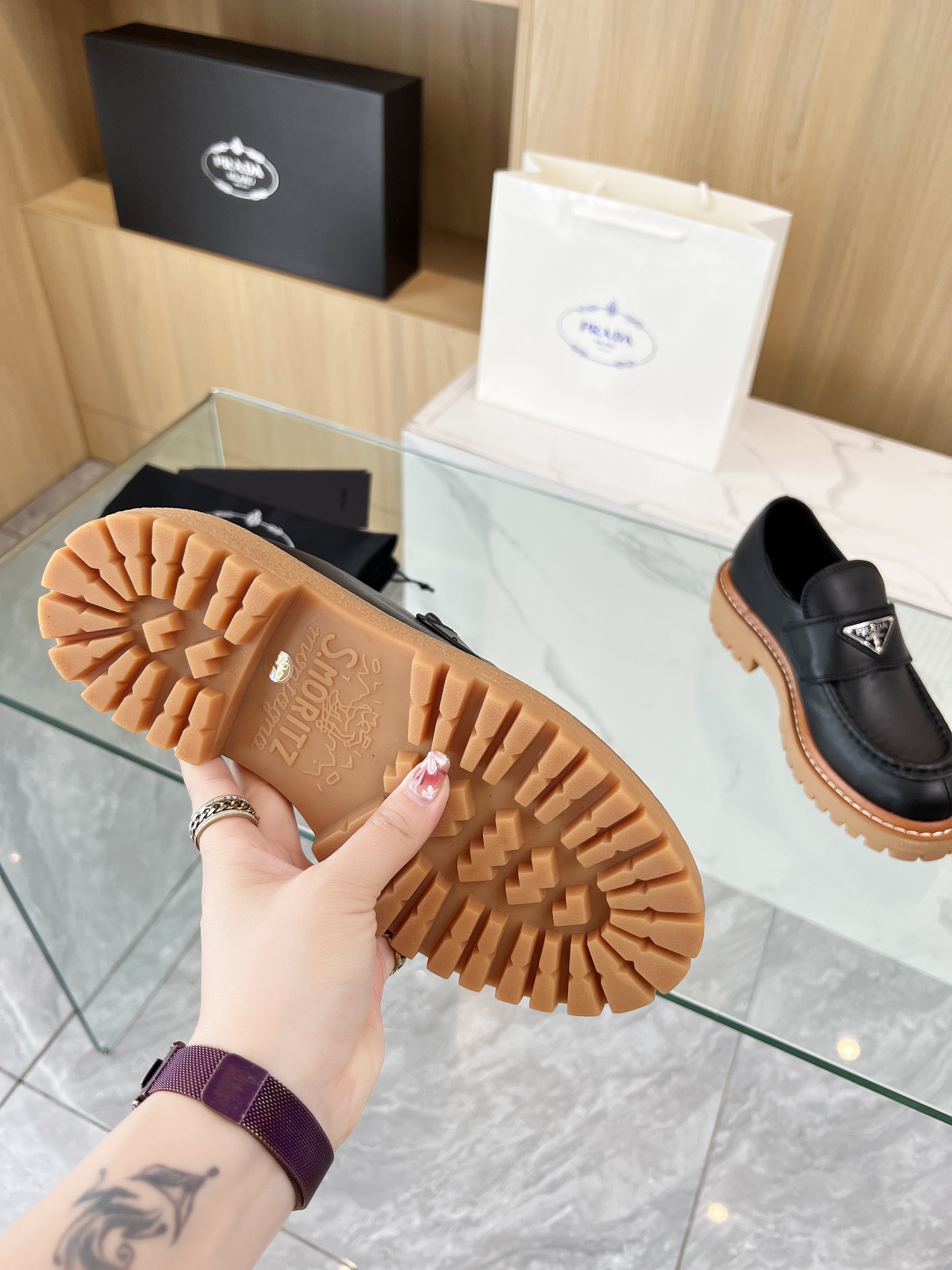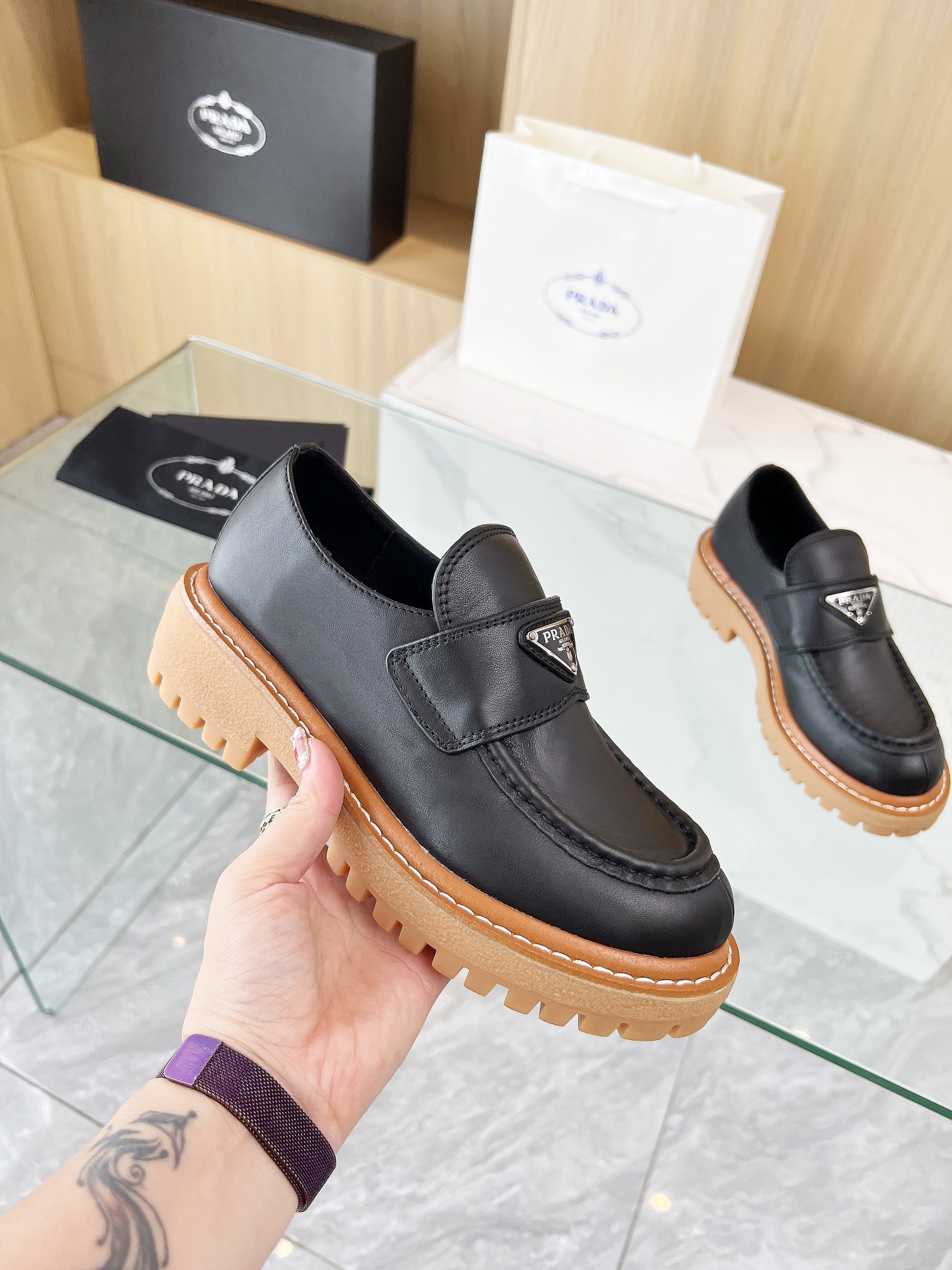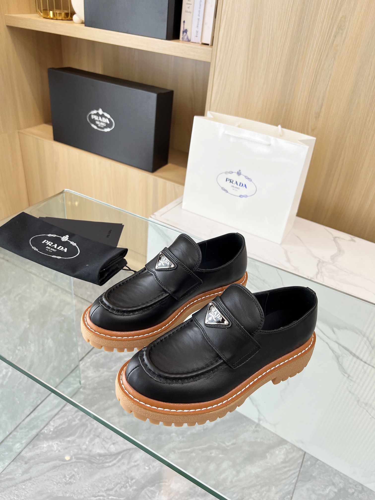 这款鞋子是AAAAA 1:1 质量 (非常棒). 使用了和原版一模一样的材料. 商标部分也保持了和普拉达/Prada一样. 图片拍摄是实物鞋子拍摄, 您所收到的实物保证和我们图片一模一样.