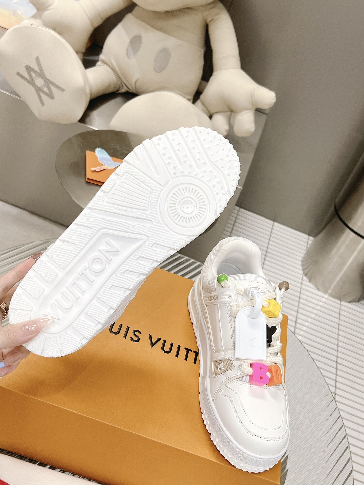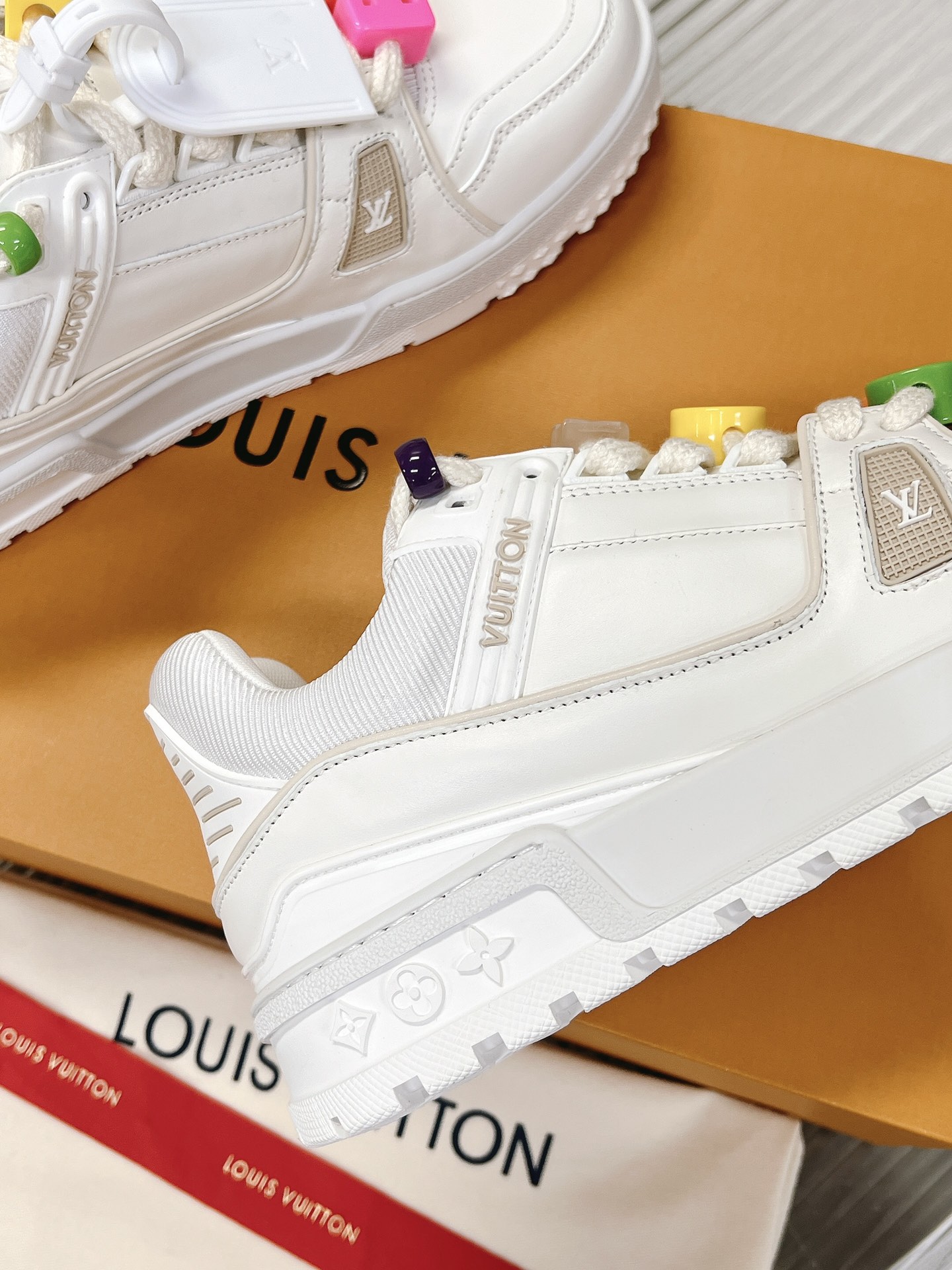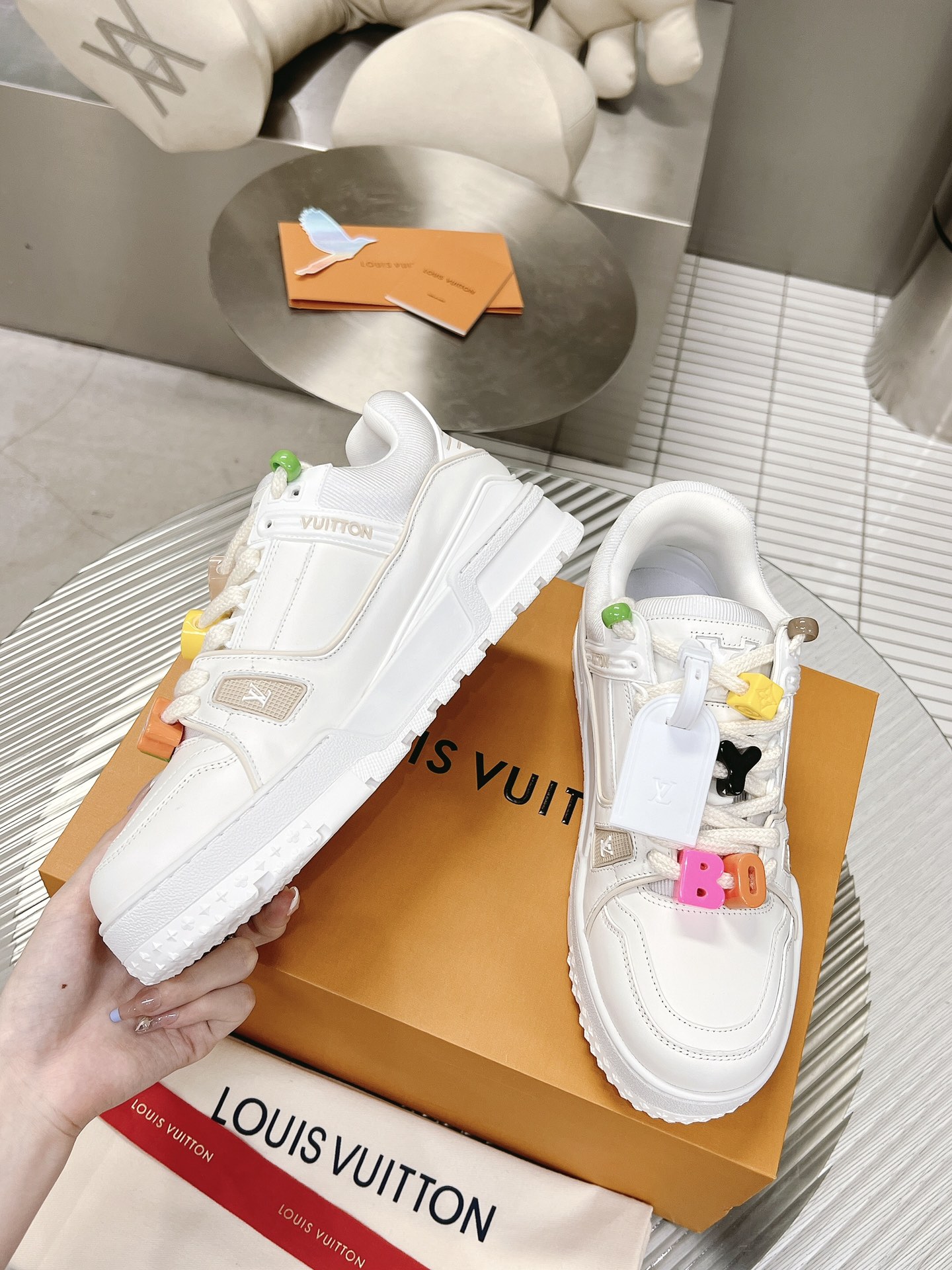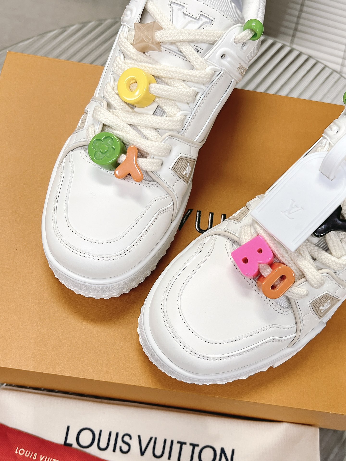 这款鞋子是AAAAA 1:1 质量 (非常棒). 使用了和原版一模一样的材料. 商标部分也保持了和路易威登/Louis Vuitton一样. 图片拍摄是实物鞋子拍摄, 您所收到的实物保证和我们图片一模一样.