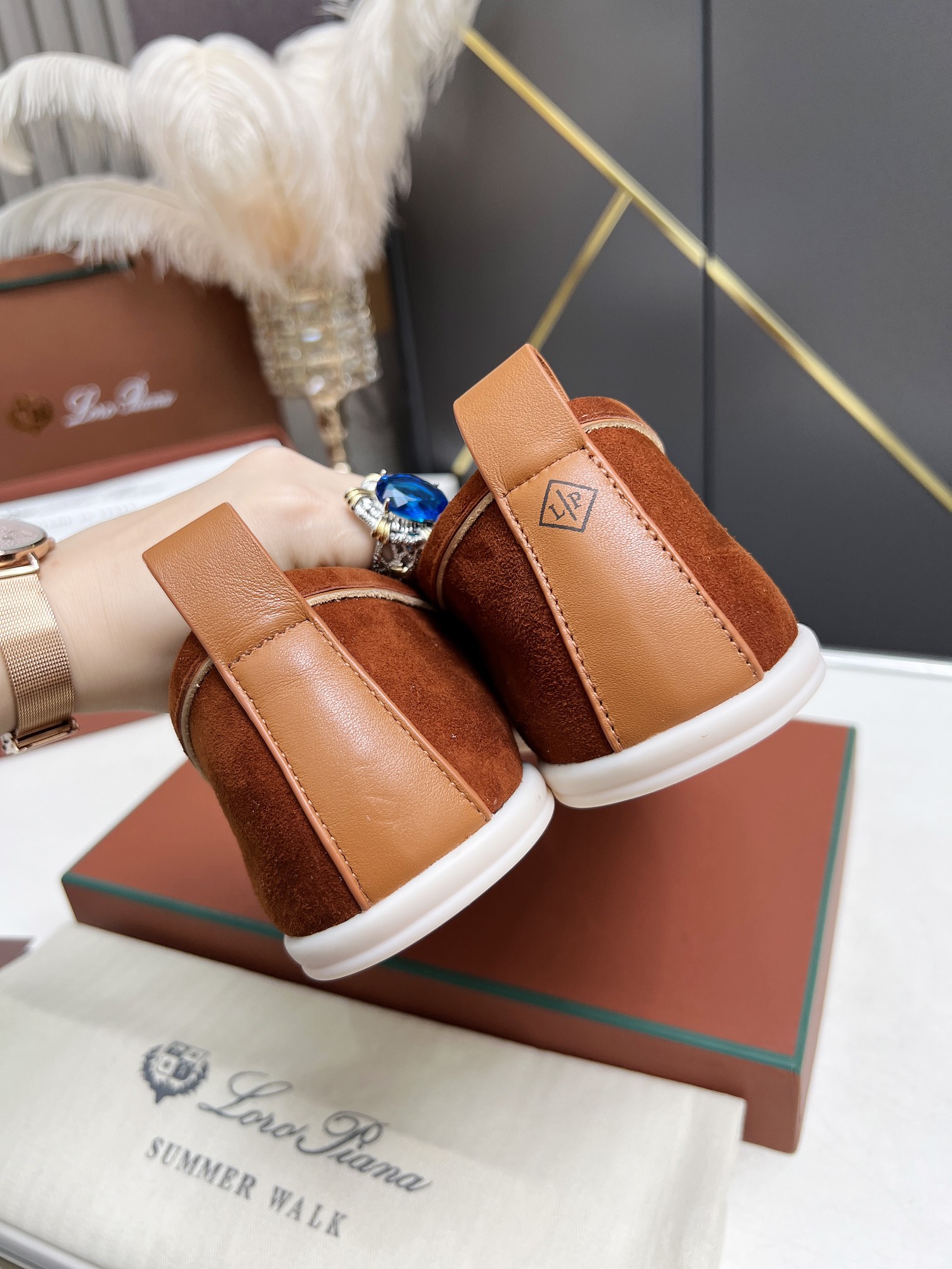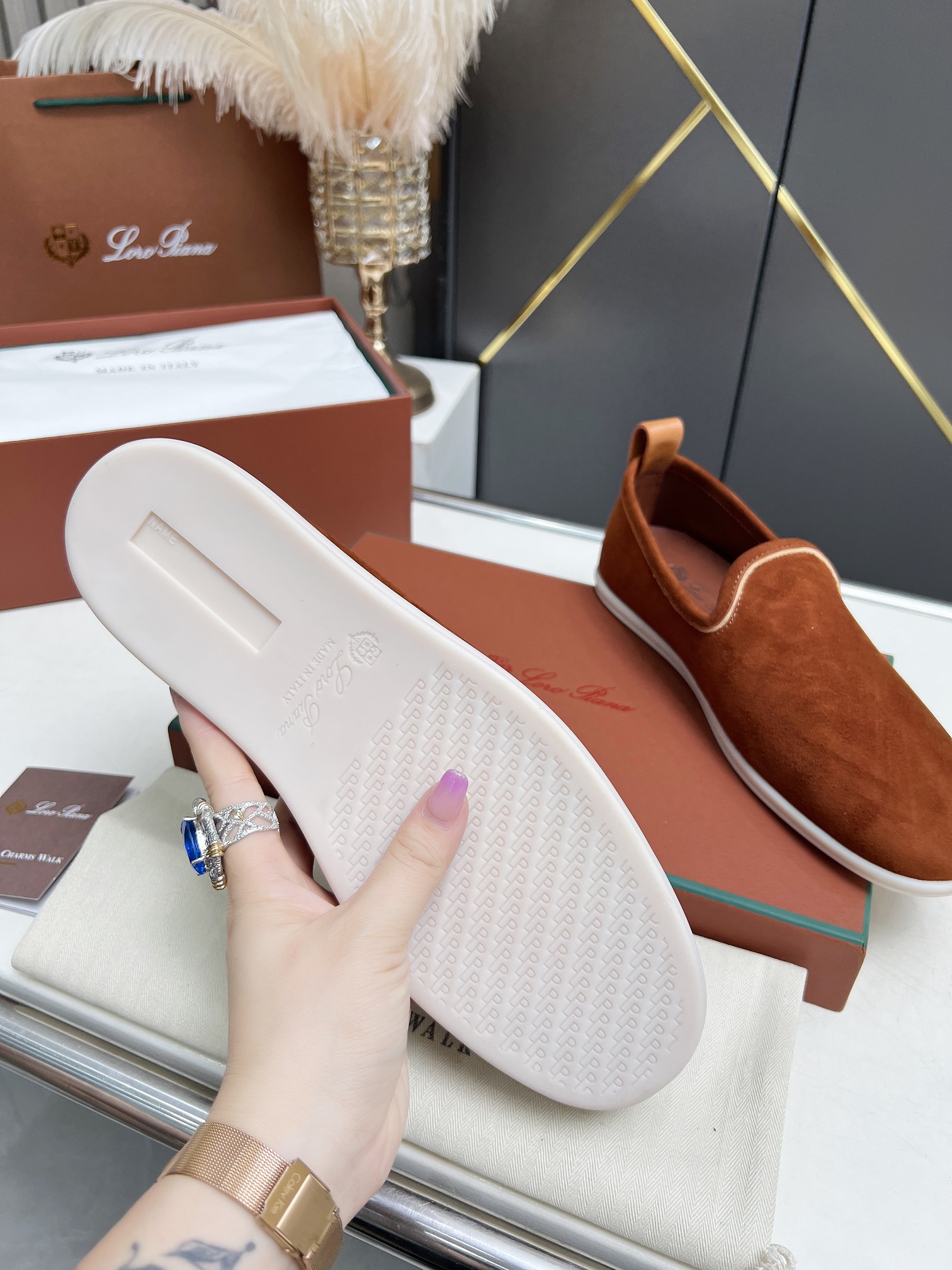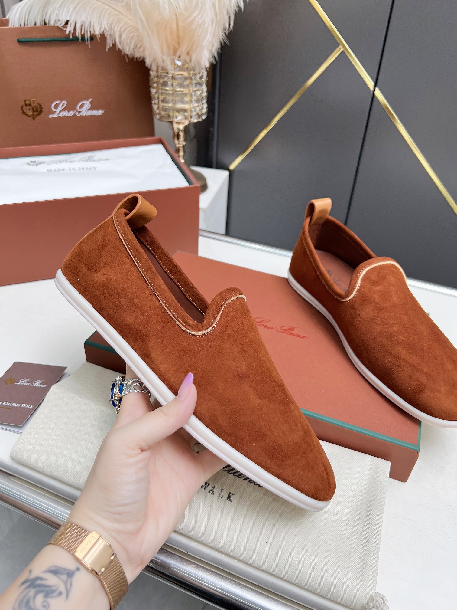 这款鞋子是AAAAA 1:1 质量 (非常棒). 使用了和原版一模一样的材料. 商标部分也保持了和洛罗皮亚纳/Loro Piana一样. 图片拍摄是实物鞋子拍摄, 您所收到的实物保证和我们图片一模一样.