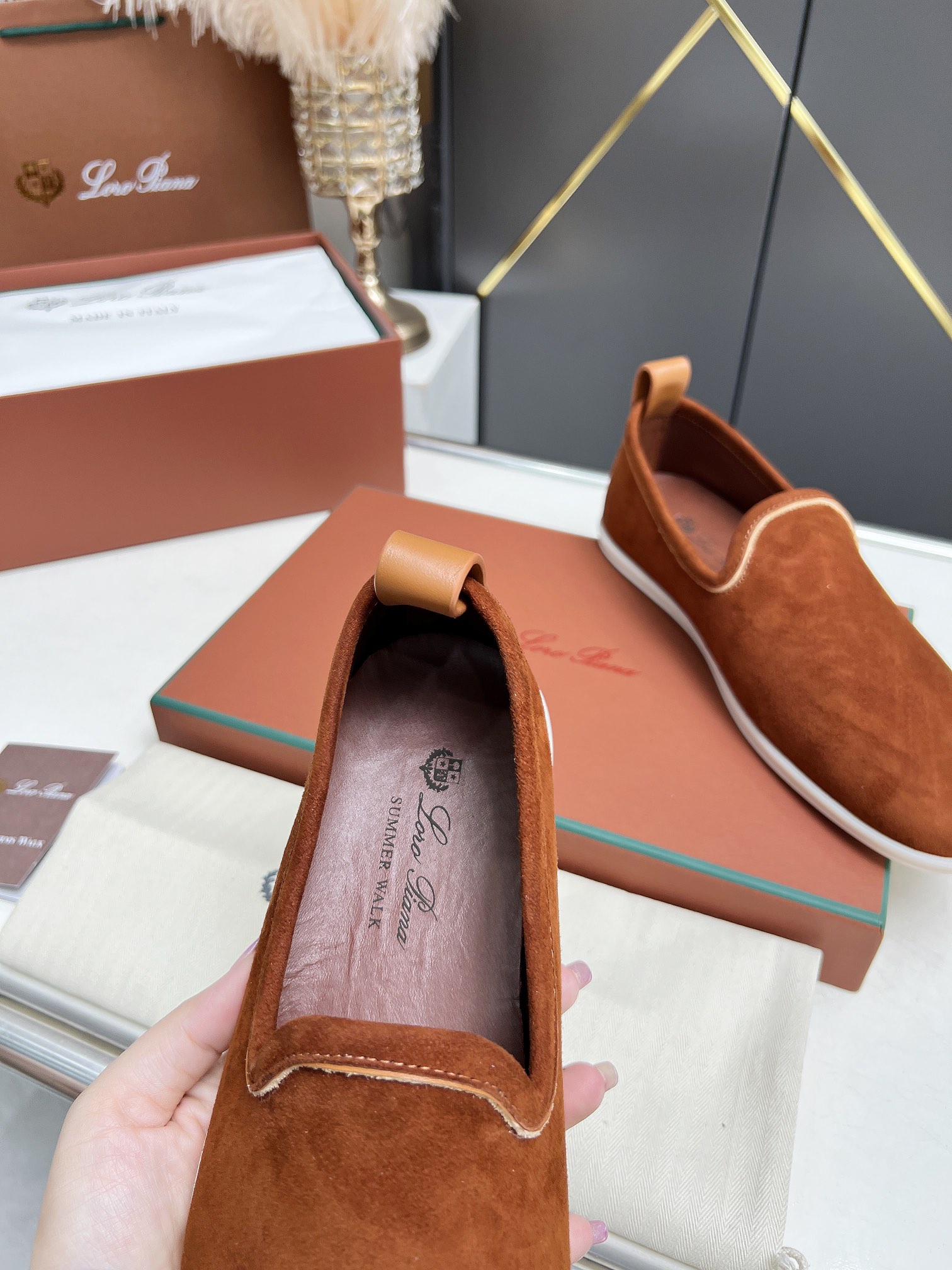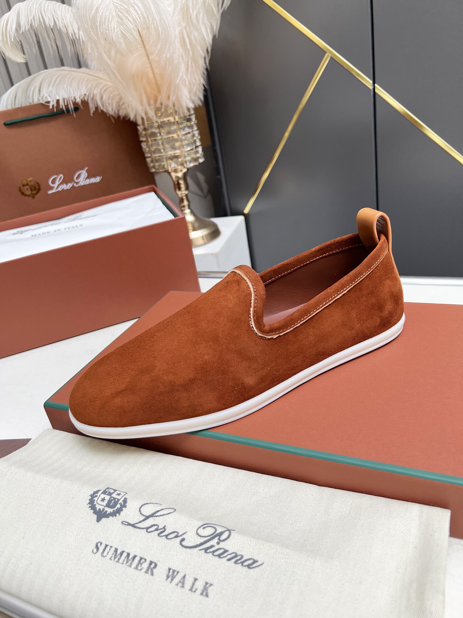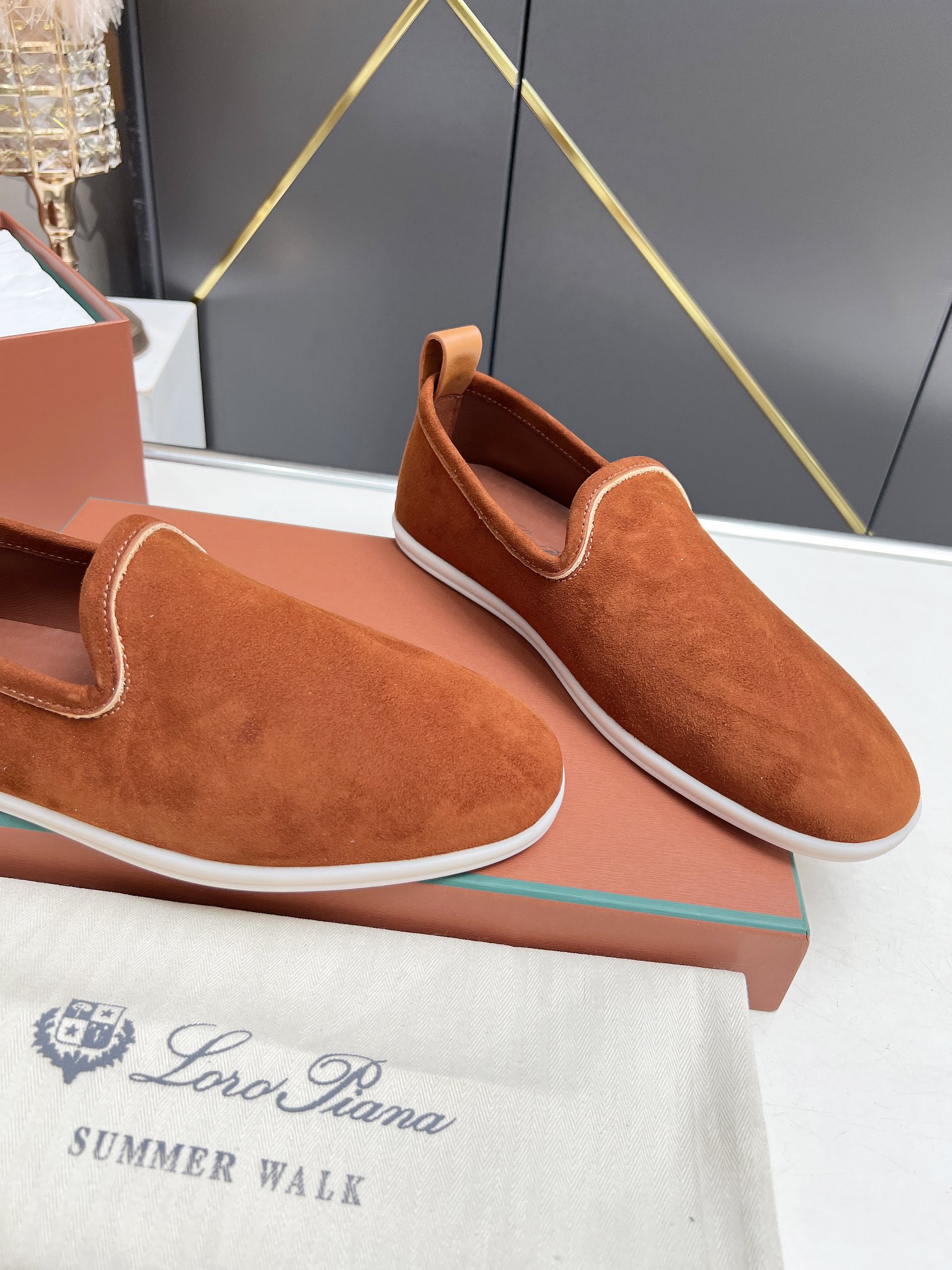 这款鞋子是AAAAA 1:1 质量 (非常棒). 使用了和原版一模一样的材料. 商标部分也保持了和洛罗皮亚纳/Loro Piana一样. 图片拍摄是实物鞋子拍摄, 您所收到的实物保证和我们图片一模一样.