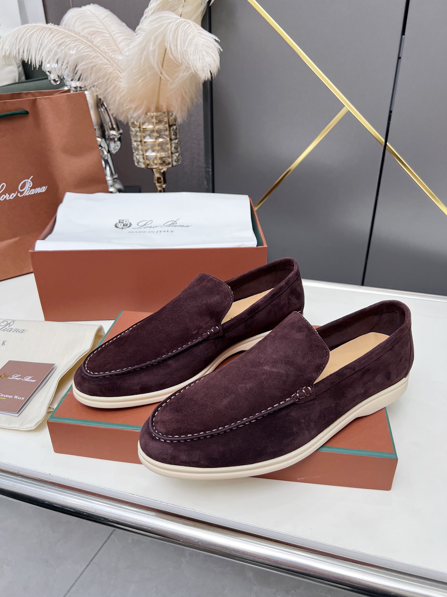 这款鞋子是AAAAA 1:1 质量 (非常棒). 使用了和原版一模一样的材料. 商标部分也保持了和洛罗皮亚纳/Loro Piana一样. 图片拍摄是实物鞋子拍摄, 您所收到的实物保证和我们图片一模一样.