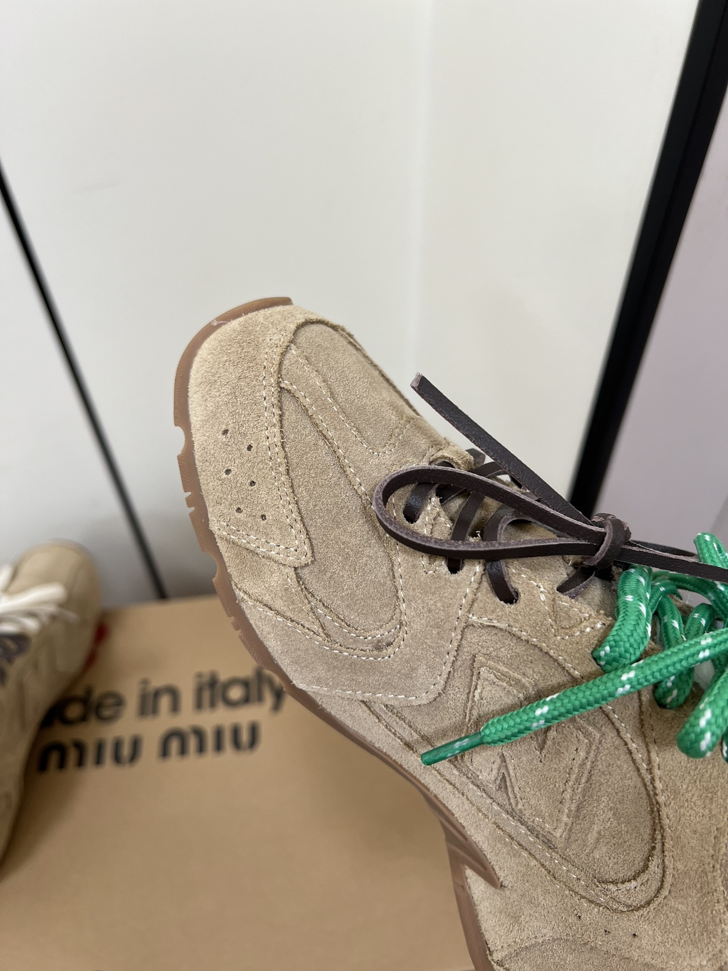 这款鞋子是AAAAA 1:1 质量 (非常棒). 使用了和原版一模一样的材料. 商标部分也保持了和缪缪/Miu Miu一样. 图片拍摄是实物鞋子拍摄, 您所收到的实物保证和我们图片一模一样.
