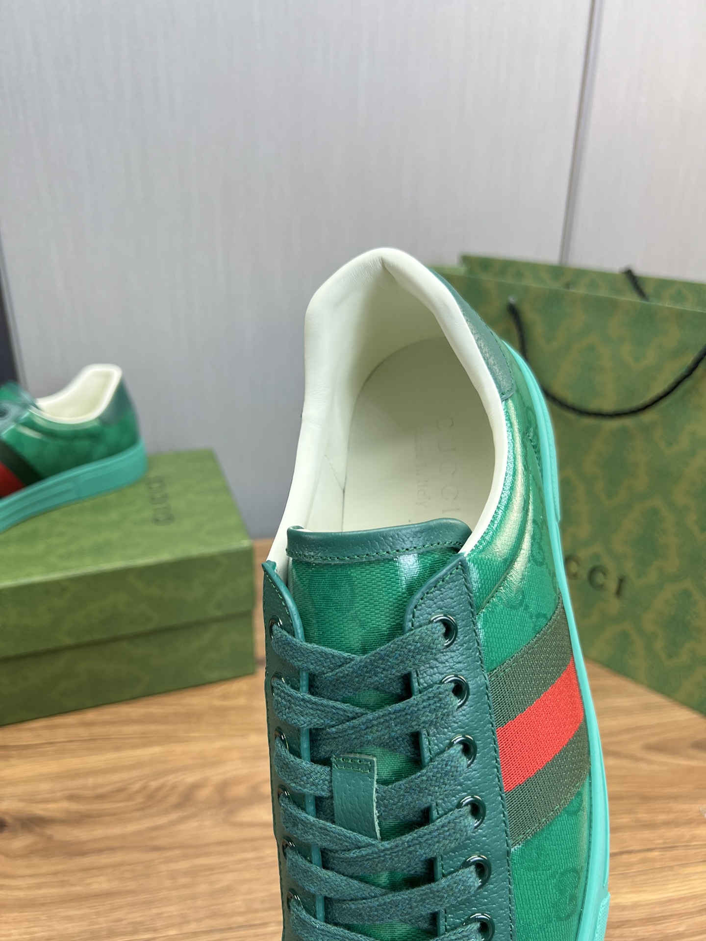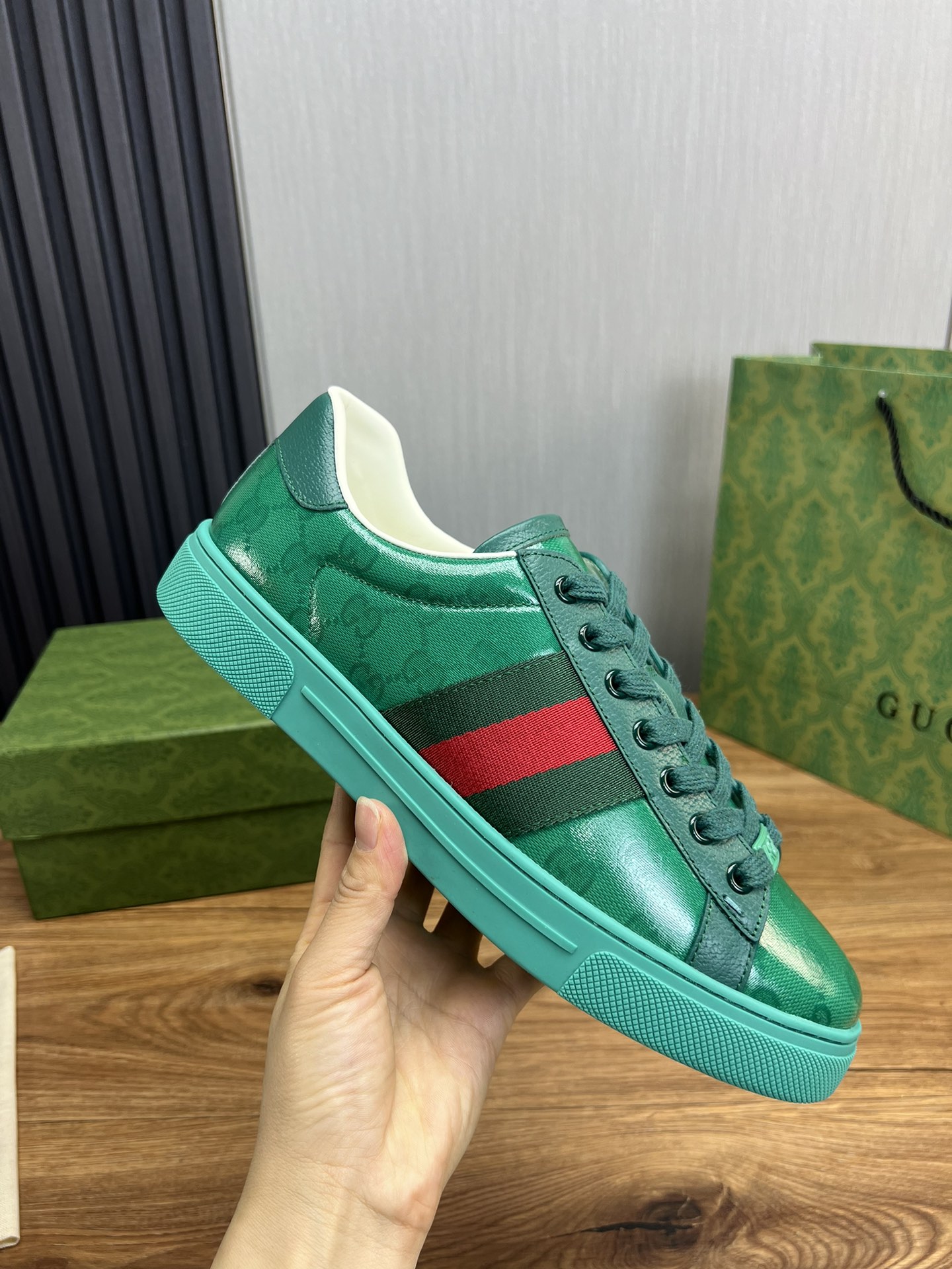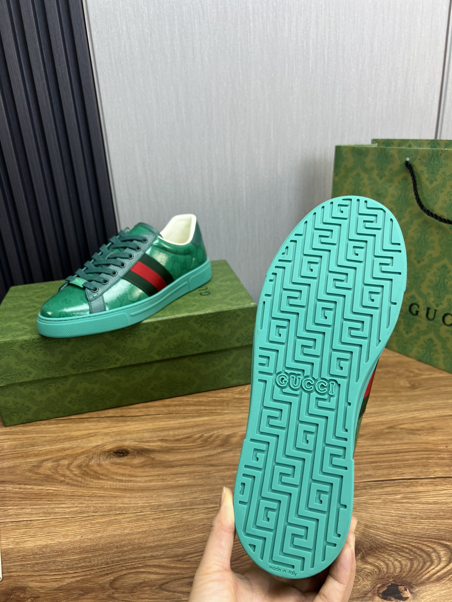 这款鞋子是AAAAA 1:1 质量 (非常棒). 使用了和原版一模一样的材料. 商标部分也保持了和古奇/Gucci一样. 图片拍摄是实物鞋子拍摄, 您所收到的实物保证和我们图片一模一样.