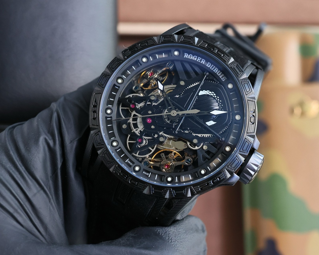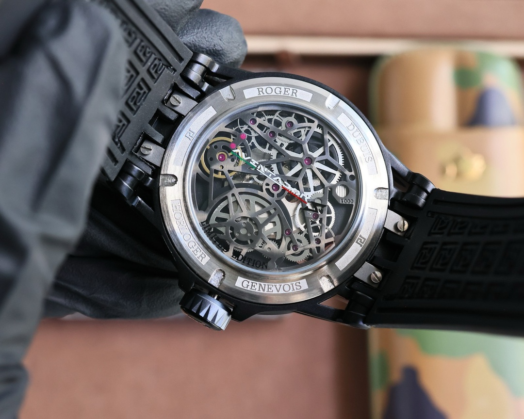 这款手表是AAAAA 1:1 质量 (非常棒). 使用了和原版一模一样的材料. 商标部分也保持了和Roger Dubuis一样. 图片拍摄是实物手表拍摄, 您所收到的实物保证和我们图片一模一样.