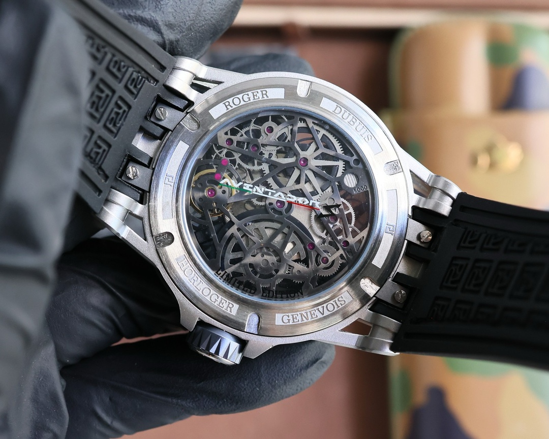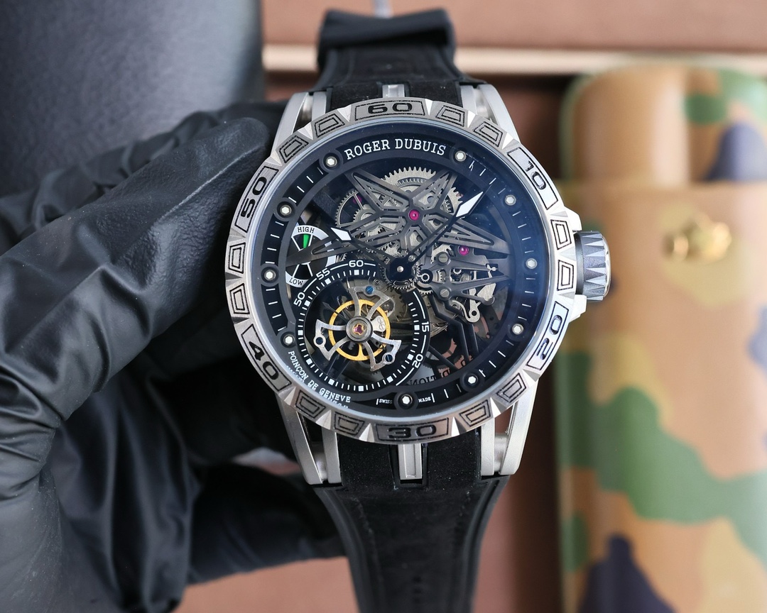 这款手表是AAAAA 1:1 质量 (非常棒). 使用了和原版一模一样的材料. 商标部分也保持了和Roger Dubuis一样. 图片拍摄是实物手表拍摄, 您所收到的实物保证和我们图片一模一样.