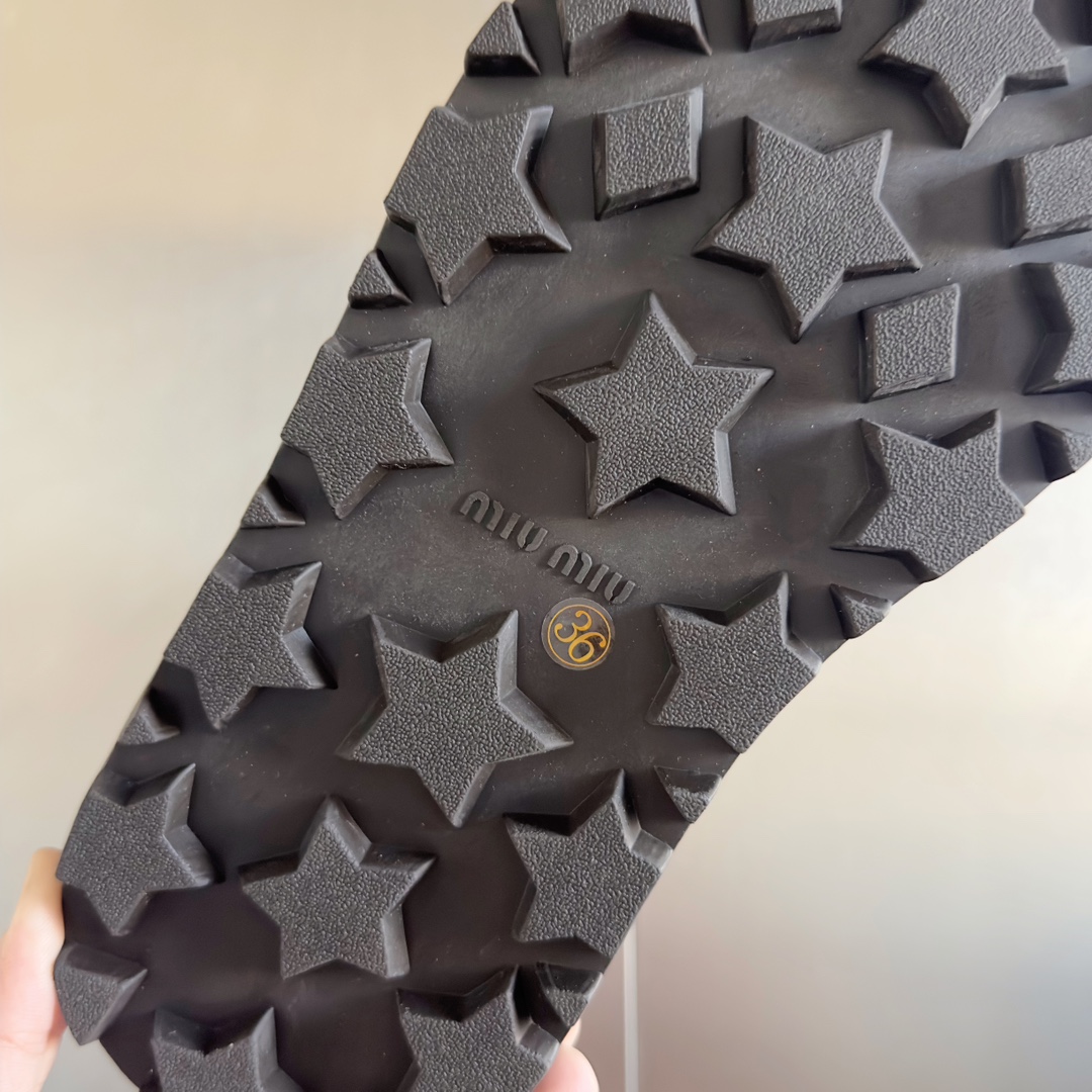 这款鞋子是AAAAA 1:1 质量 (非常棒). 使用了和原版一模一样的材料. 商标部分也保持了和缪缪/Miu Miu一样. 图片拍摄是实物鞋子拍摄, 您所收到的实物保证和我们图片一模一样.