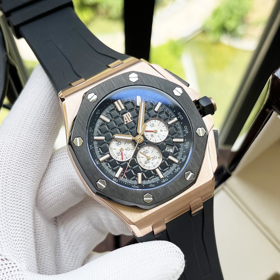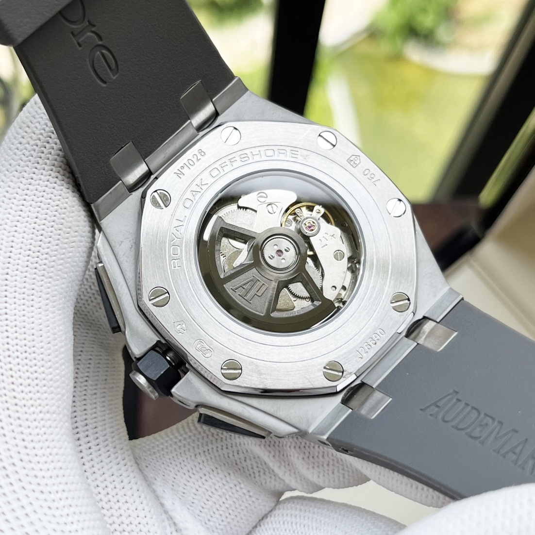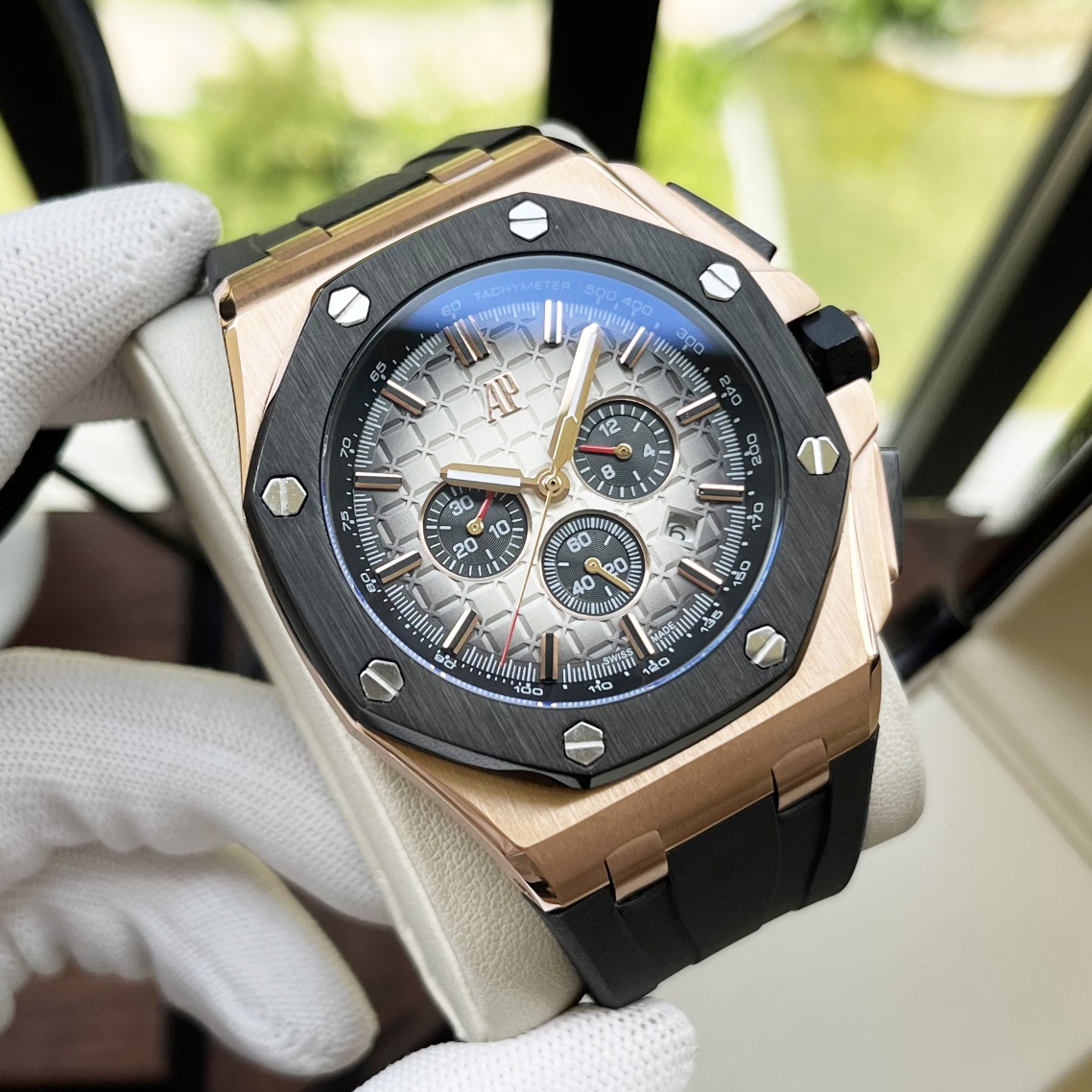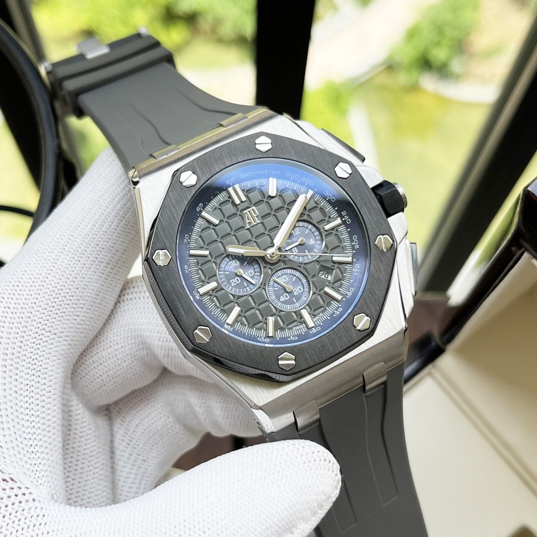 这款手表是AAAAA 1:1 质量 (非常棒). 使用了和原版一模一样的材料. 商标部分也保持了和爱彼/Audemars Piguet一样. 图片拍摄是实物手表拍摄, 您所收到的实物保证和我们图片一模一样.