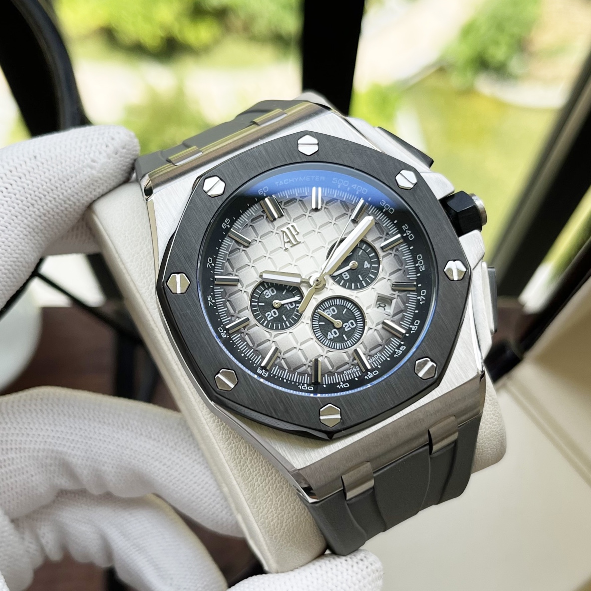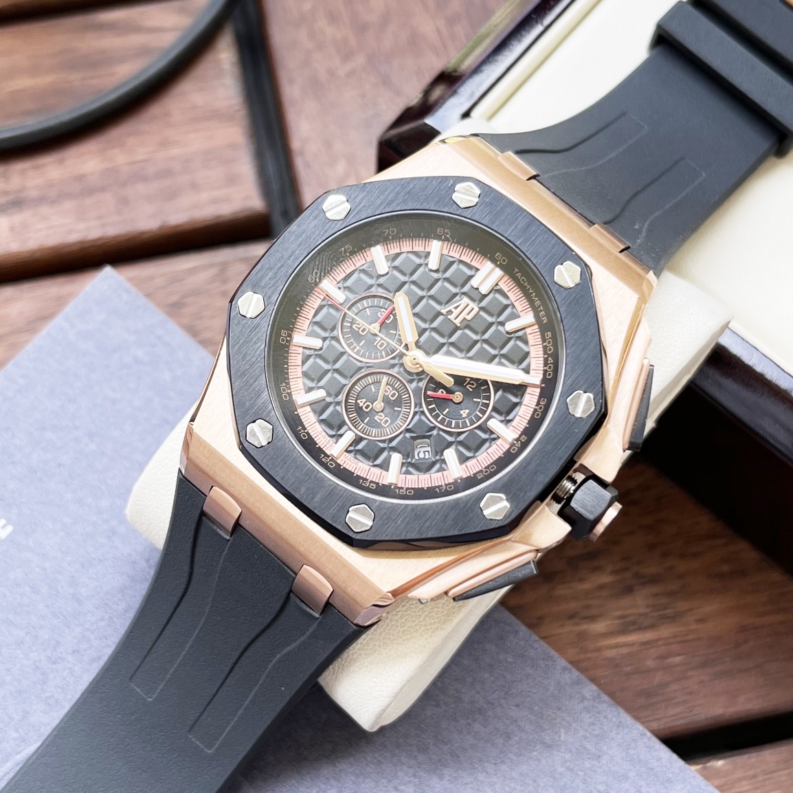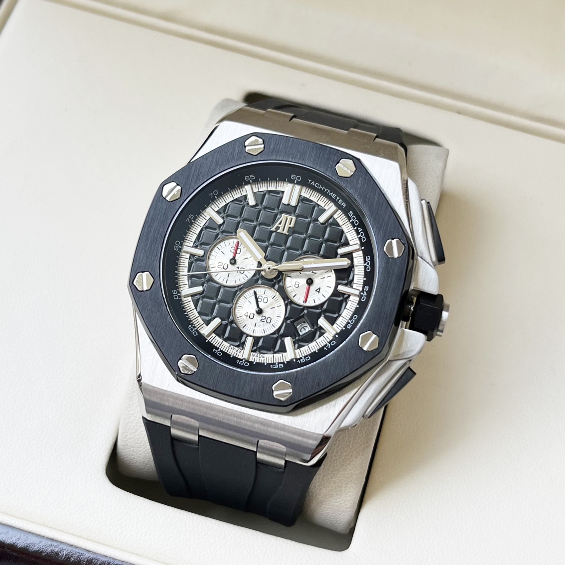 这款手表是AAAAA 1:1 质量 (非常棒). 使用了和原版一模一样的材料. 商标部分也保持了和爱彼/Audemars Piguet一样. 图片拍摄是实物手表拍摄, 您所收到的实物保证和我们图片一模一样.