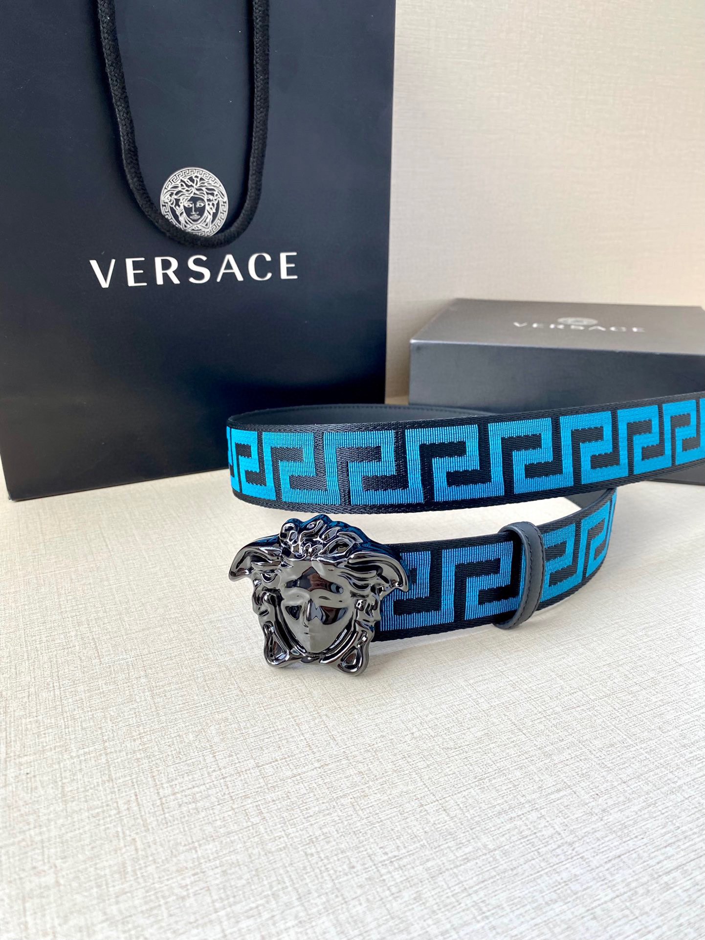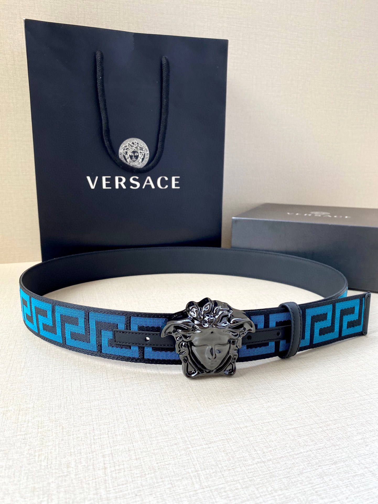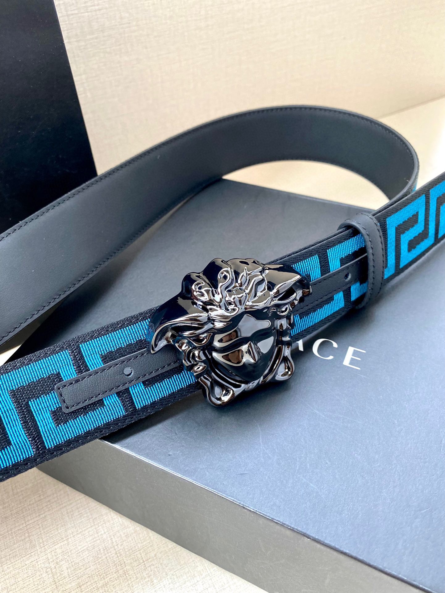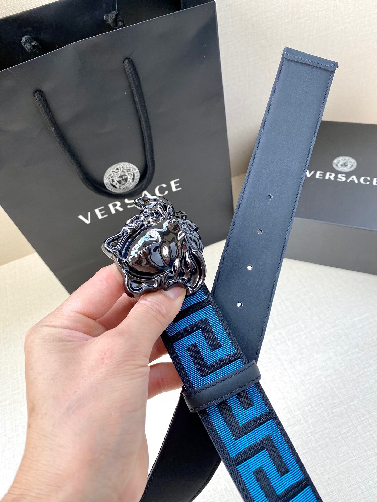 这款皮带是AAAAA 1:1 质量 (非常棒). 使用了和原版一模一样的材料. 商标部分也保持了和范思哲/Versace一样. 图片拍摄是实物皮带拍摄, 您所收到的实物保证和我们图片一模一样.