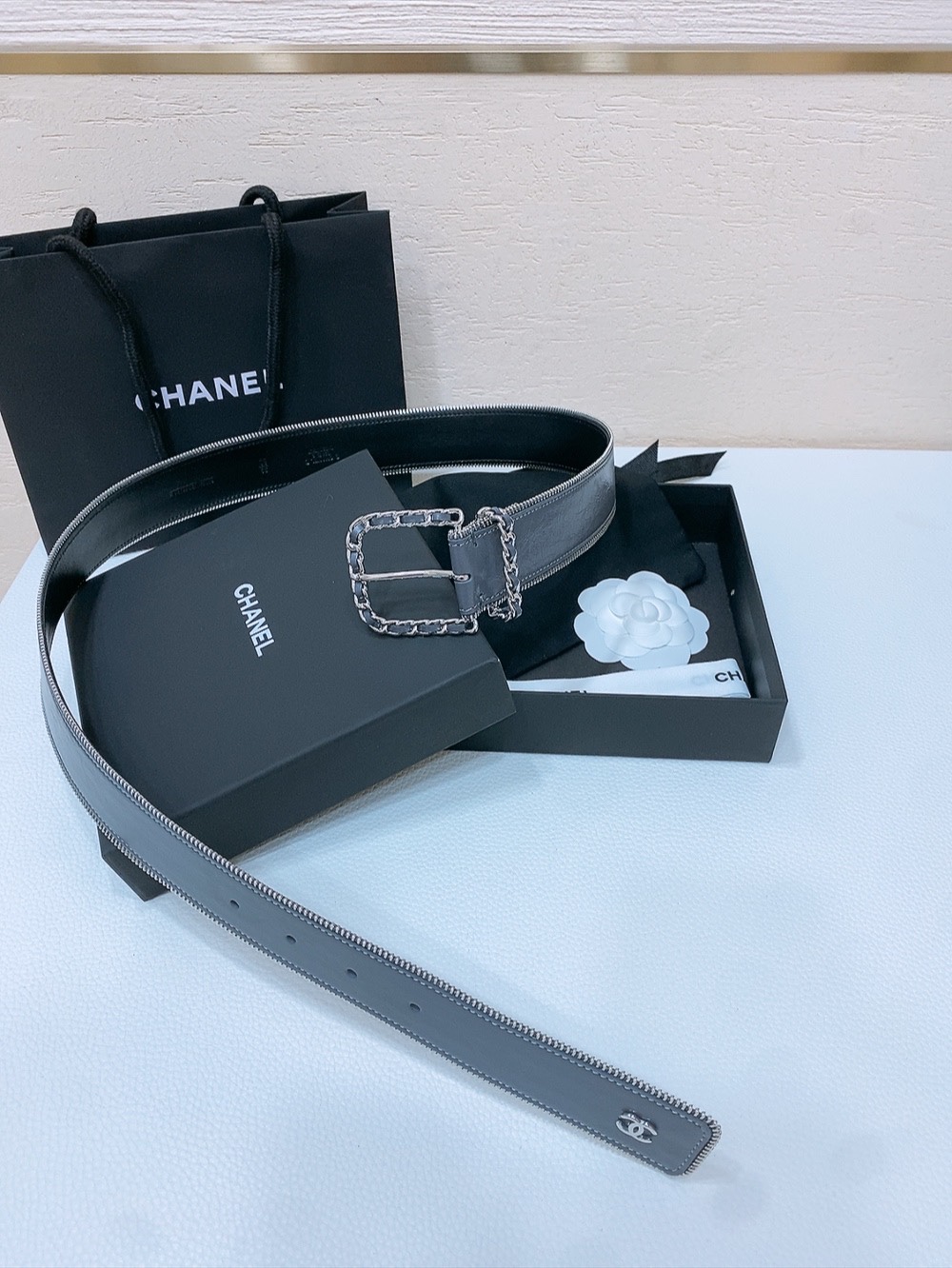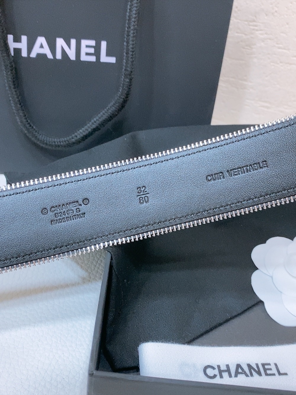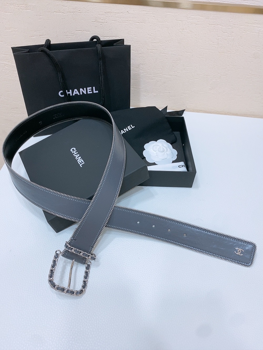 这款皮带是AAAAA 1:1 质量 (非常棒). 使用了和原版一模一样的材料. 商标部分也保持了和香奈儿/Chanel一样. 图片拍摄是实物皮带拍摄, 您所收到的实物保证和我们图片一模一样.