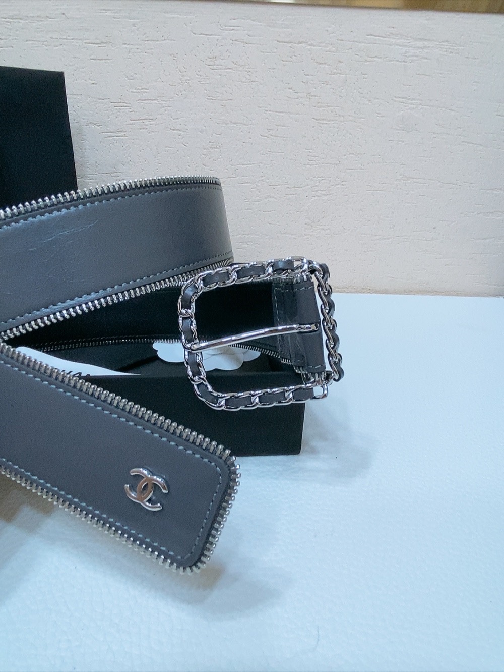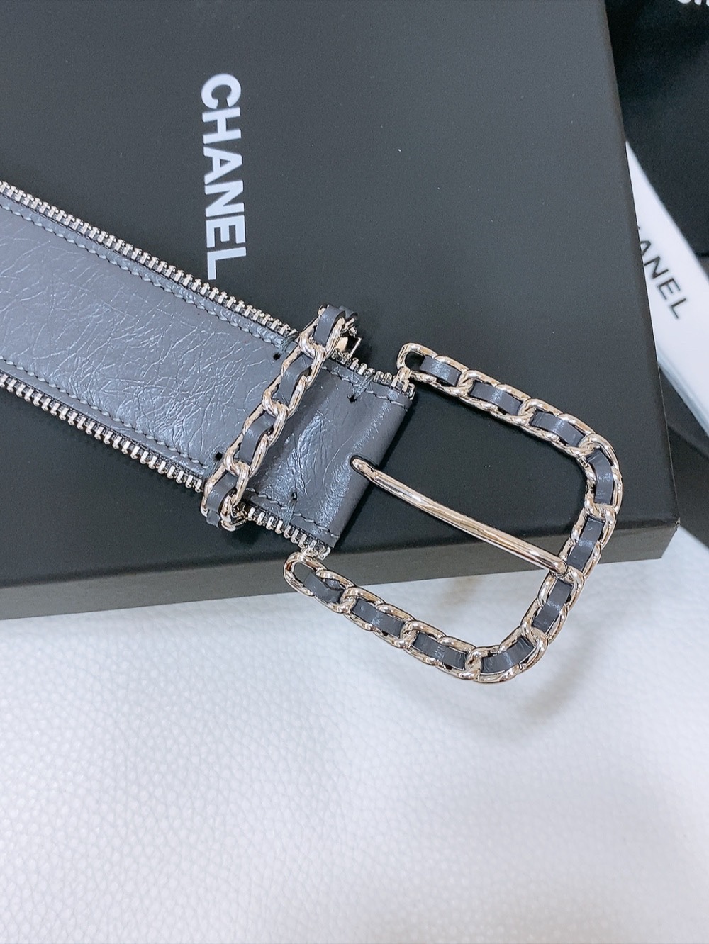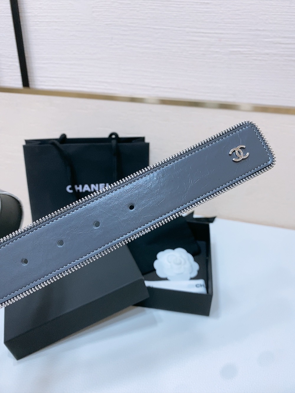这款皮带是AAAAA 1:1 质量 (非常棒). 使用了和原版一模一样的材料. 商标部分也保持了和香奈儿/Chanel一样. 图片拍摄是实物皮带拍摄, 您所收到的实物保证和我们图片一模一样.