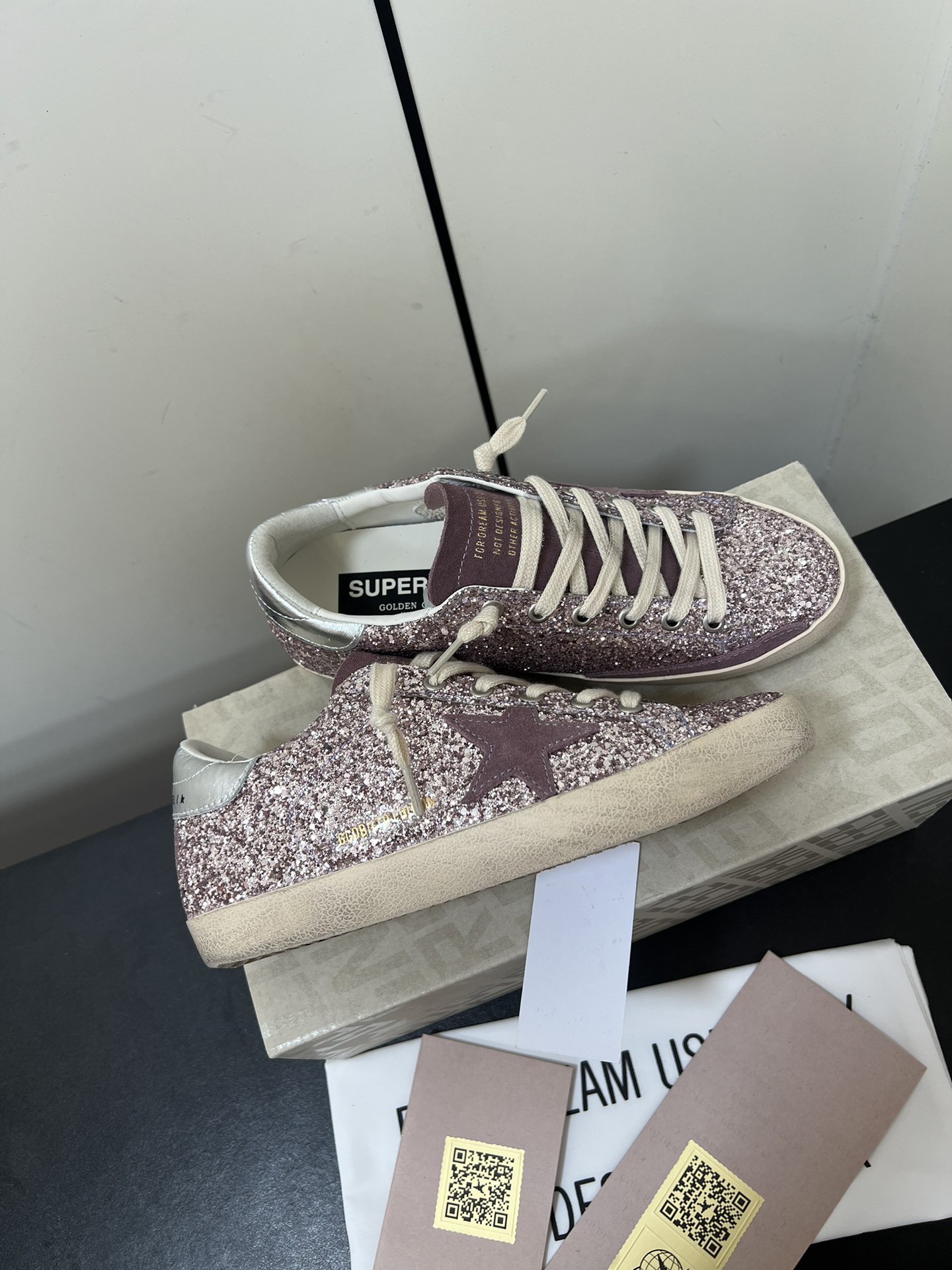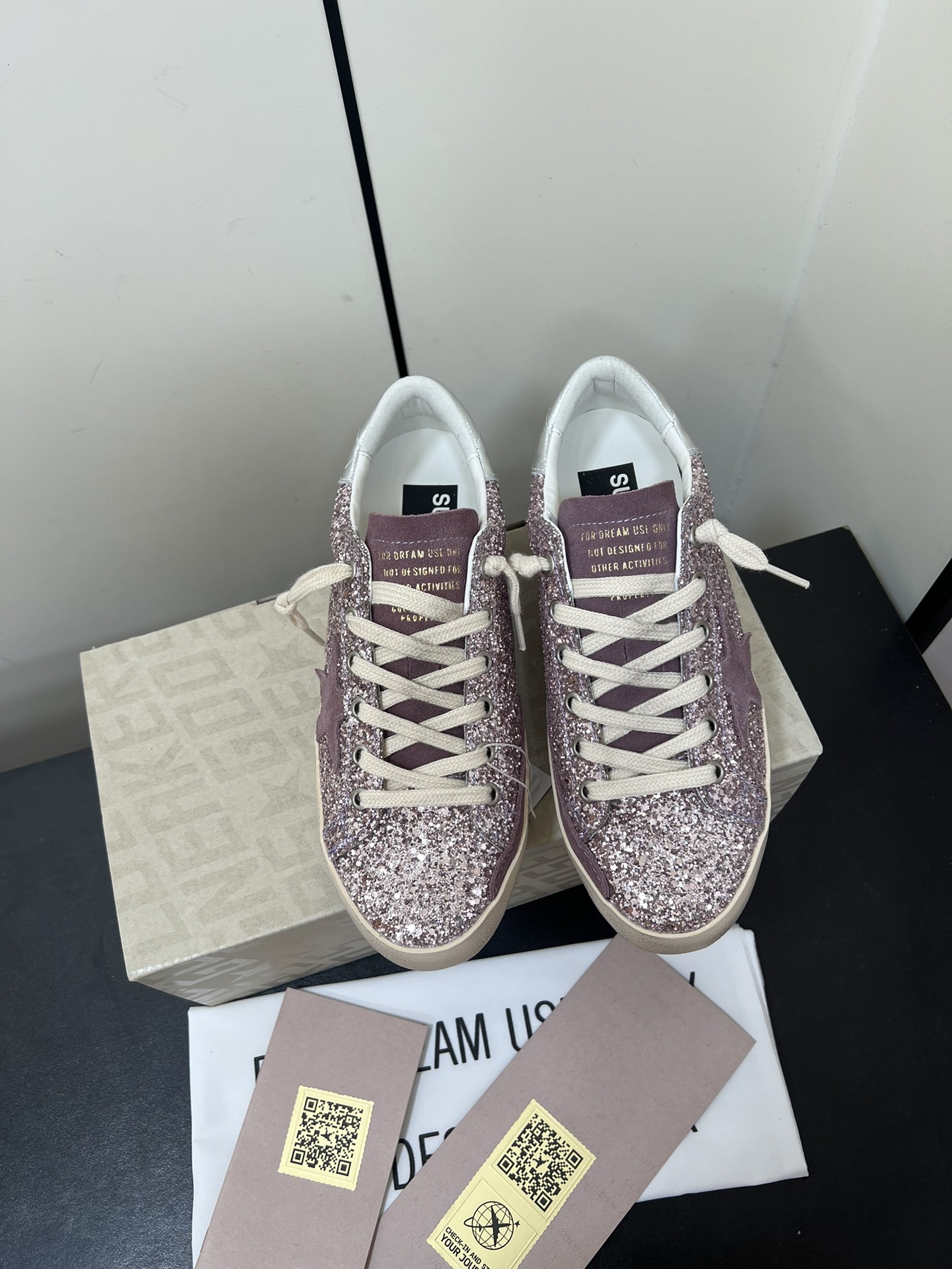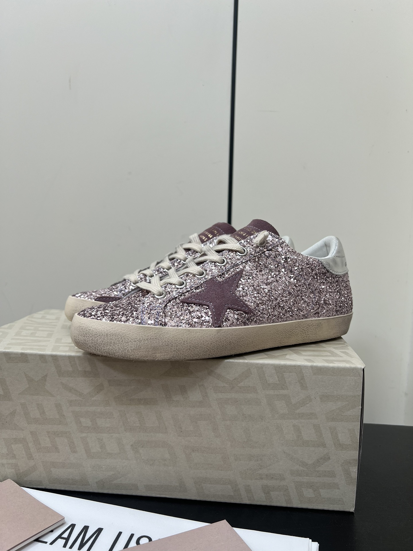 这款鞋子是AAAAA 1:1 质量 (非常棒). 使用了和原版一模一样的材料. 商标部分也保持了和Golden Goose一样. 图片拍摄是实物鞋子拍摄, 您所收到的实物保证和我们图片一模一样.