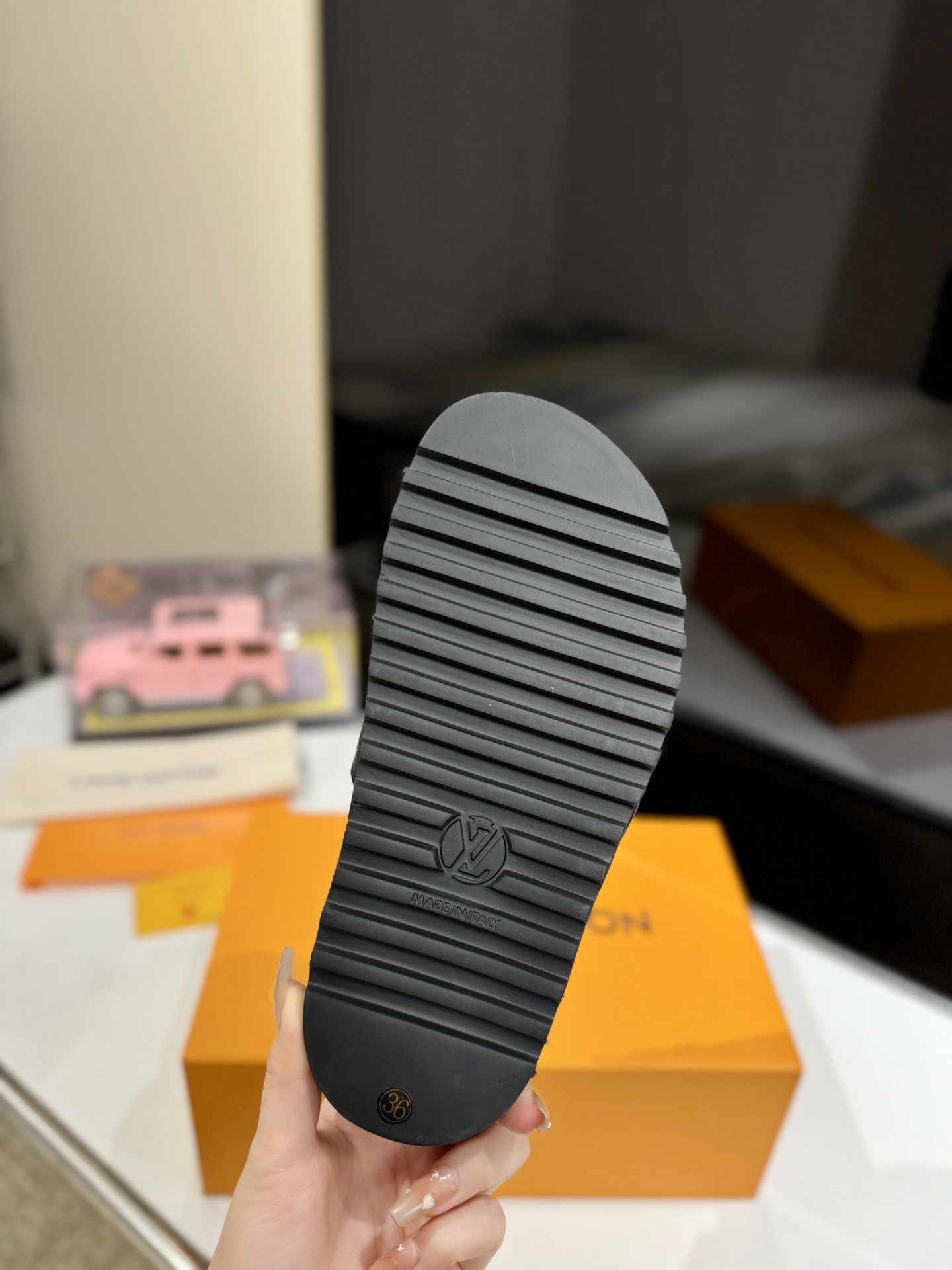 这款鞋子是AAAAA 1:1 质量 (非常棒). 使用了和原版一模一样的材料. 商标部分也保持了和路易威登/Louis Vuitton一样. 图片拍摄是实物鞋子拍摄, 您所收到的实物保证和我们图片一模一样.