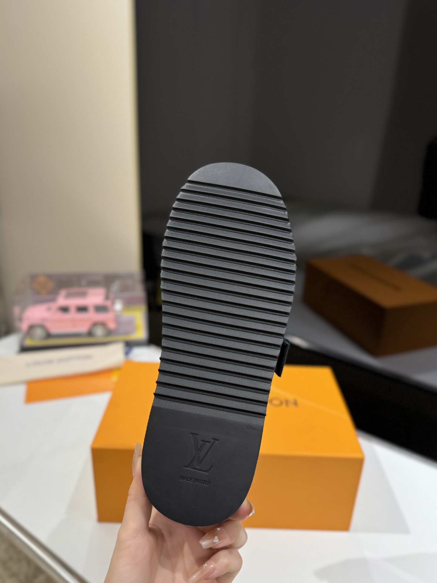 这款鞋子是AAAAA 1:1 质量 (非常棒). 使用了和原版一模一样的材料. 商标部分也保持了和路易威登/Louis Vuitton一样. 图片拍摄是实物鞋子拍摄, 您所收到的实物保证和我们图片一模一样.
