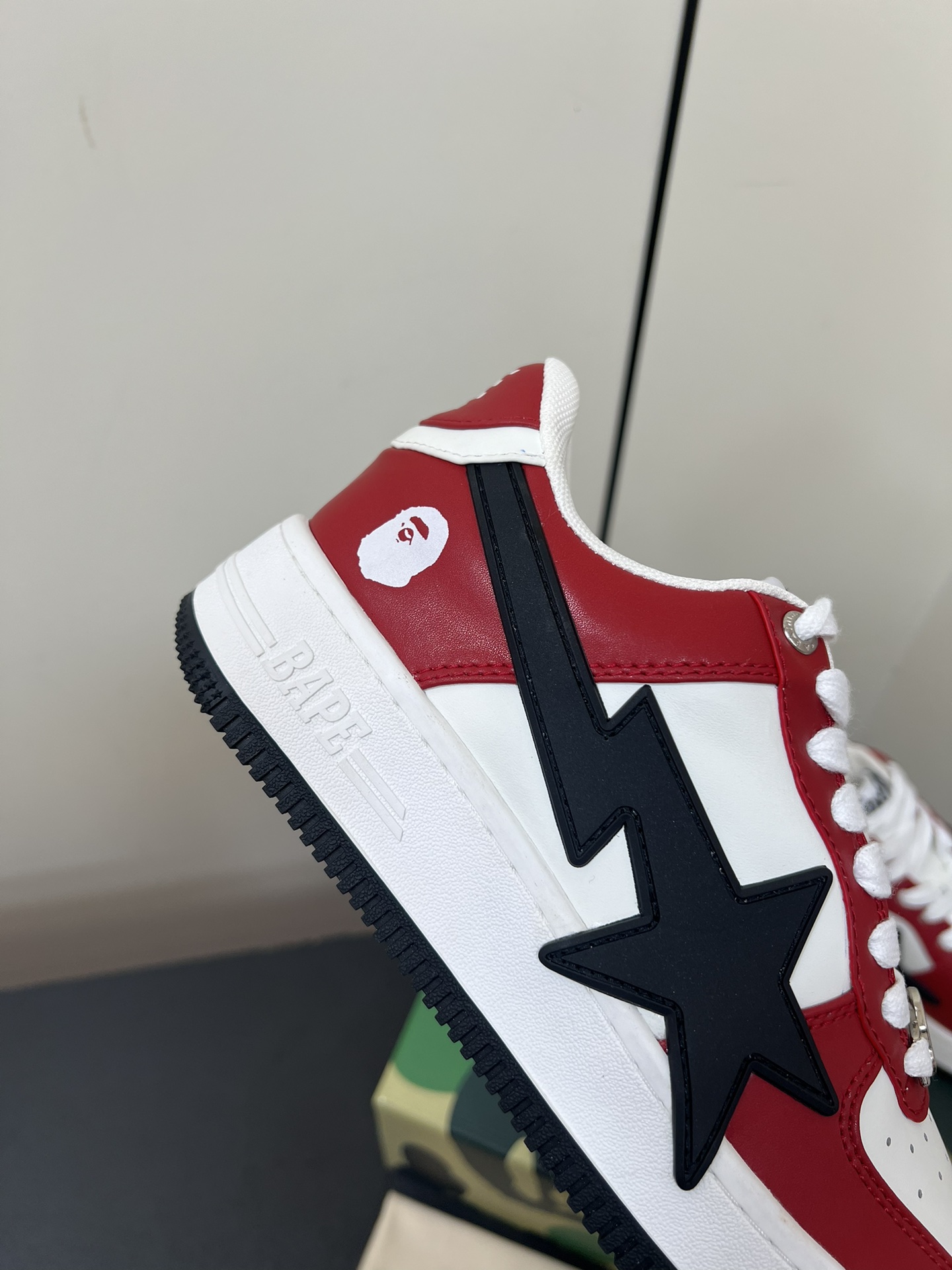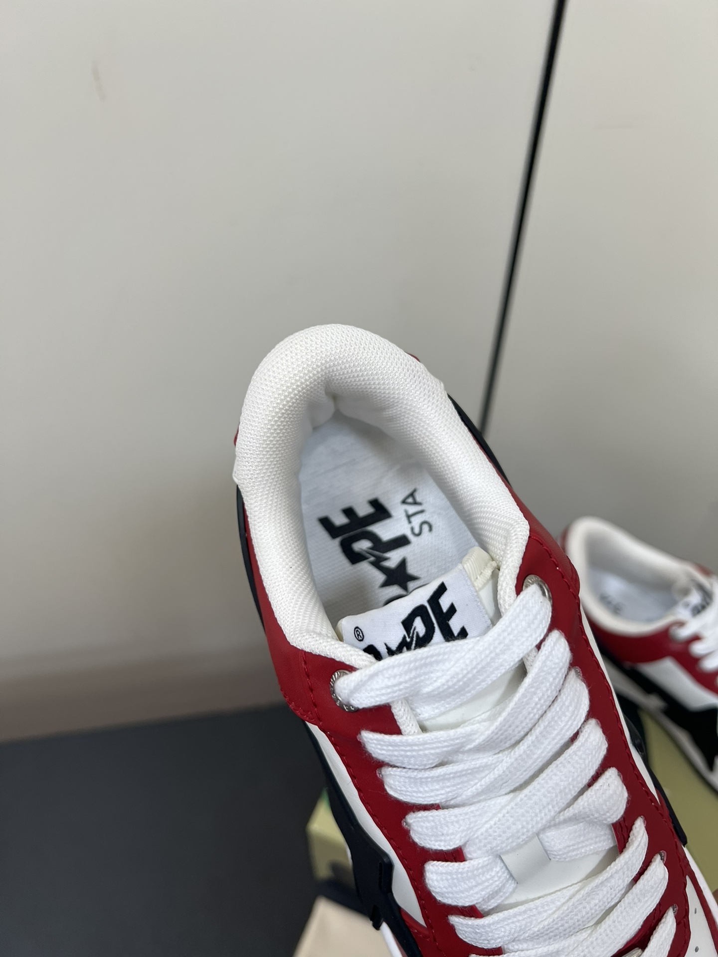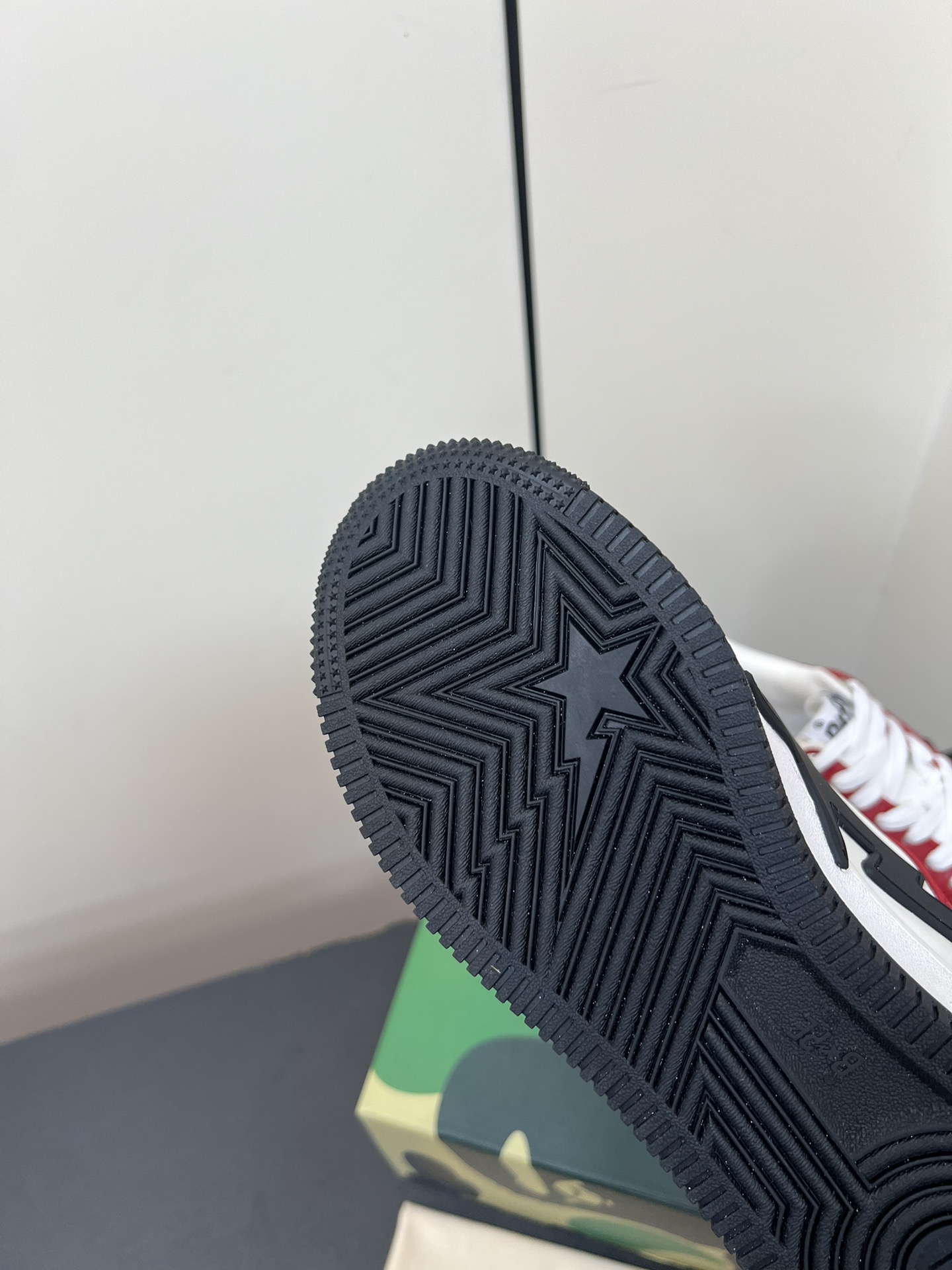 这款鞋子是AAAAA 1:1 质量 (非常棒). 使用了和原版一模一样的材料. 商标部分也保持了和Bape一样. 图片拍摄是实物鞋子拍摄, 您所收到的实物保证和我们图片一模一样.