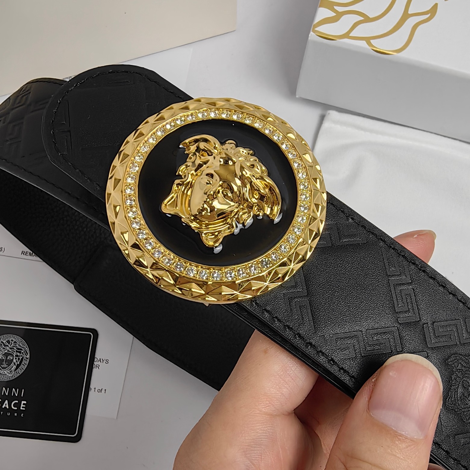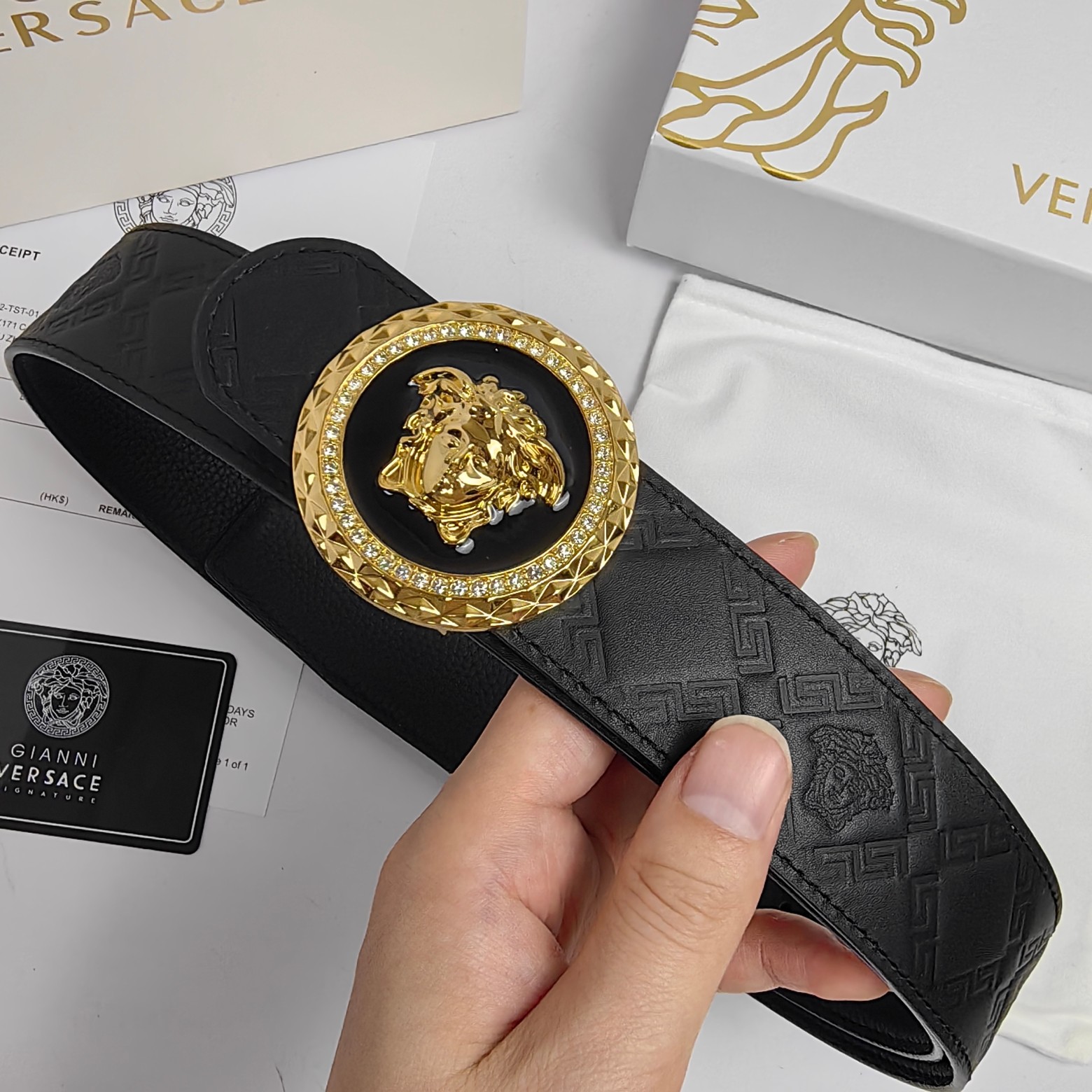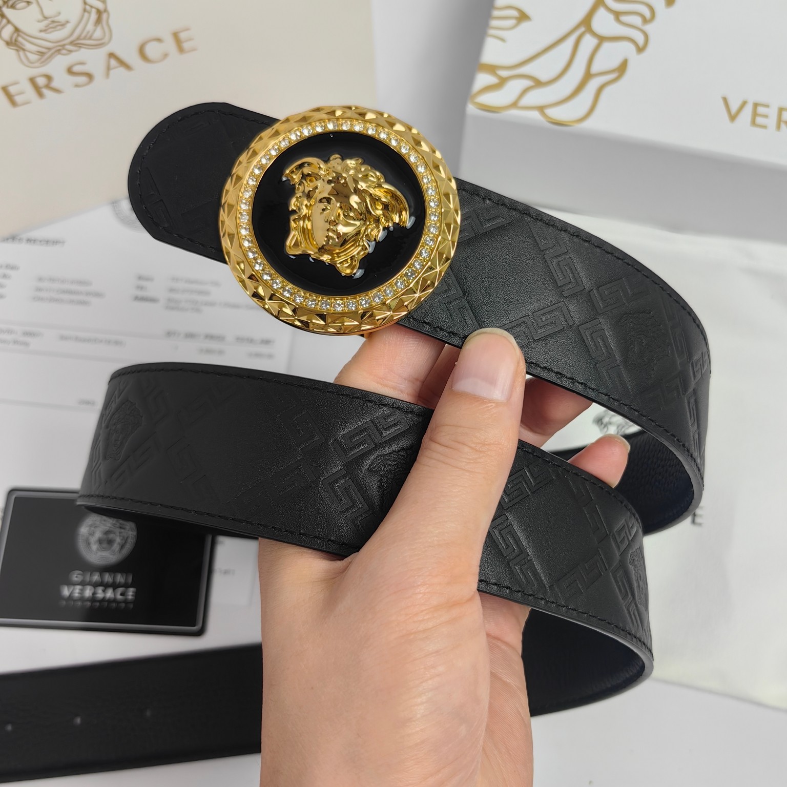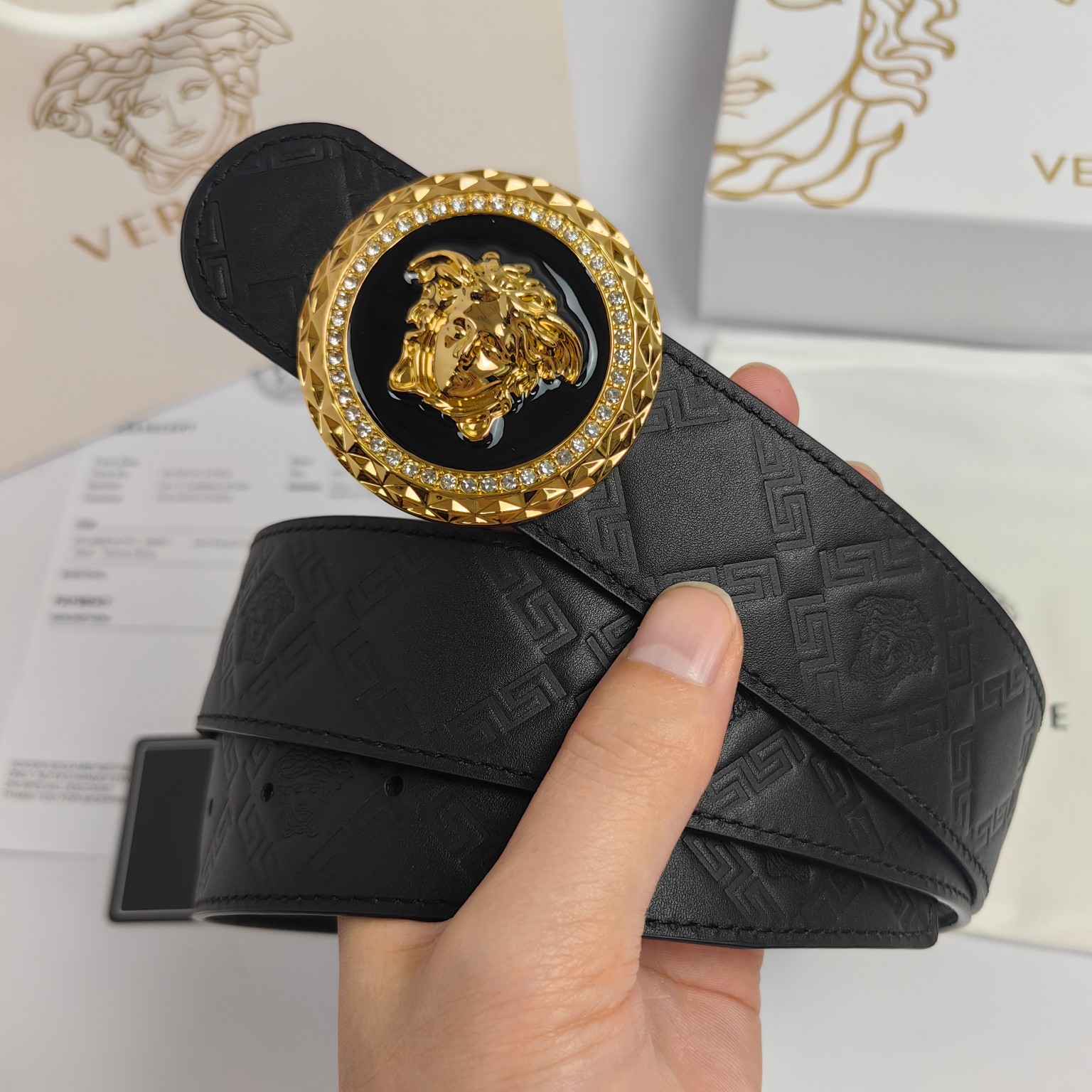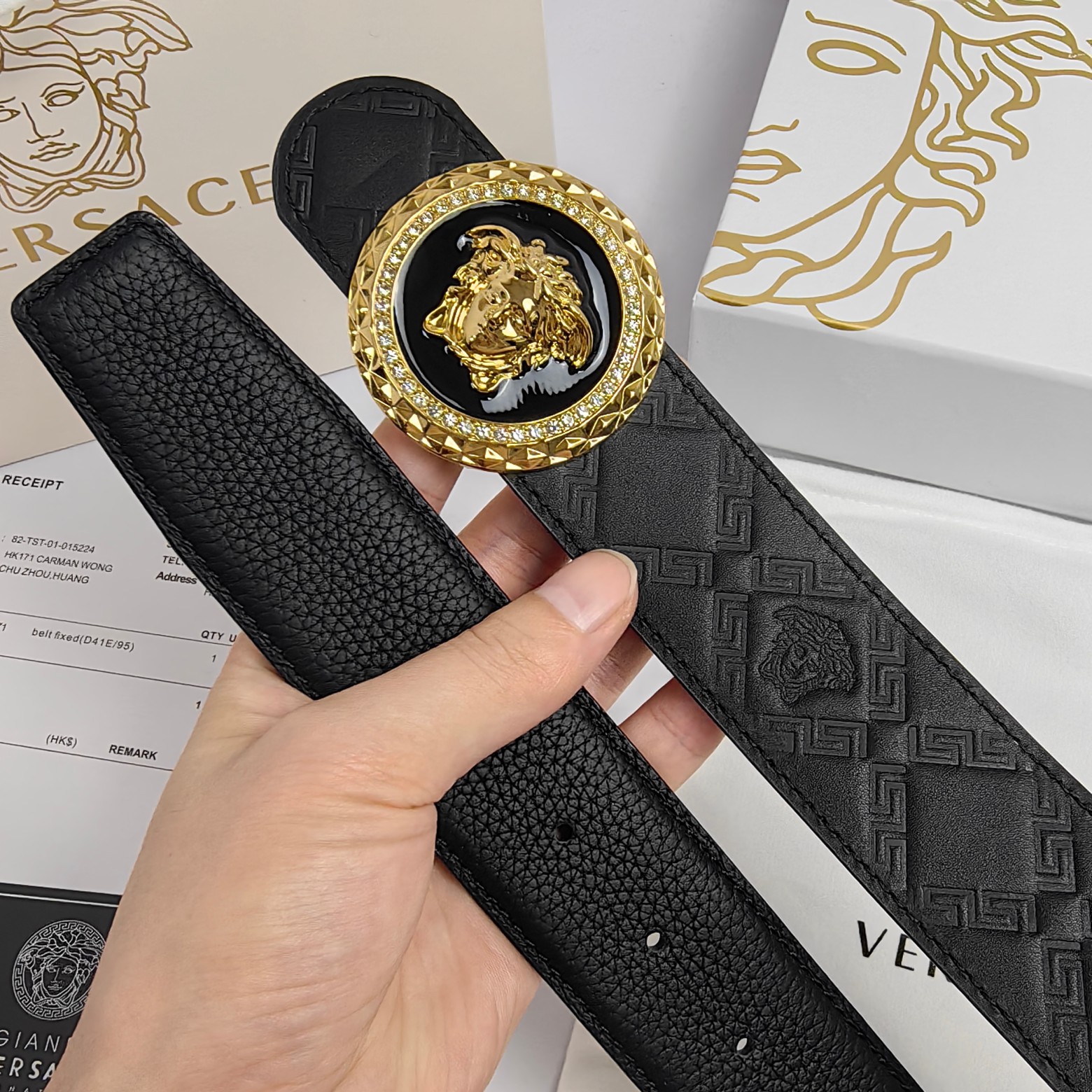 这款皮带是AAAAA 1:1 质量 (非常棒). 使用了和原版一模一样的材料. 商标部分也保持了和范思哲/Versace一样. 图片拍摄是实物皮带拍摄, 您所收到的实物保证和我们图片一模一样.