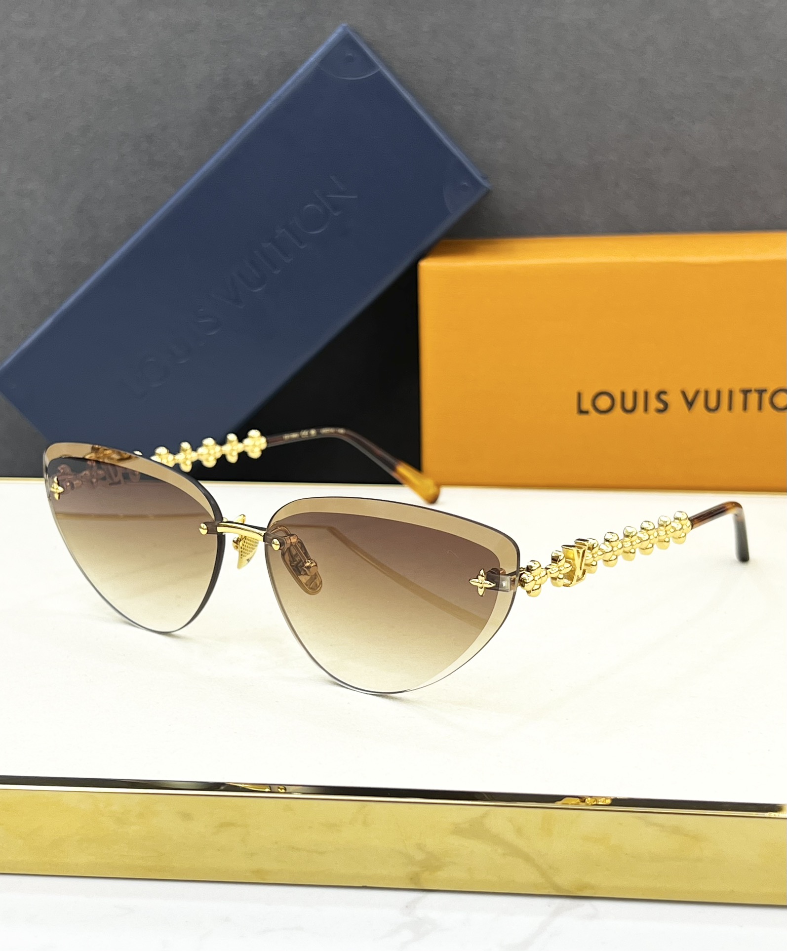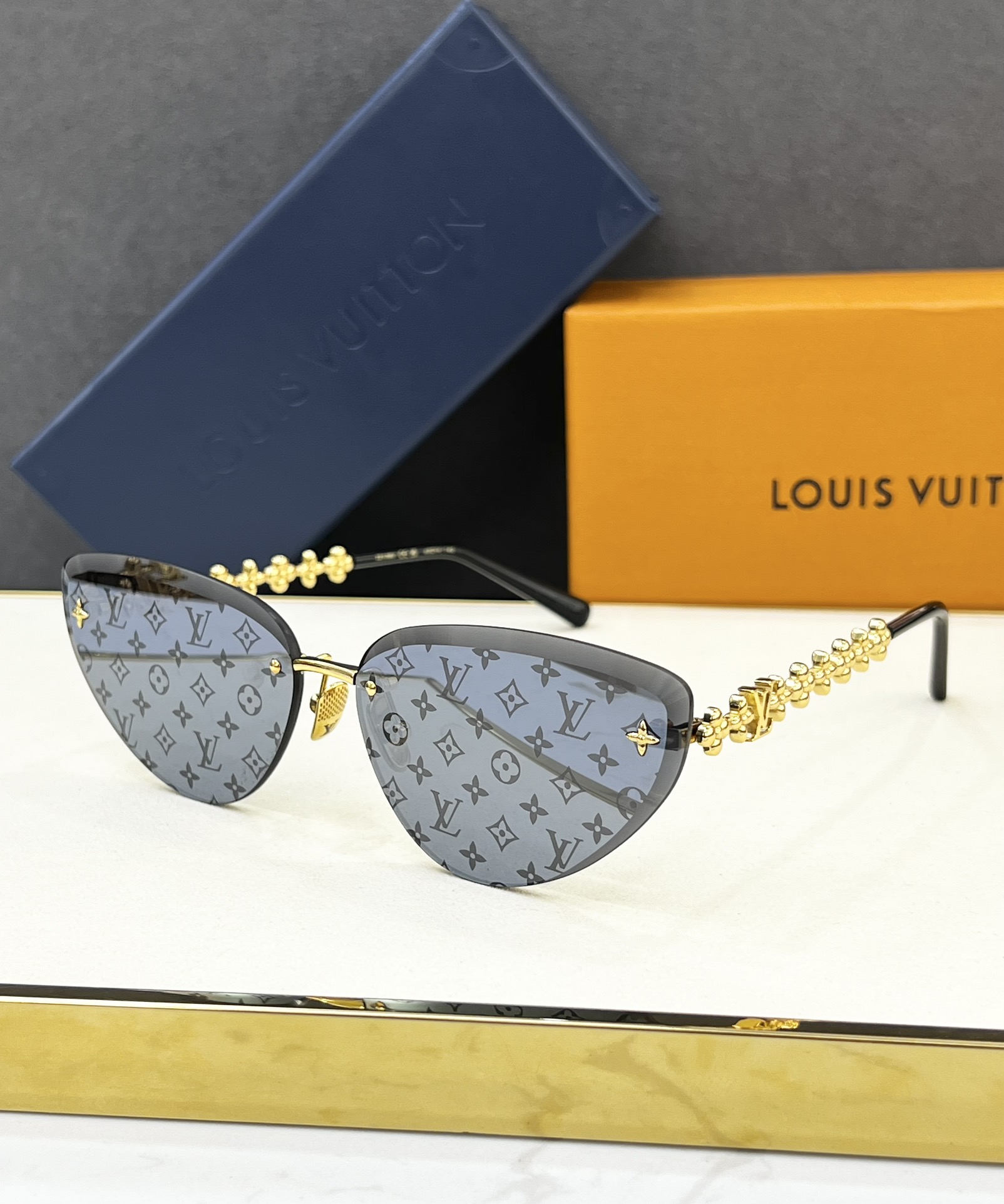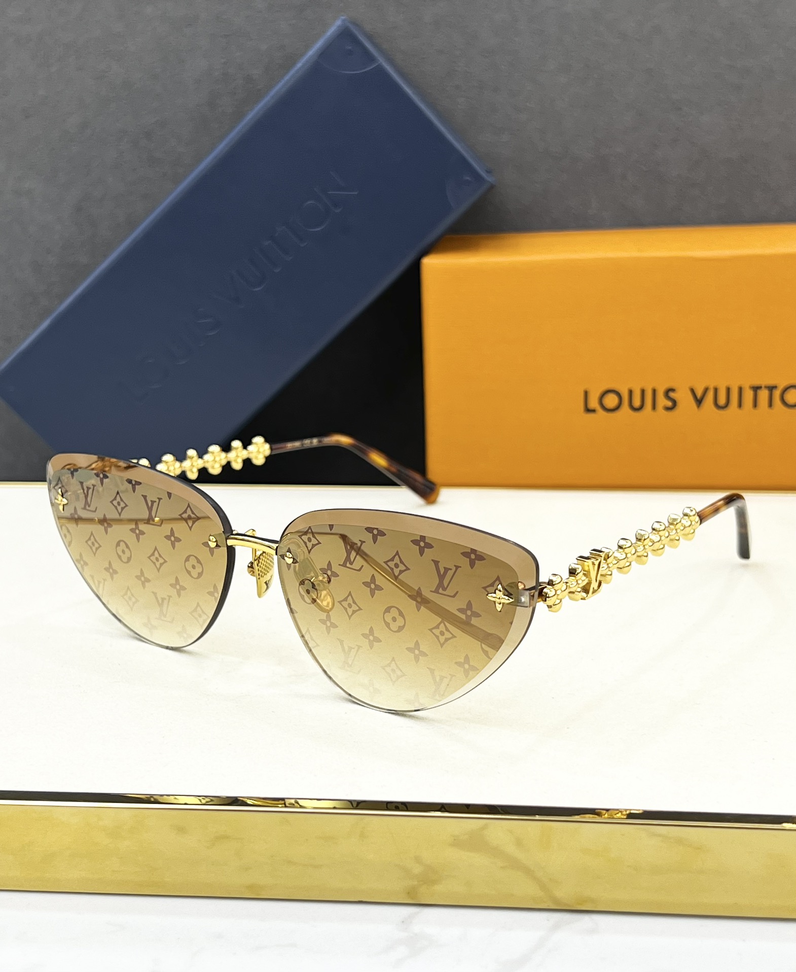 这款太阳眼镜是AAAAA 1:1 质量 (非常棒). 使用了和原版一模一样的材料. 商标部分也保持了和路易威登/Louis Vuitton一样. 图片拍摄是实物太阳眼镜拍摄, 您所收到的实物保证和我们图片一模一样.
