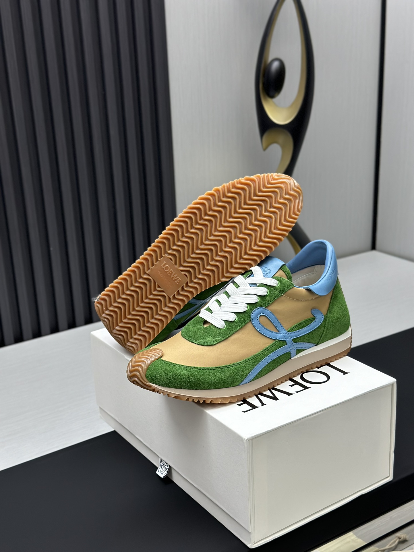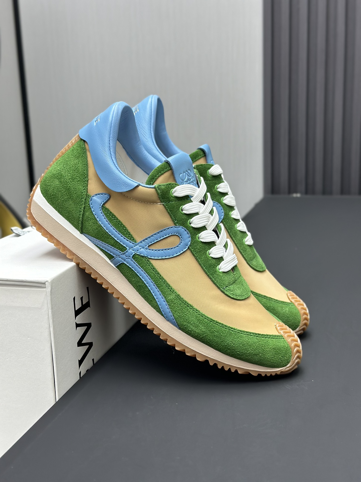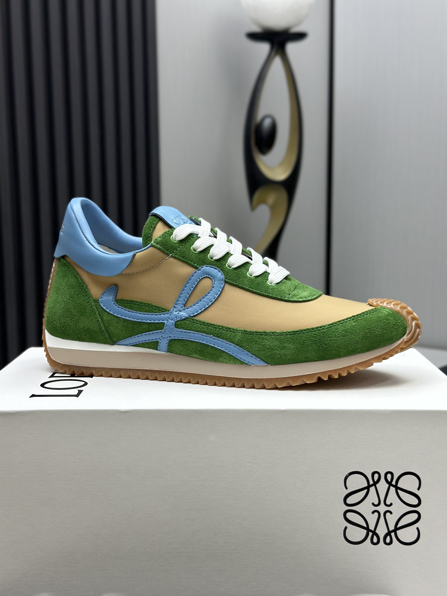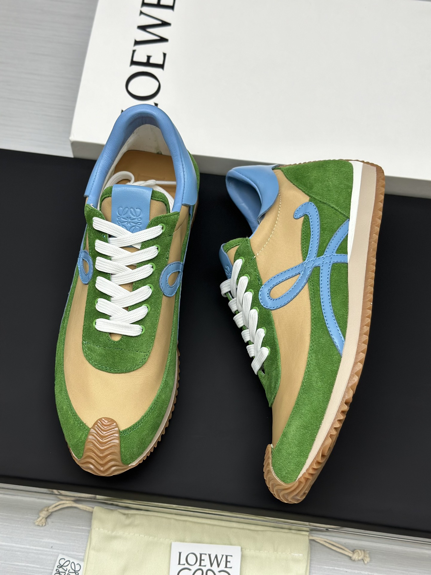 这款鞋子是AAAAA 1:1 质量 (非常棒). 使用了和原版一模一样的材料. 商标部分也保持了和罗意威/Loewe一样. 图片拍摄是实物鞋子拍摄, 您所收到的实物保证和我们图片一模一样.