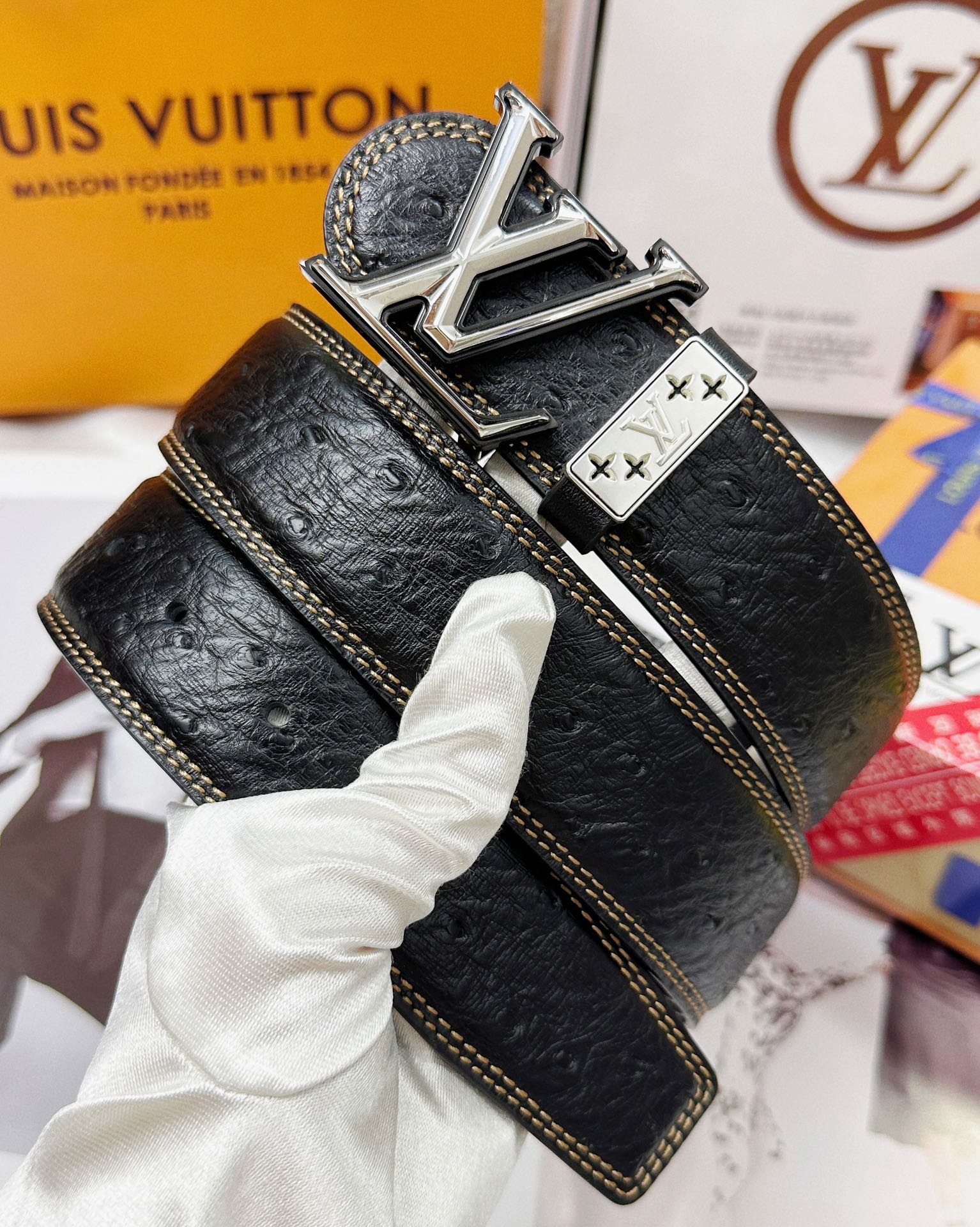 这款皮带是AAAAA 1:1 质量 (非常棒). 使用了和原版一模一样的材料. 商标部分也保持了和路易威登/Louis Vuitton一样. 图片拍摄是实物皮带拍摄, 您所收到的实物保证和我们图片一模一样.