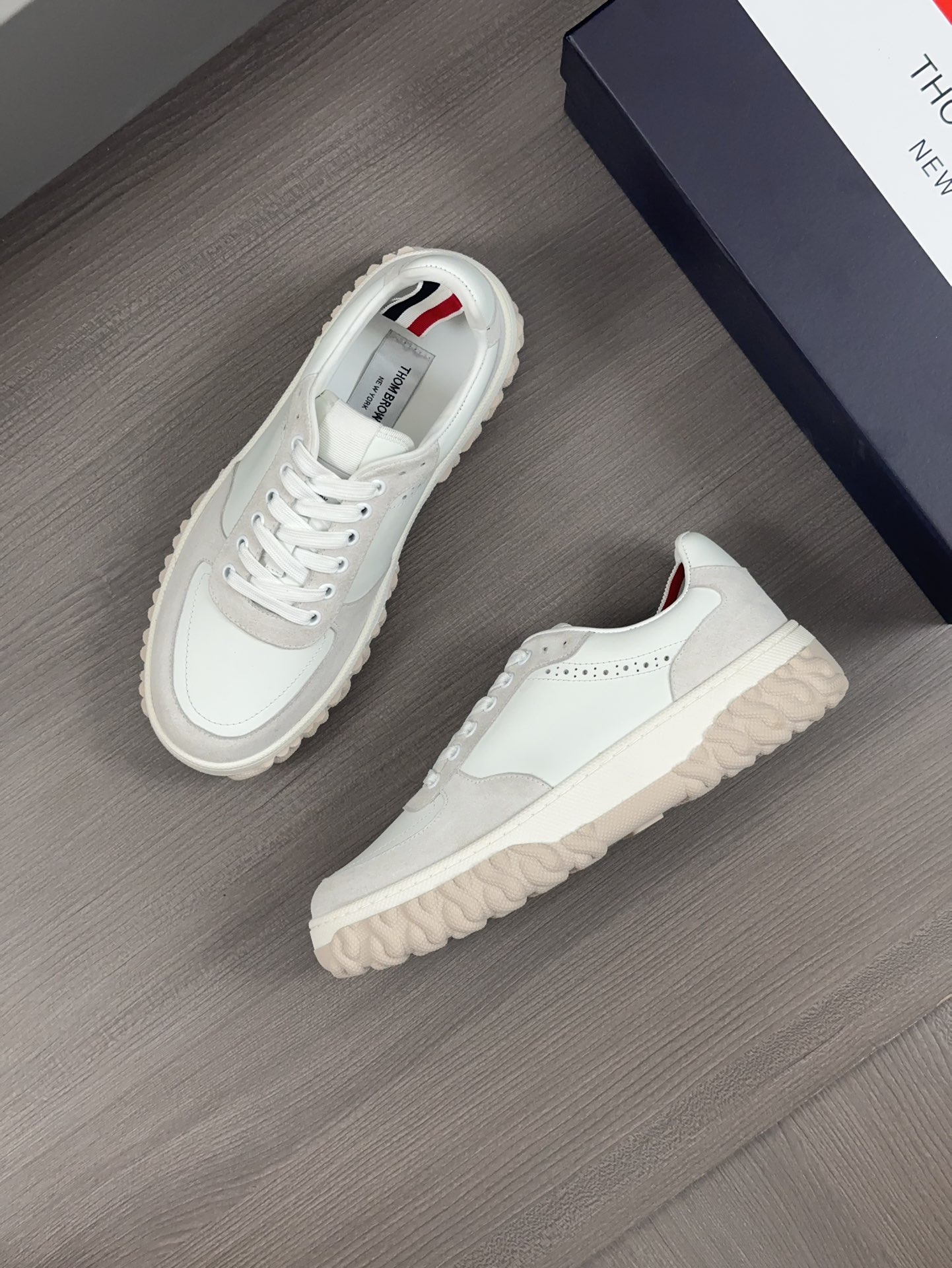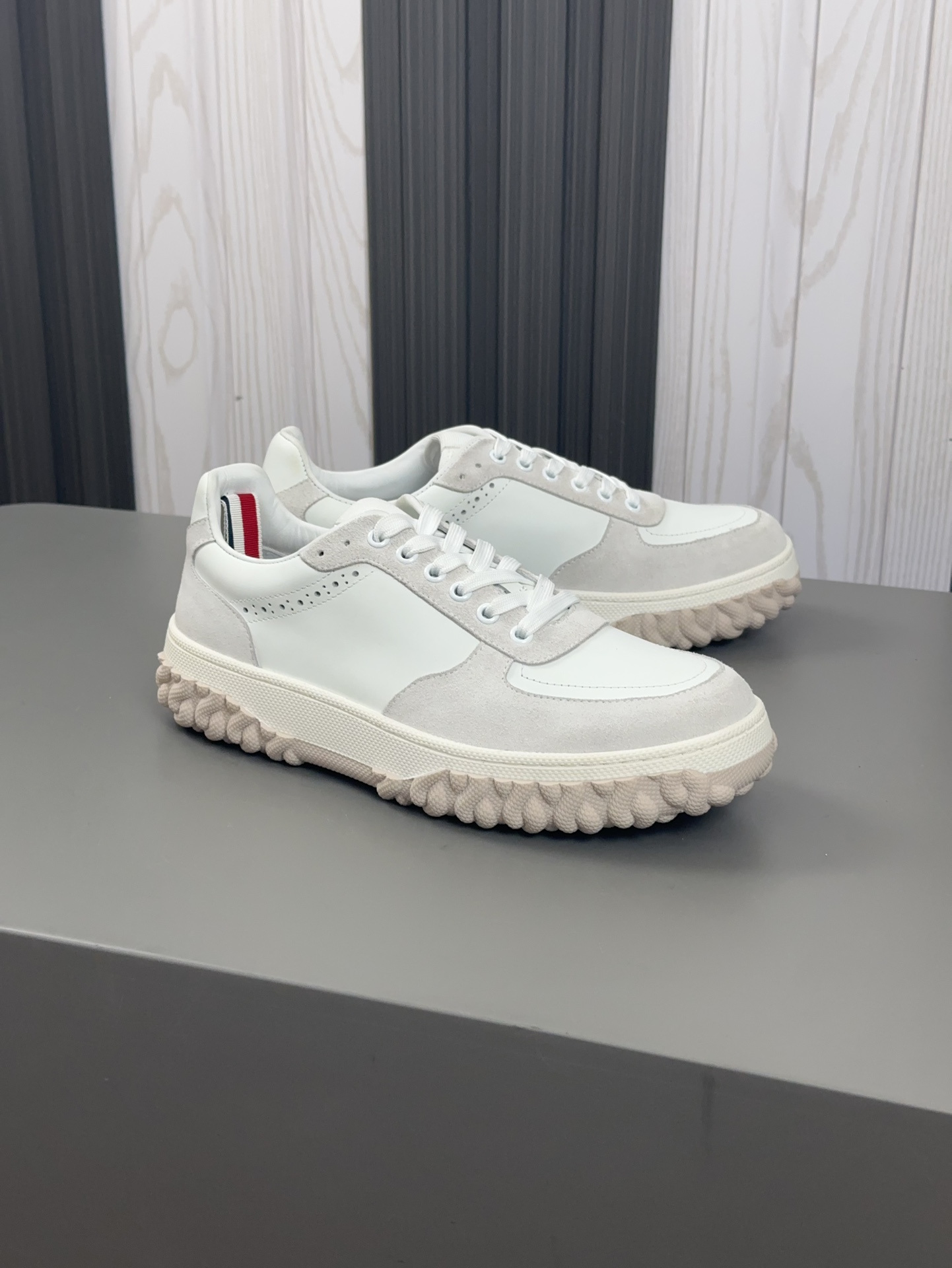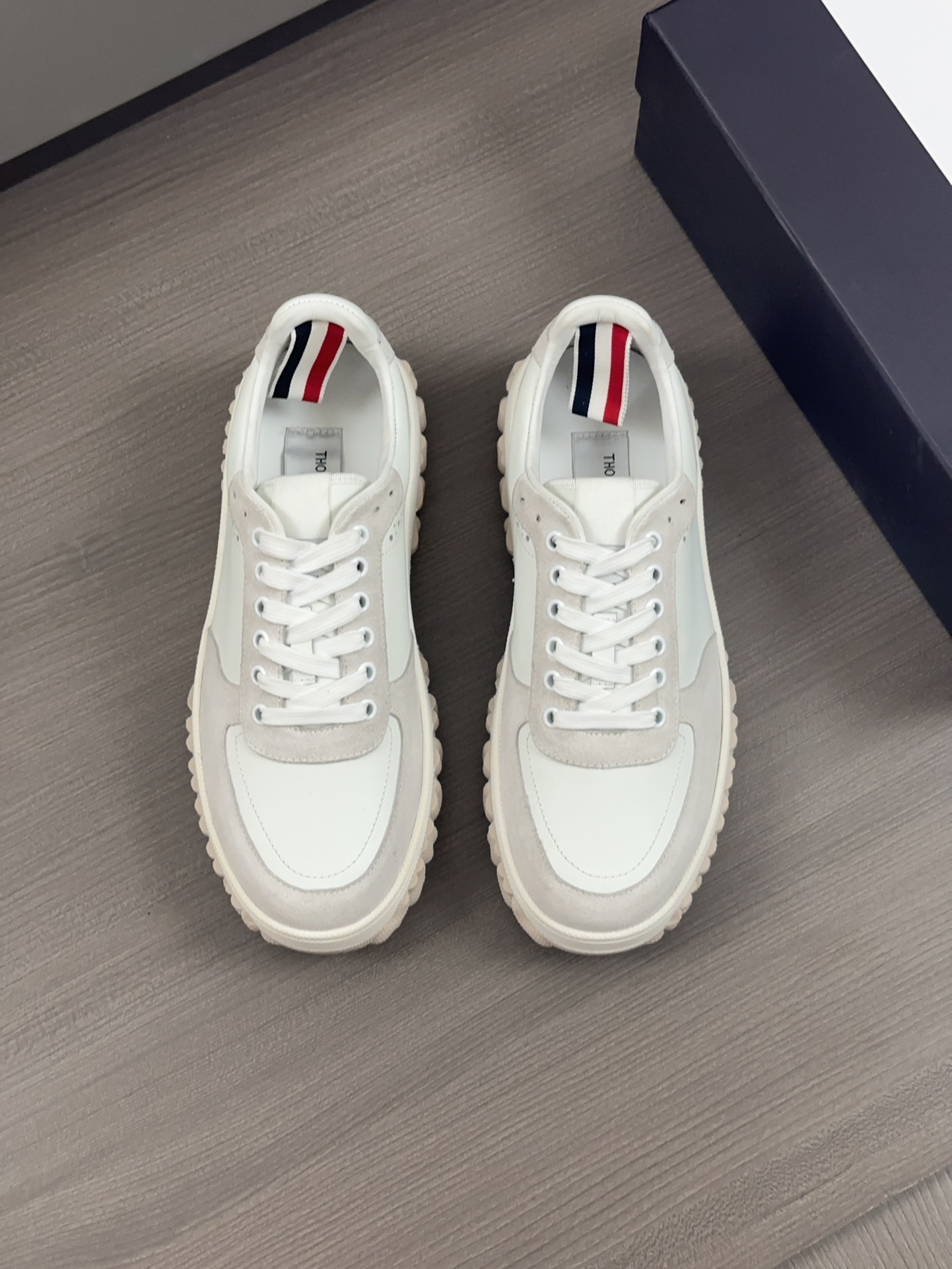 这款鞋子是AAAAA 1:1 质量 (非常棒). 使用了和原版一模一样的材料. 商标部分也保持了和汤姆布朗/Thom Browne一样. 图片拍摄是实物鞋子拍摄, 您所收到的实物保证和我们图片一模一样.