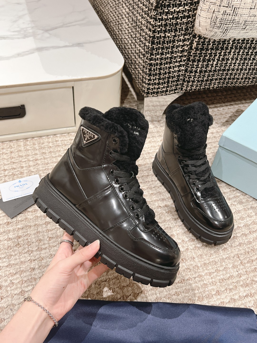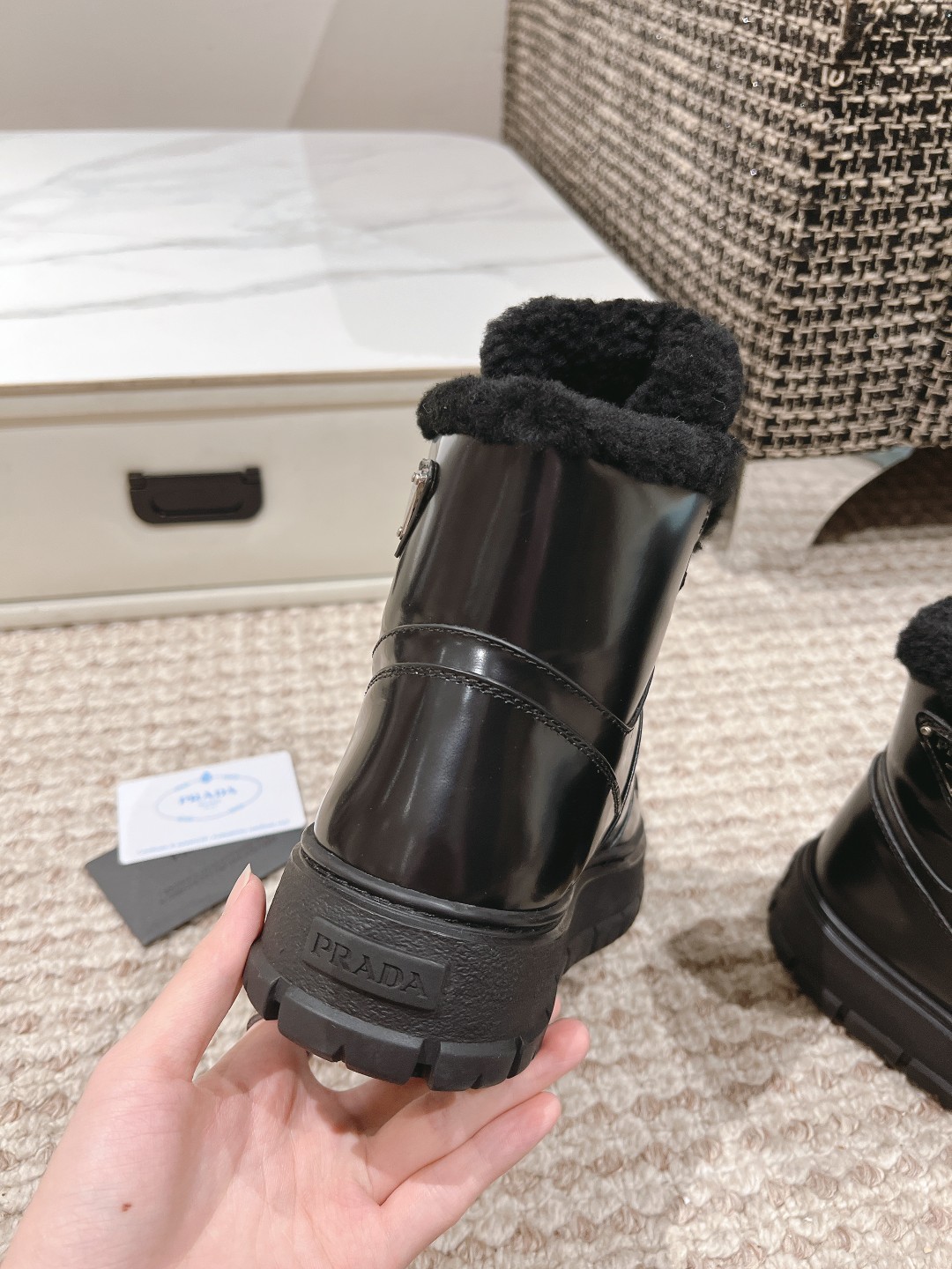 这款鞋子是AAAAA 1:1 质量 (非常棒). 使用了和原版一模一样的材料. 商标部分也保持了和普拉达/Prada一样. 图片拍摄是实物鞋子拍摄, 您所收到的实物保证和我们图片一模一样.