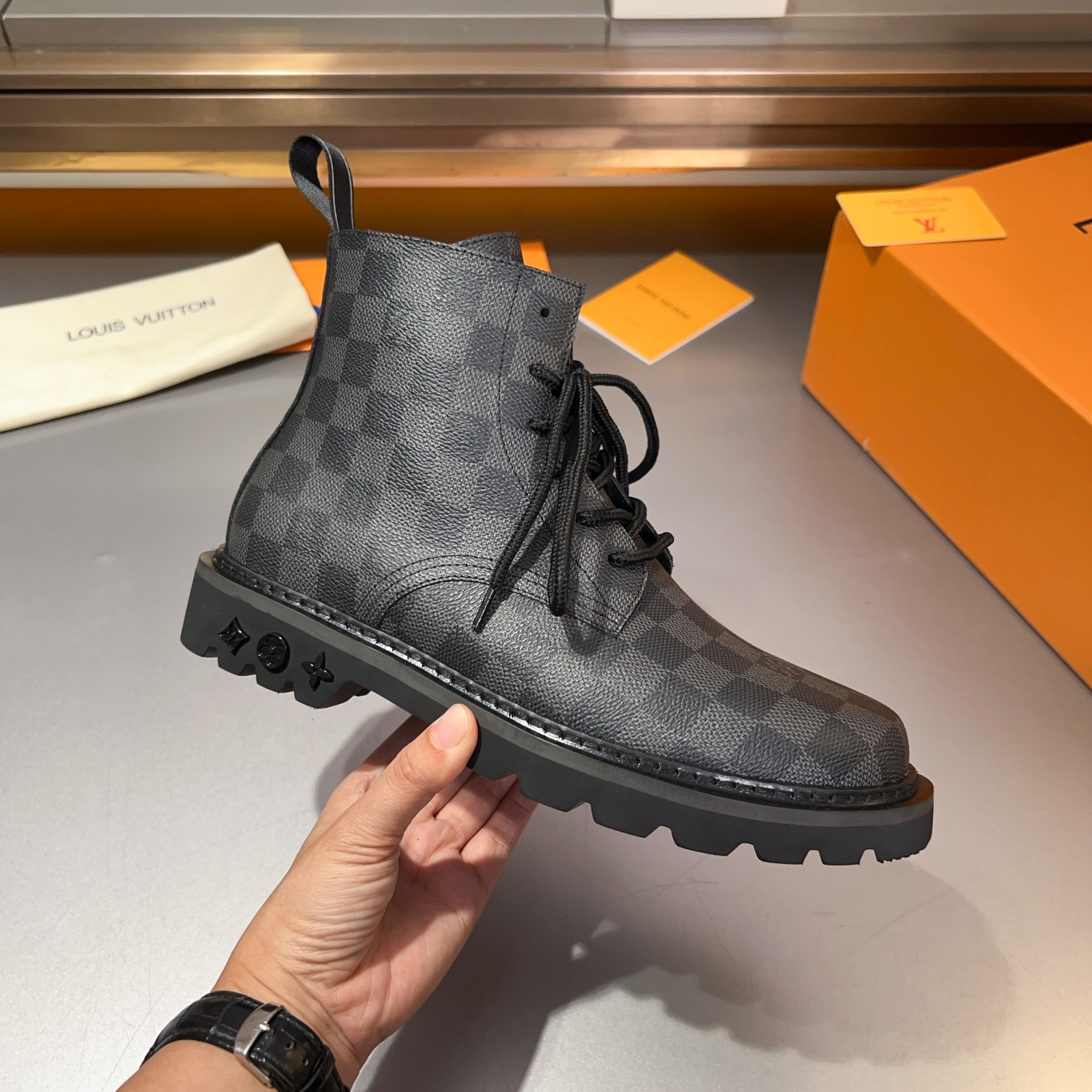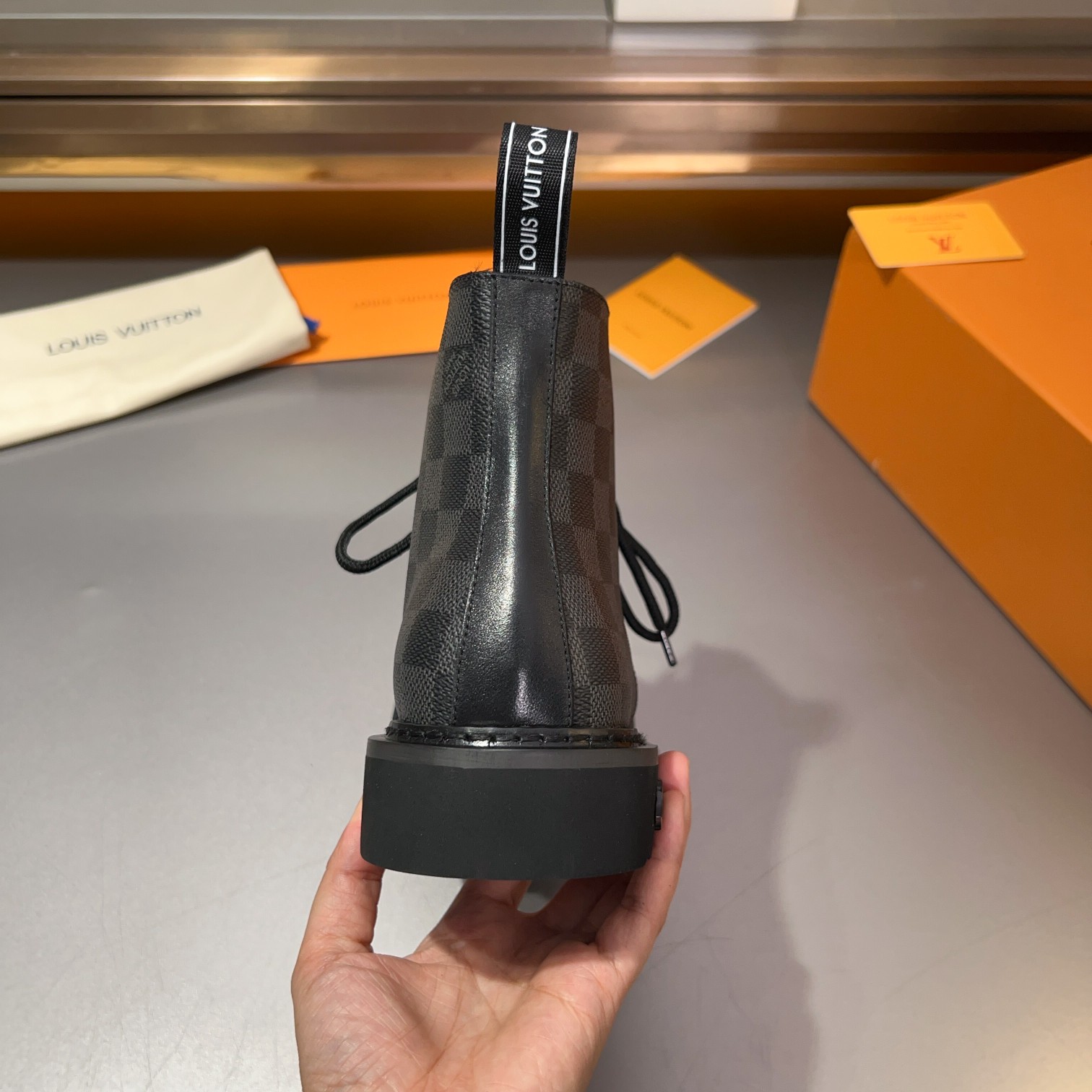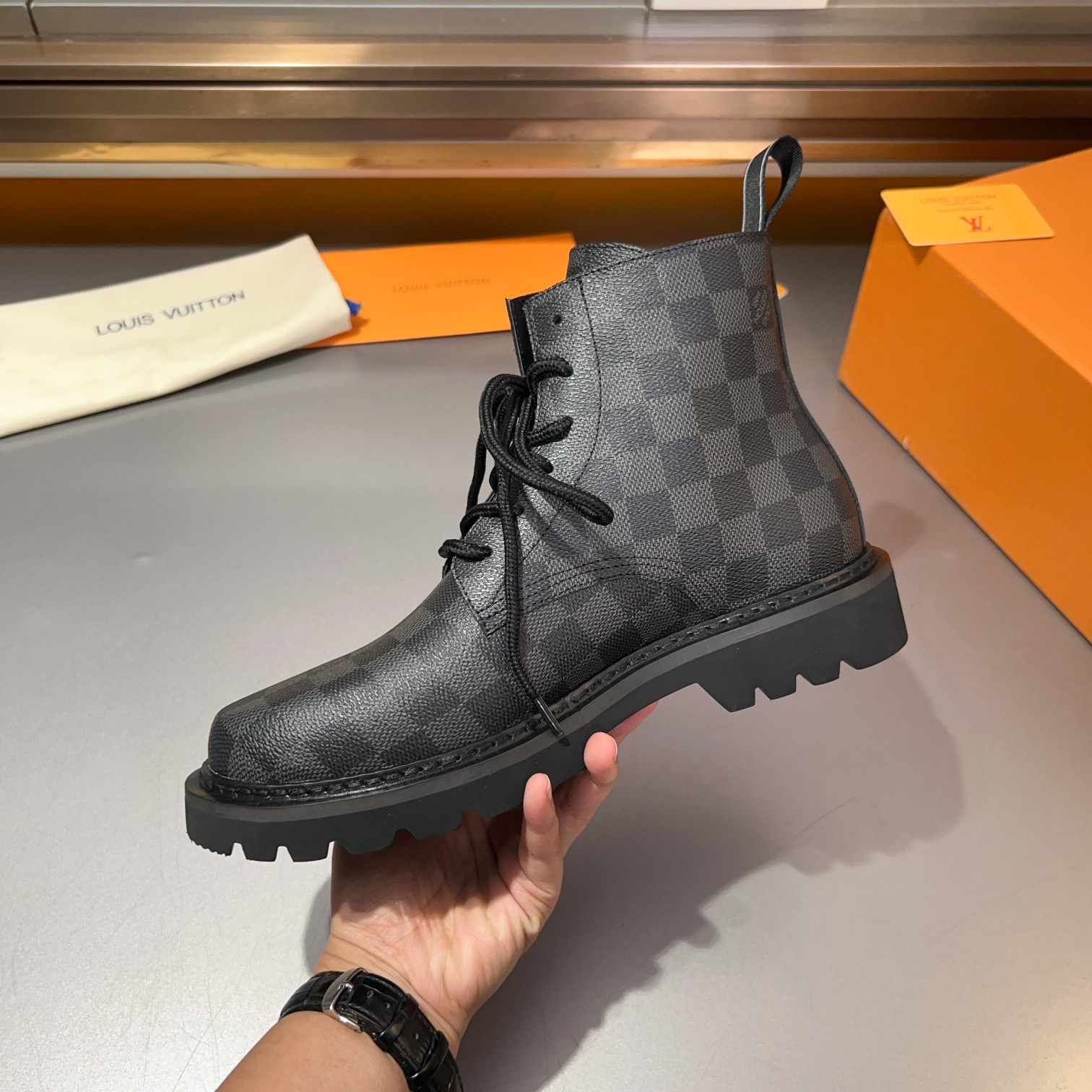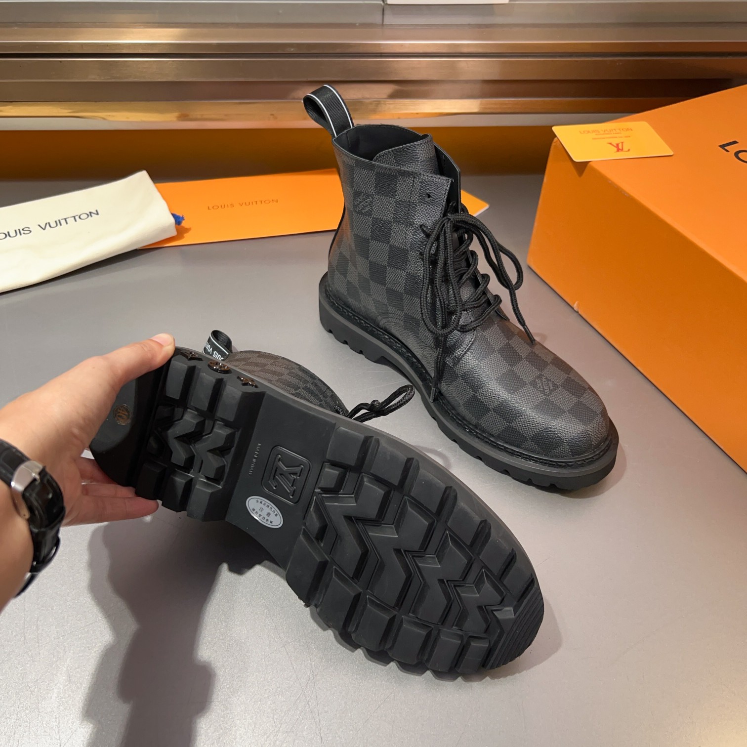 这款鞋子是AAAAA 1:1 质量 (非常棒). 使用了和原版一模一样的材料. 商标部分也保持了和路易威登/Louis Vuitton一样. 图片拍摄是实物鞋子拍摄, 您所收到的实物保证和我们图片一模一样.