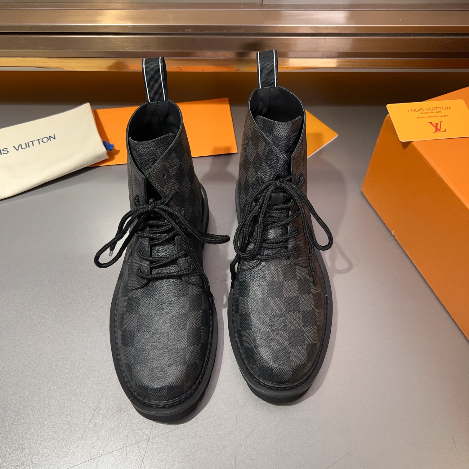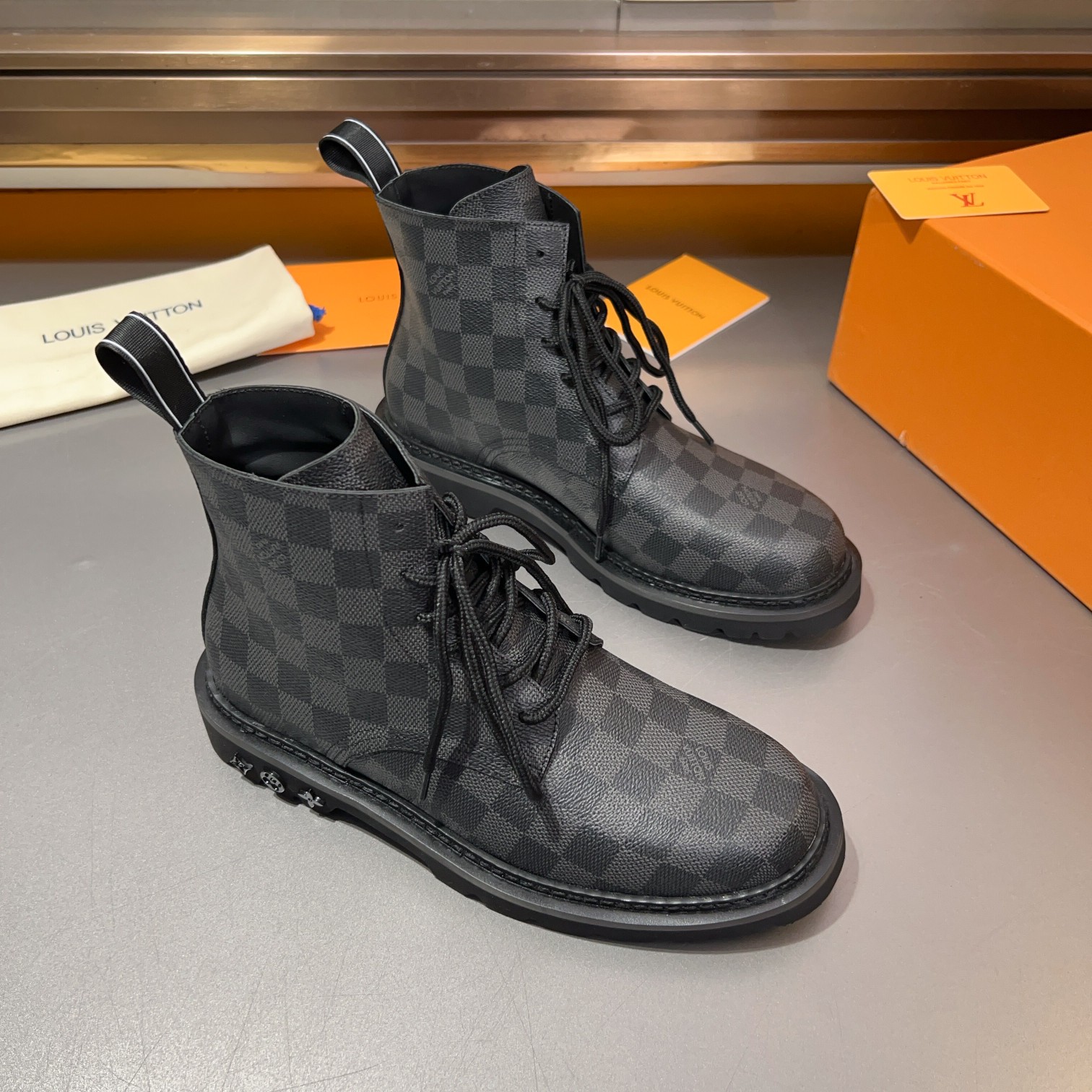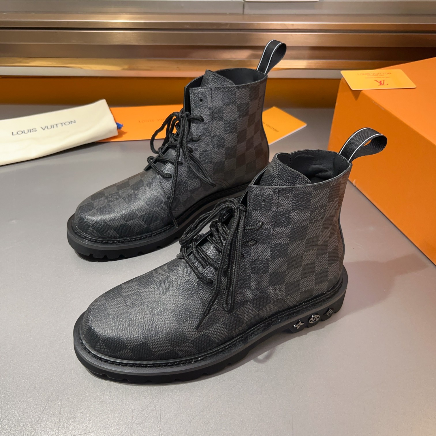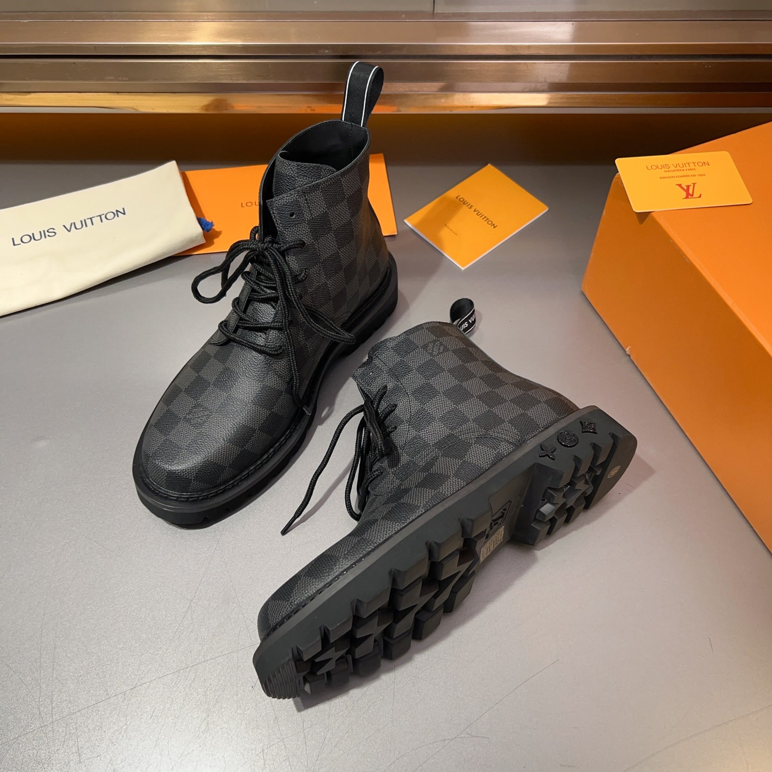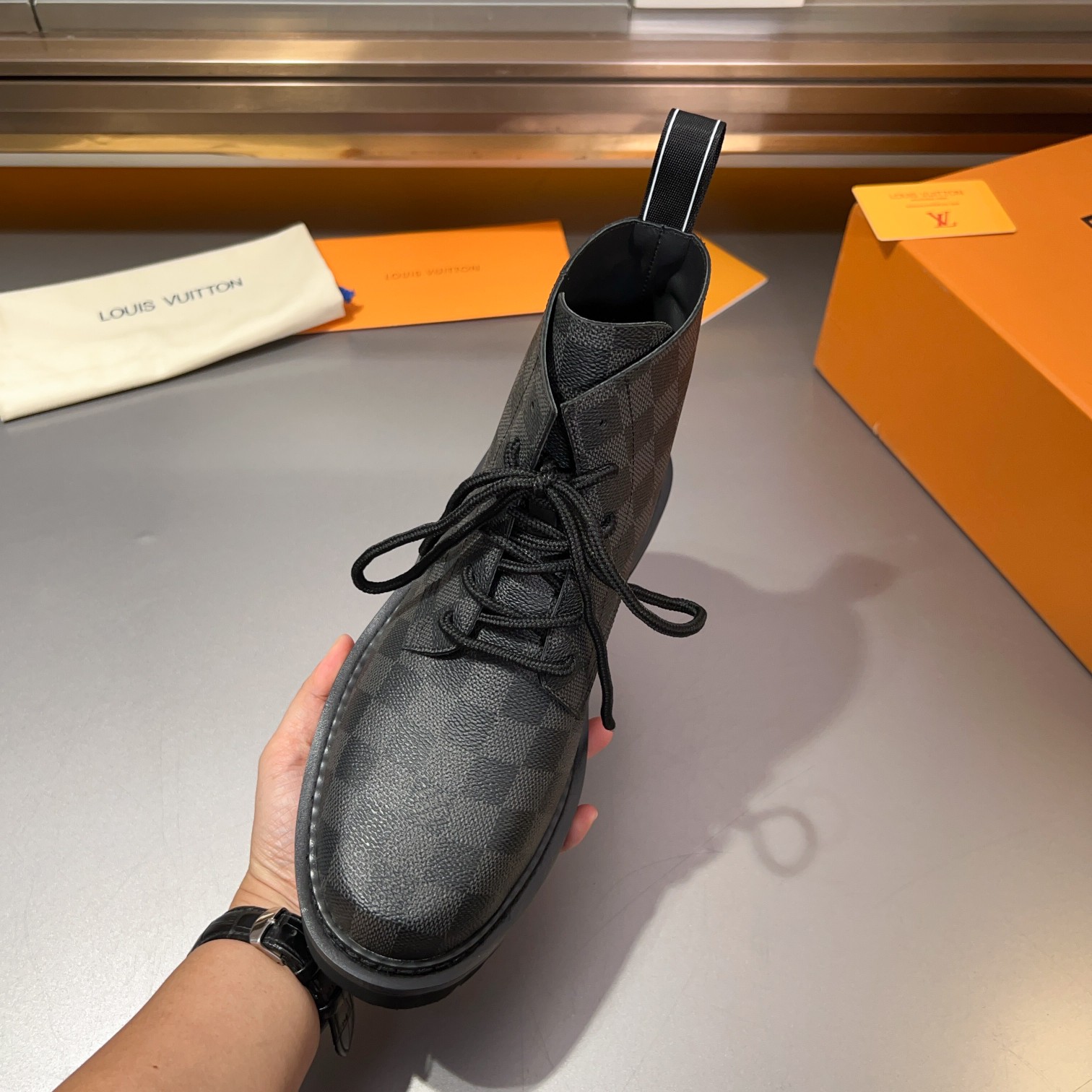 这款鞋子是AAAAA 1:1 质量 (非常棒). 使用了和原版一模一样的材料. 商标部分也保持了和路易威登/Louis Vuitton一样. 图片拍摄是实物鞋子拍摄, 您所收到的实物保证和我们图片一模一样.