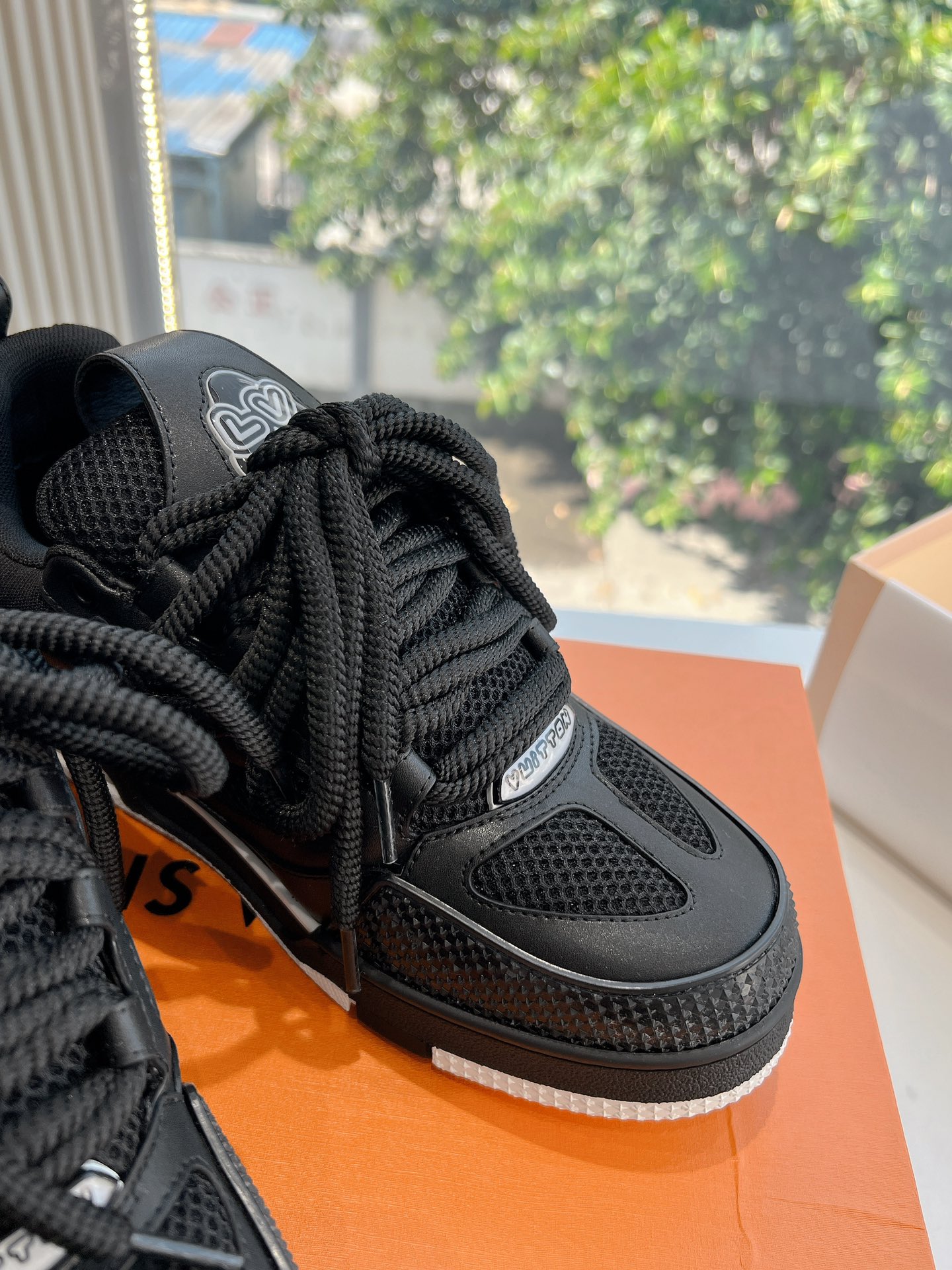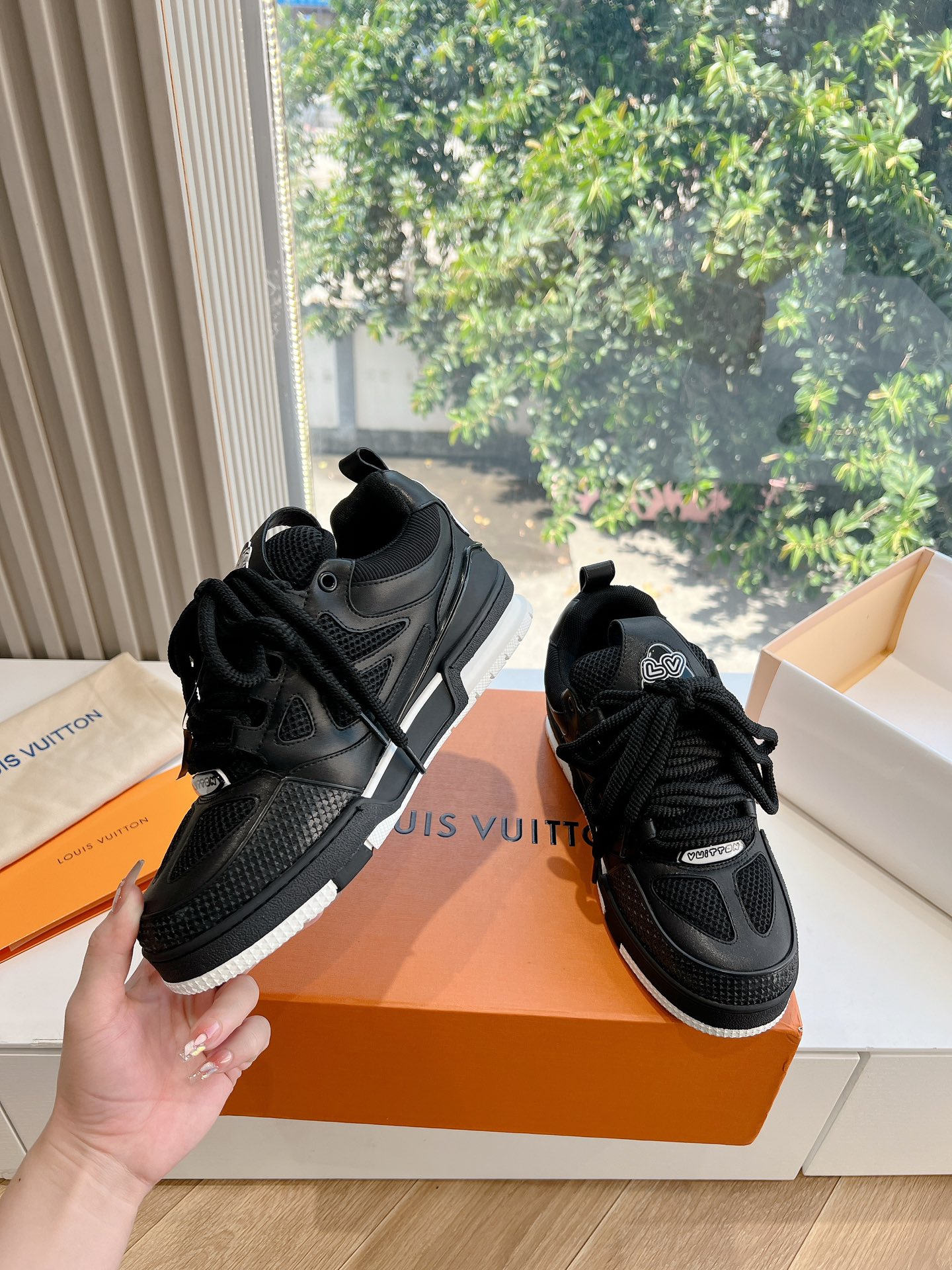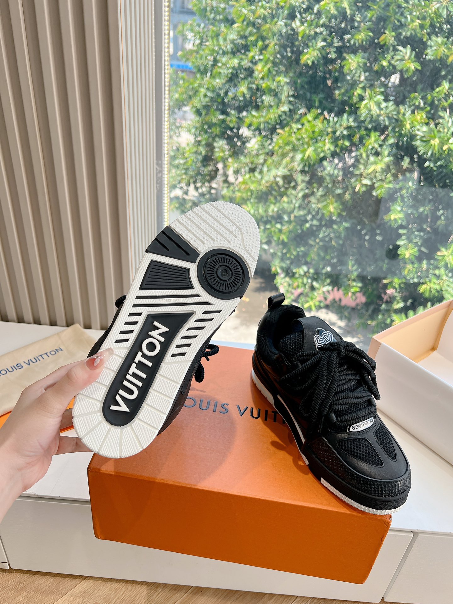 这款鞋子是AAAAA 1:1 质量 (非常棒). 使用了和原版一模一样的材料. 商标部分也保持了和路易威登/Louis Vuitton一样. 图片拍摄是实物鞋子拍摄, 您所收到的实物保证和我们图片一模一样.