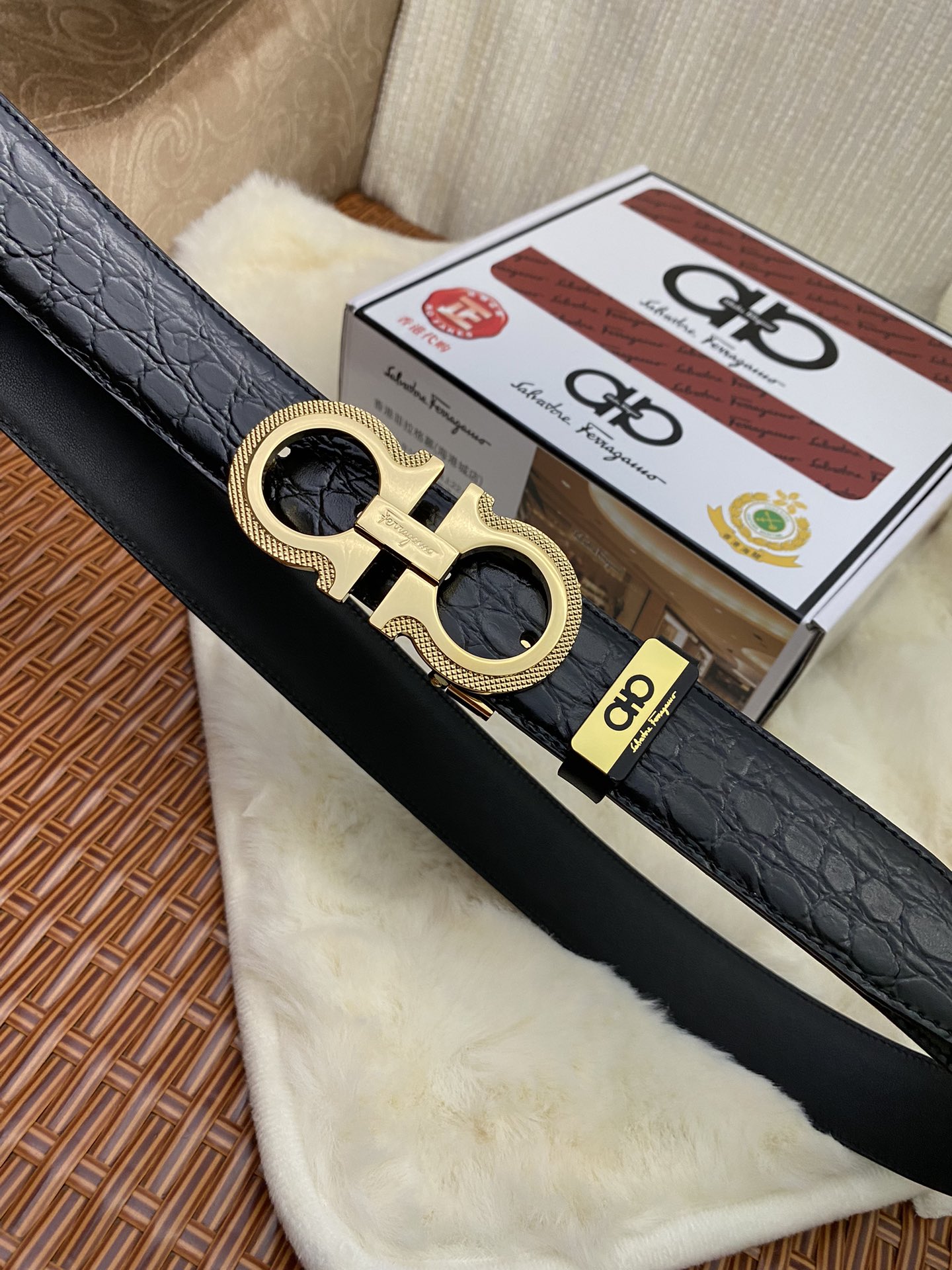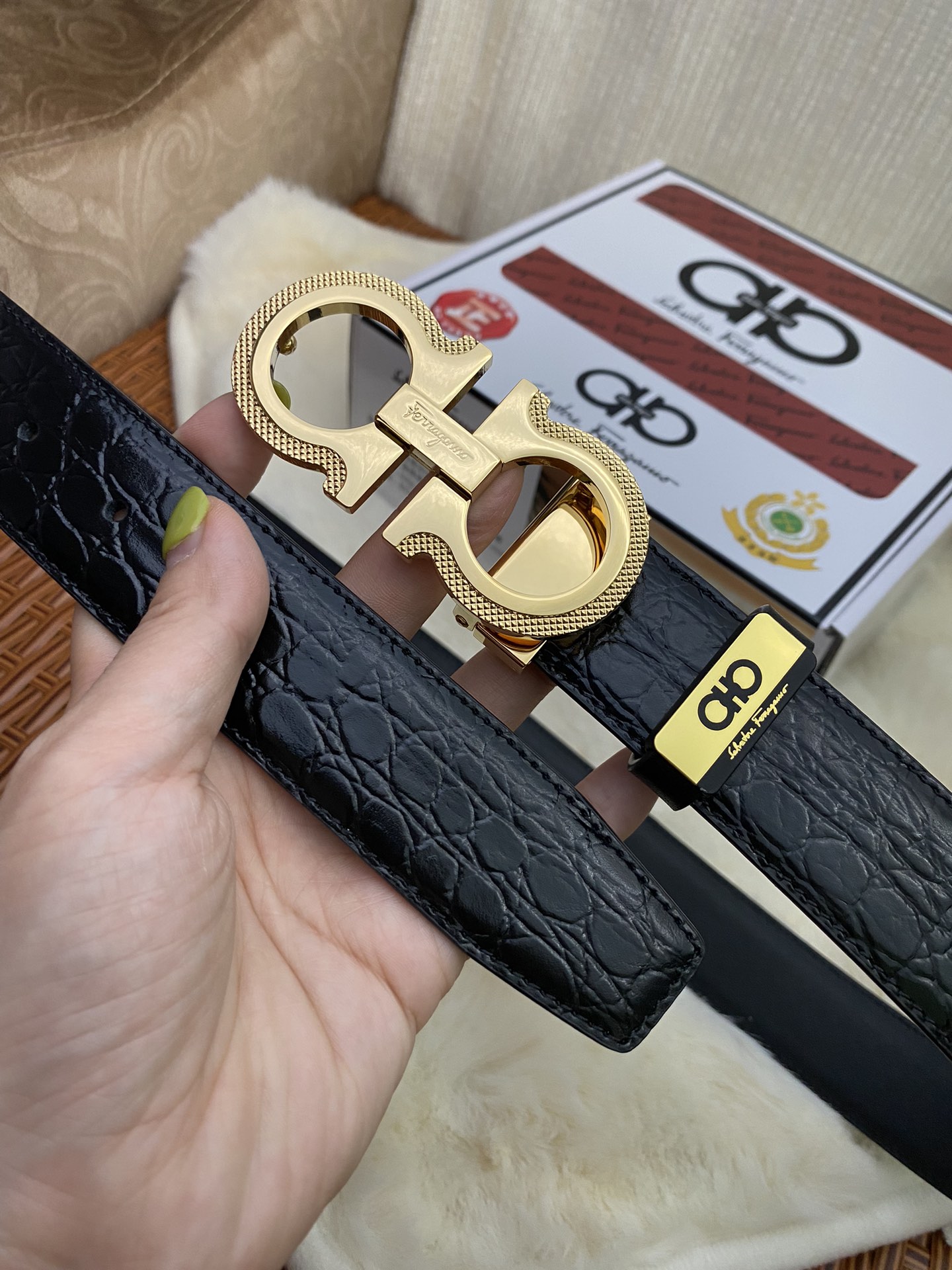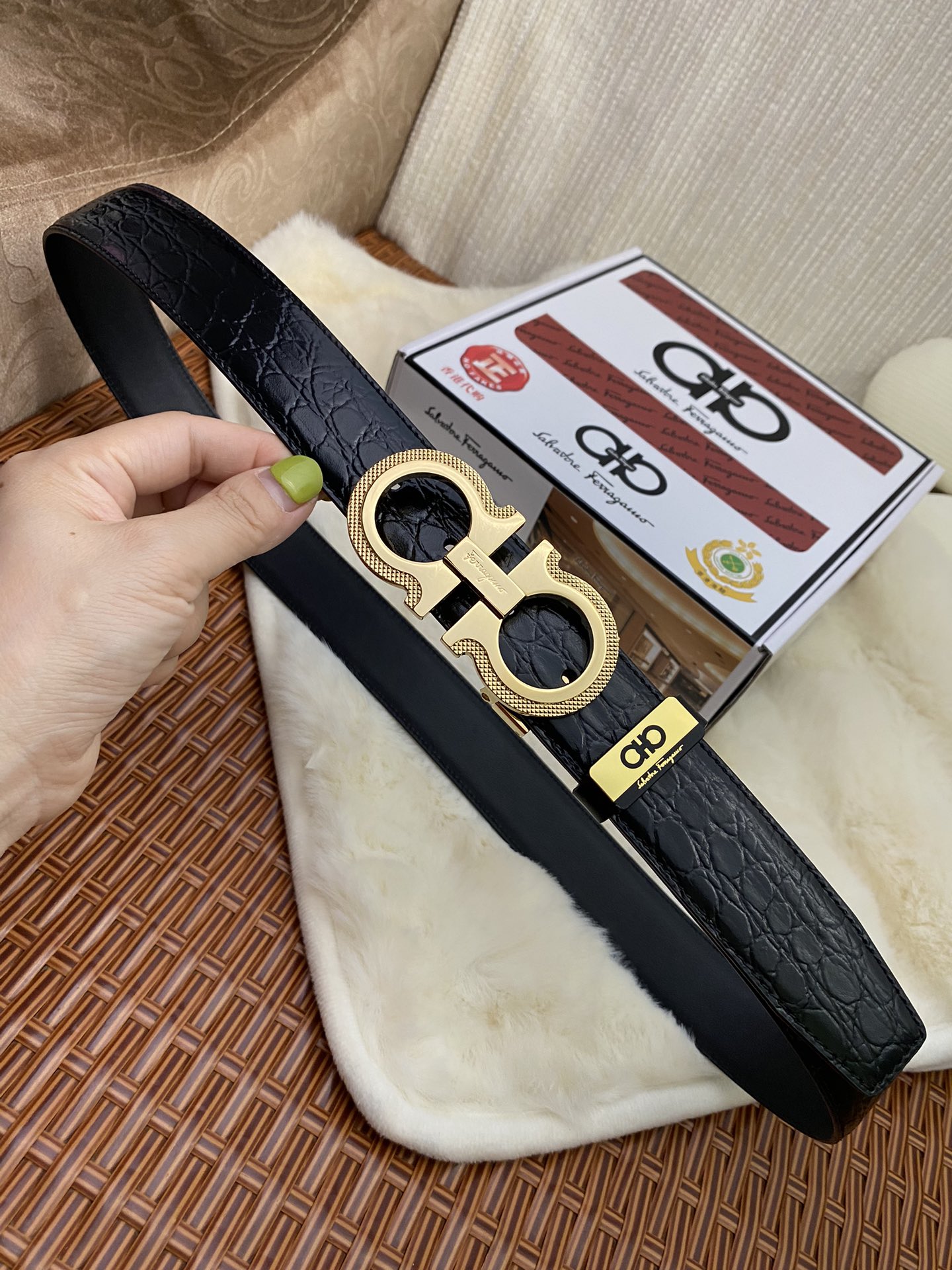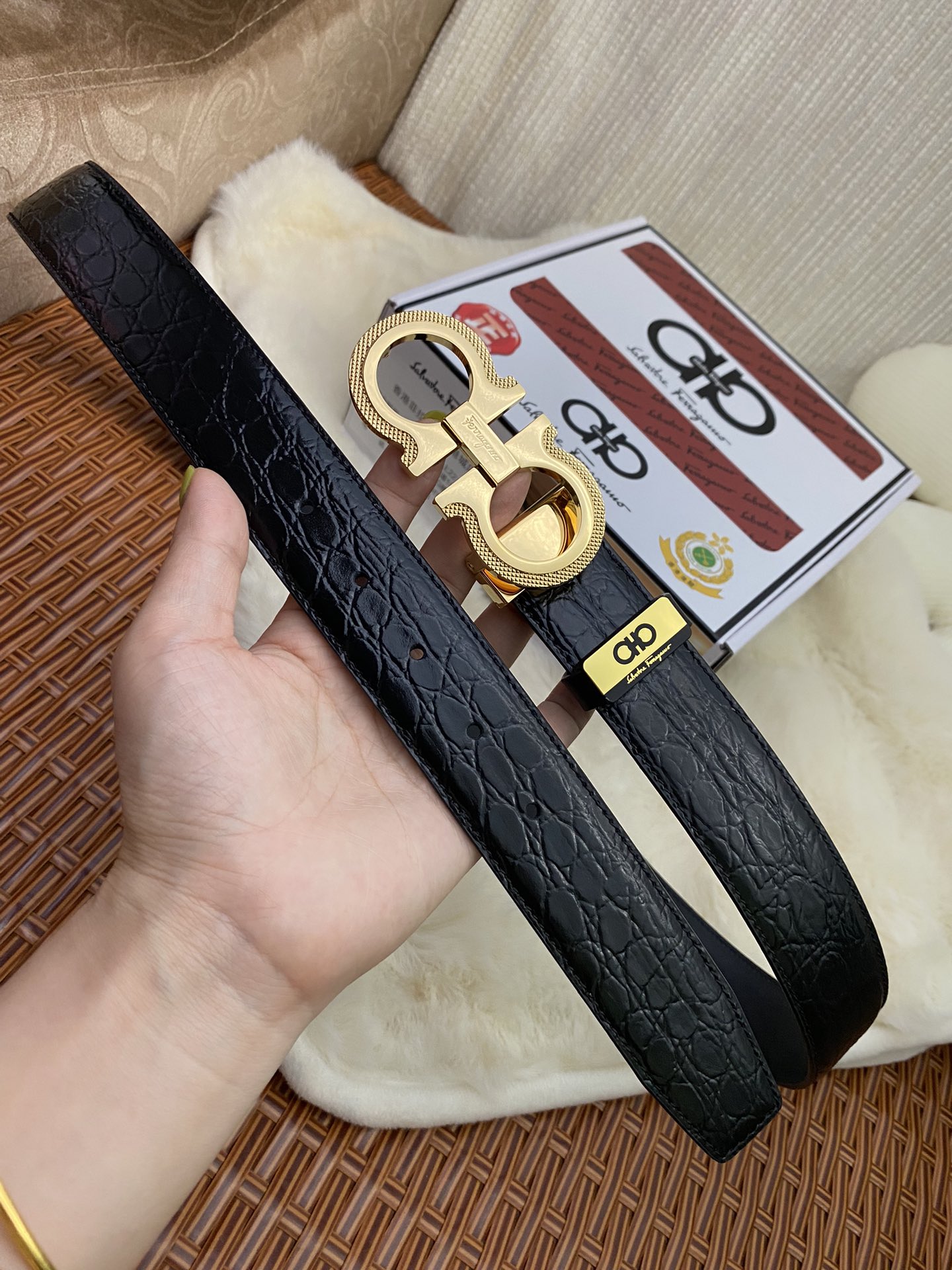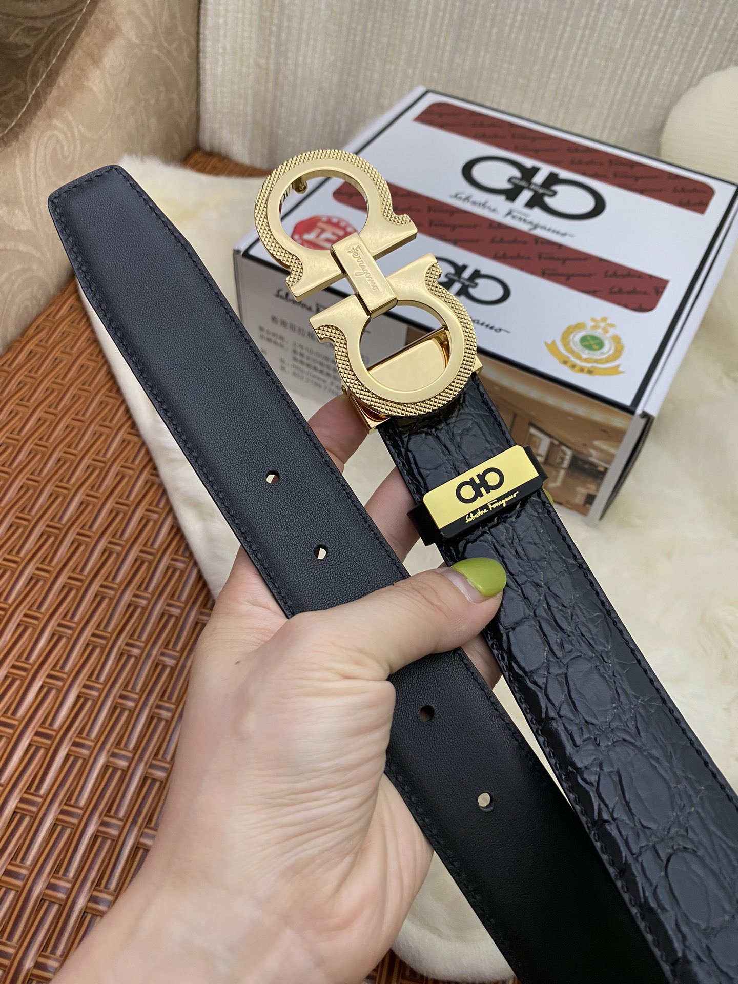 这款皮带是AAAAA 1:1 质量 (非常棒). 使用了和原版一模一样的材料. 商标部分也保持了和菲拉格慕/Salvatore Ferragamo一样. 图片拍摄是实物皮带拍摄, 您所收到的实物保证和我们图片一模一样.