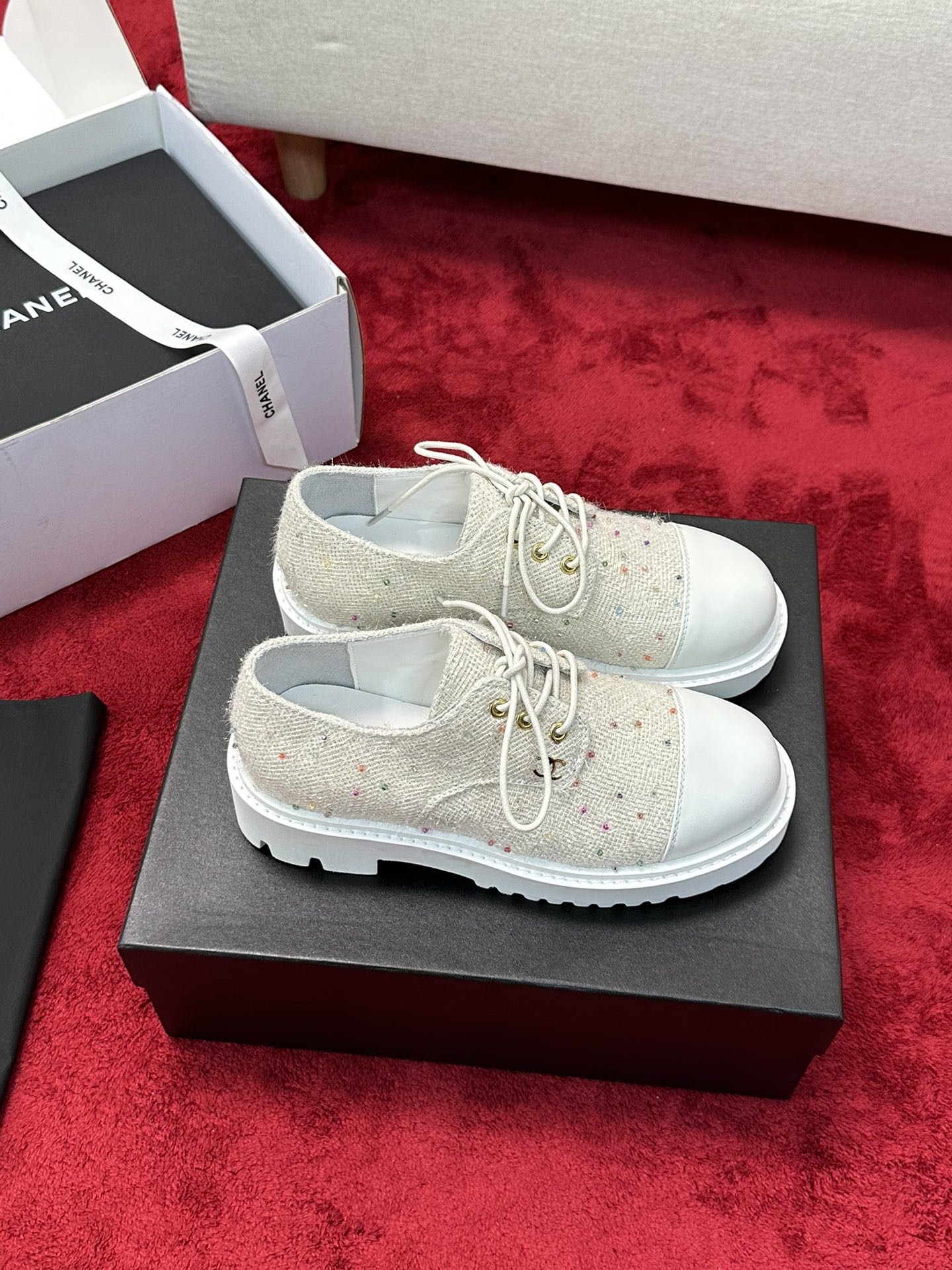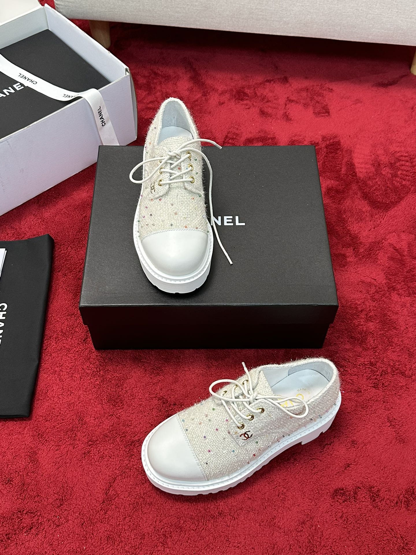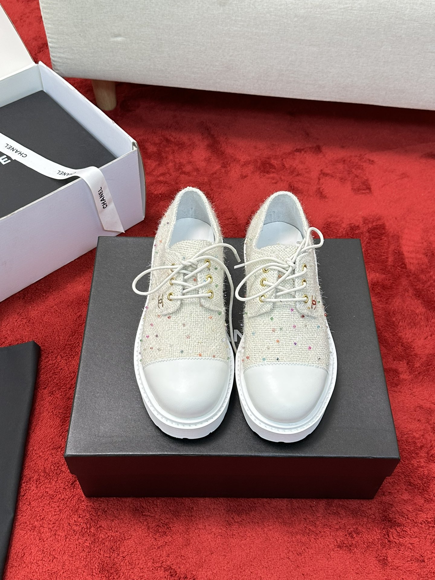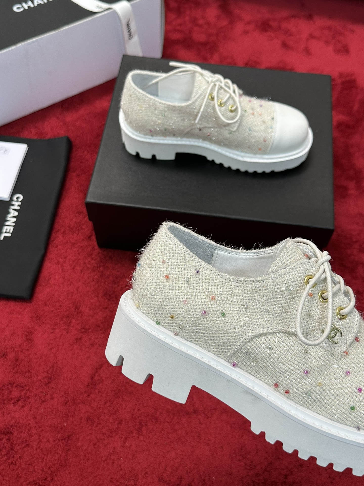 这款鞋子是AAAAA 1:1 质量 (非常棒). 使用了和原版一模一样的材料. 商标部分也保持了和香奈儿/Chanel一样. 图片拍摄是实物鞋子拍摄, 您所收到的实物保证和我们图片一模一样.