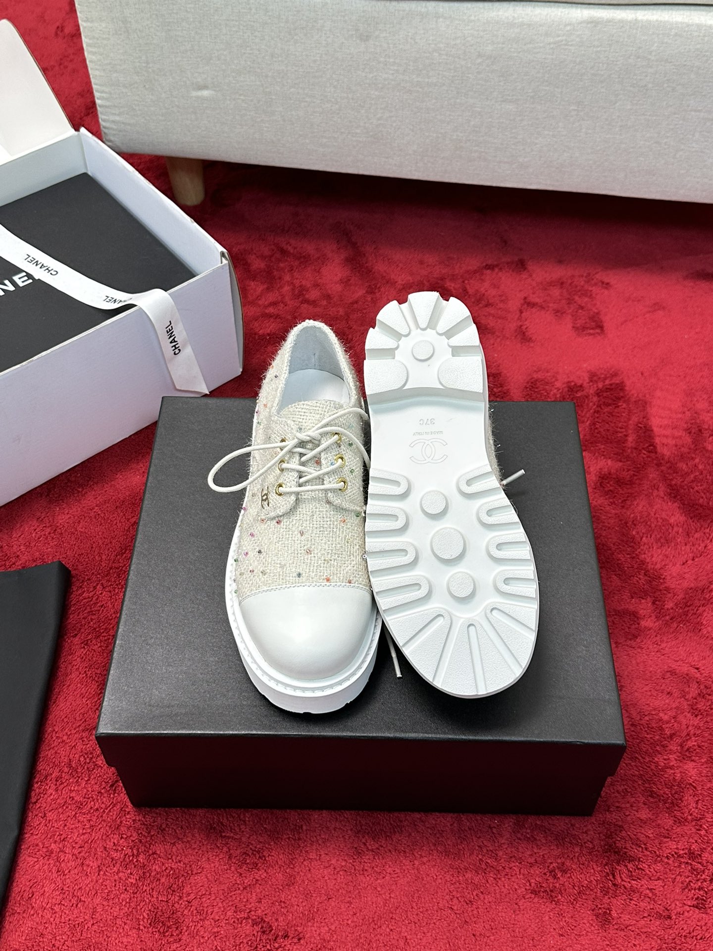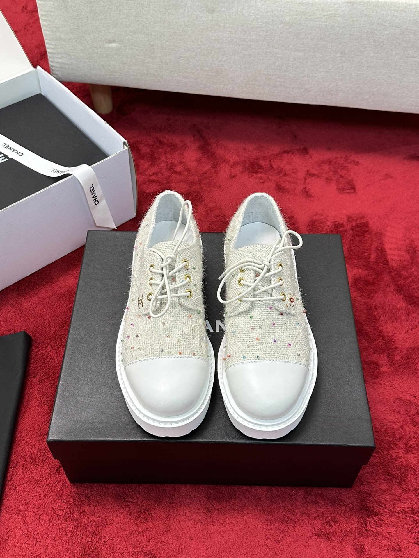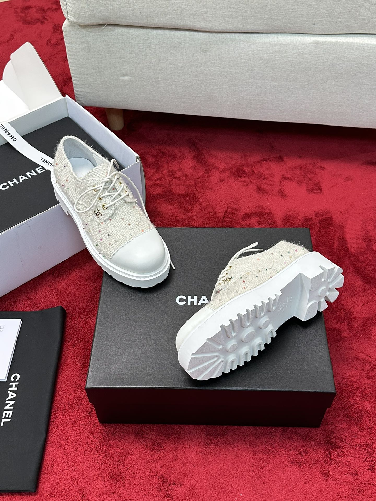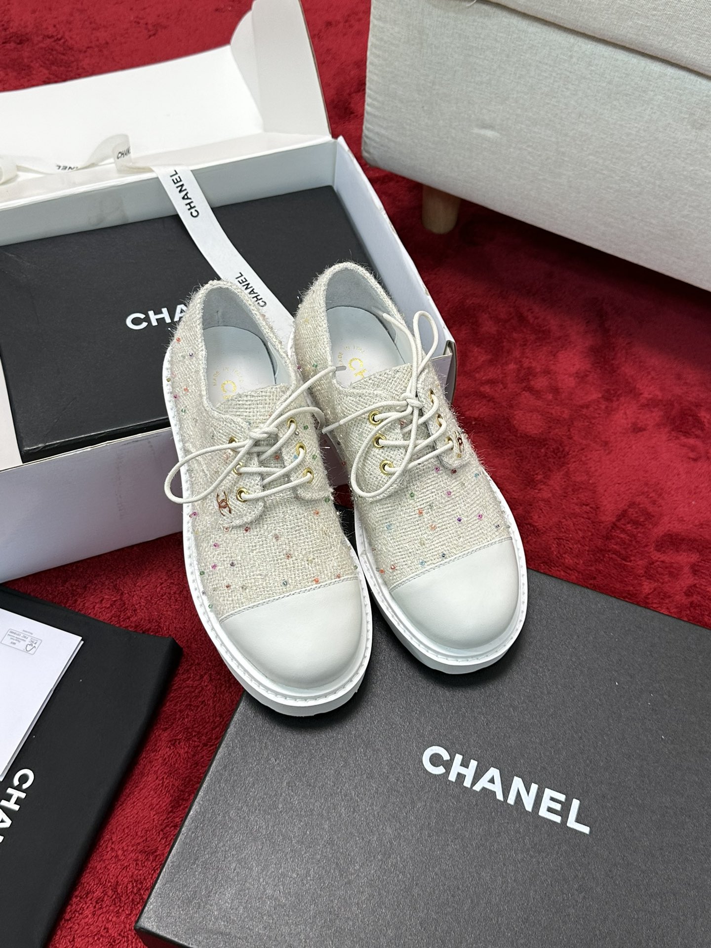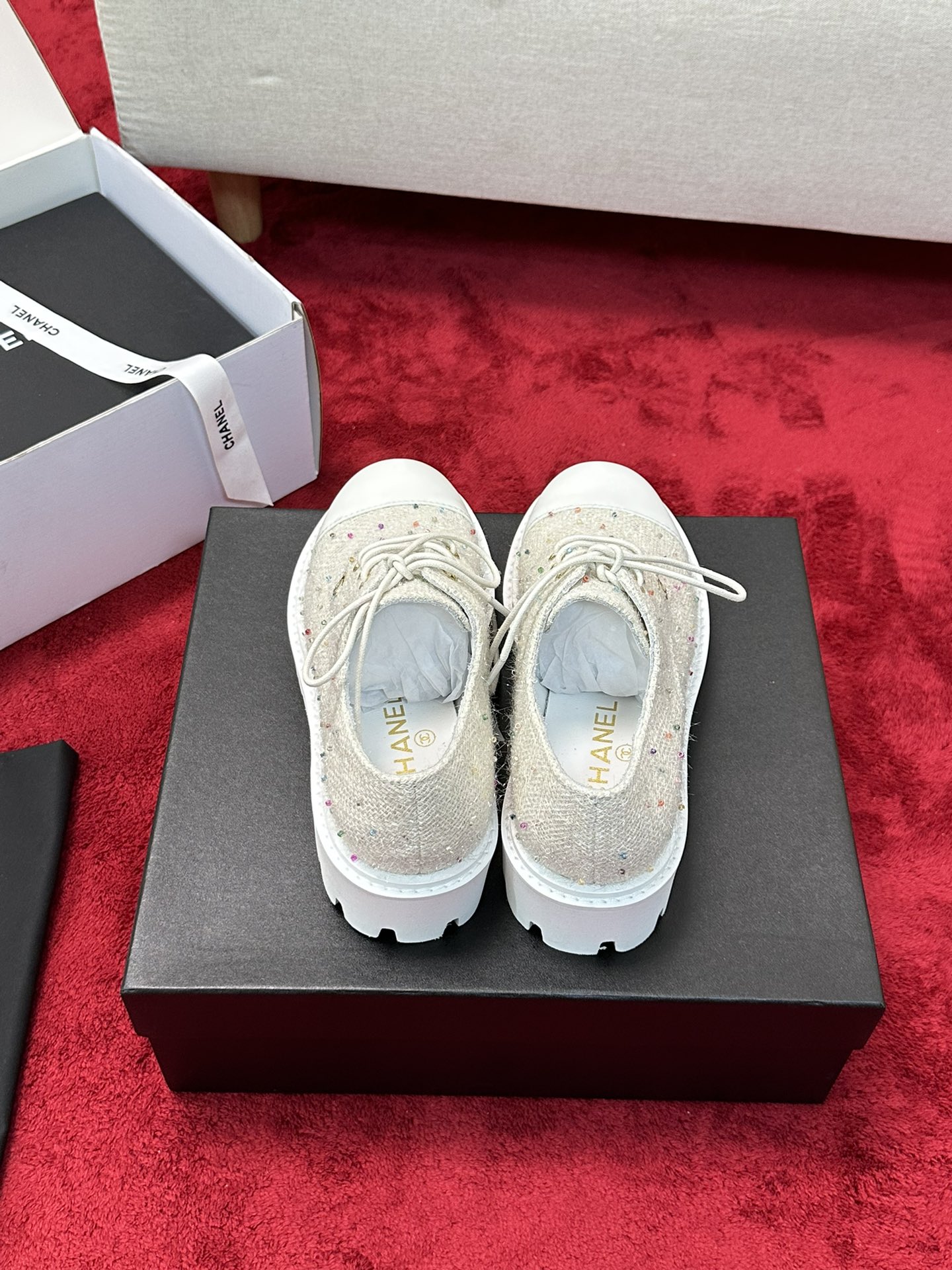 这款鞋子是AAAAA 1:1 质量 (非常棒). 使用了和原版一模一样的材料. 商标部分也保持了和香奈儿/Chanel一样. 图片拍摄是实物鞋子拍摄, 您所收到的实物保证和我们图片一模一样.