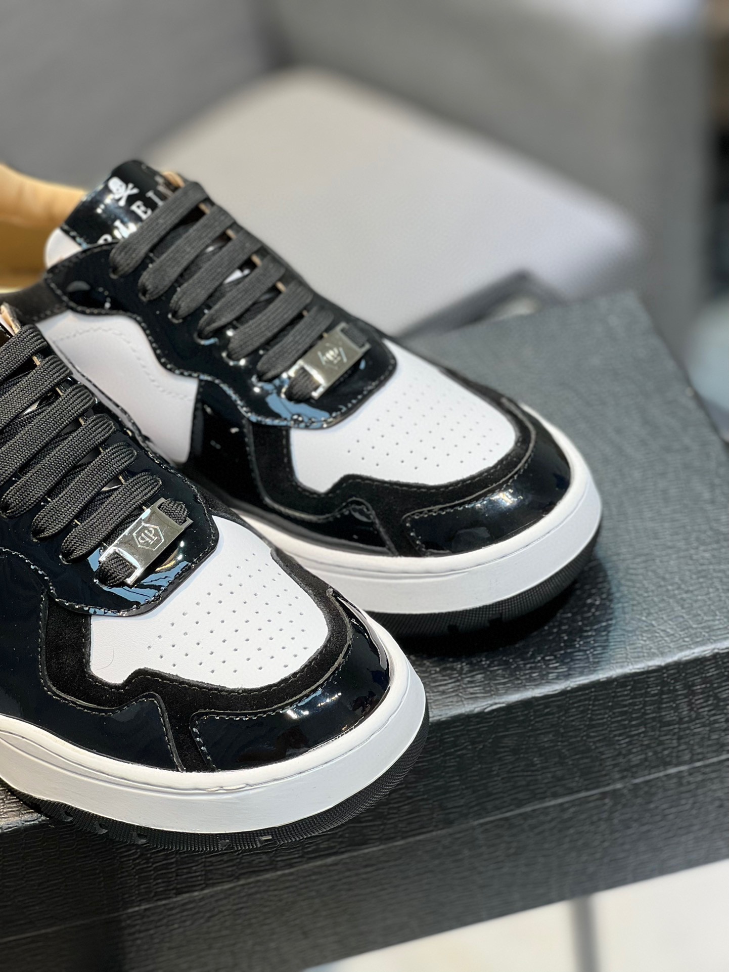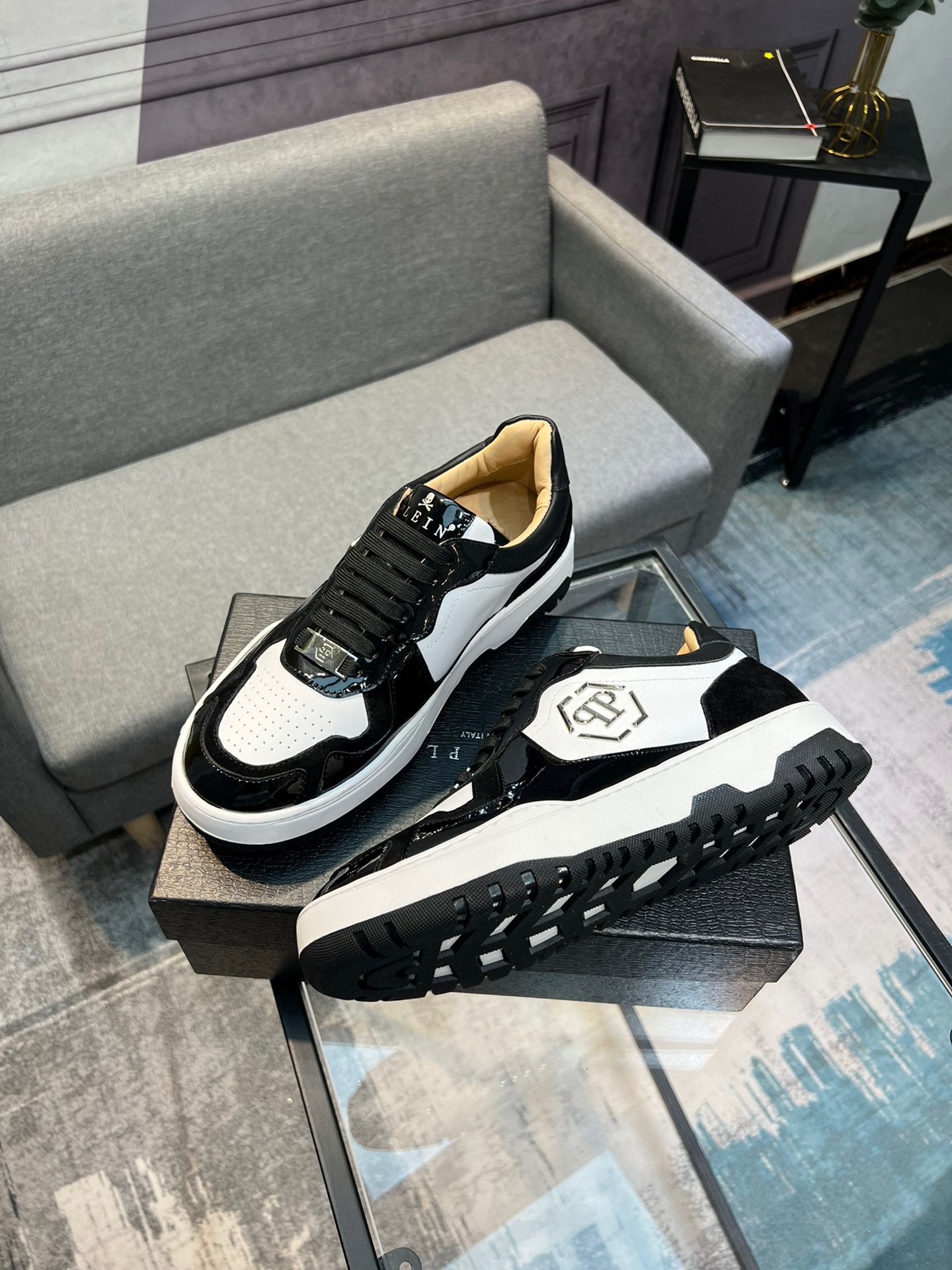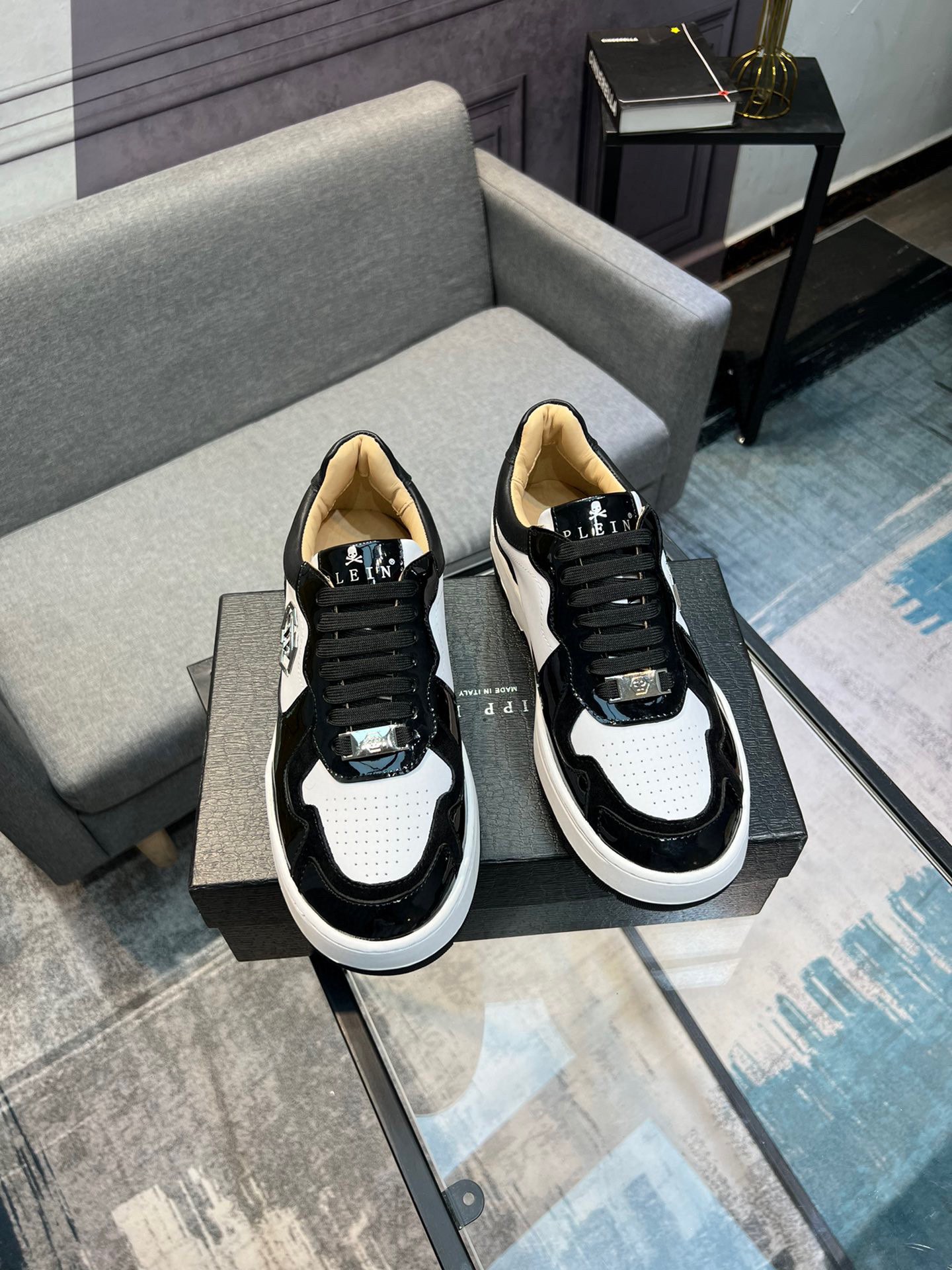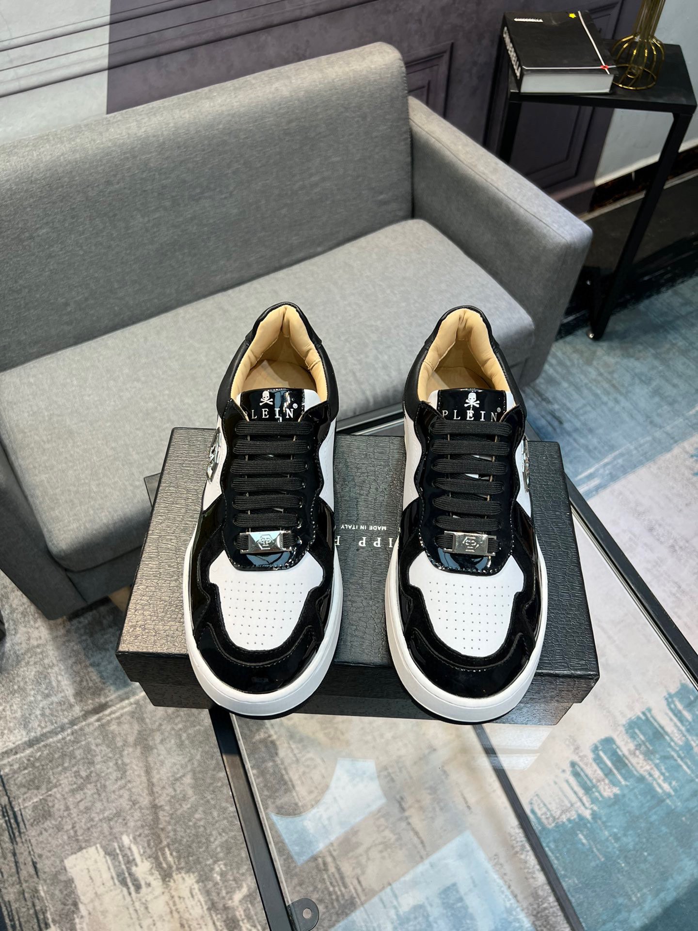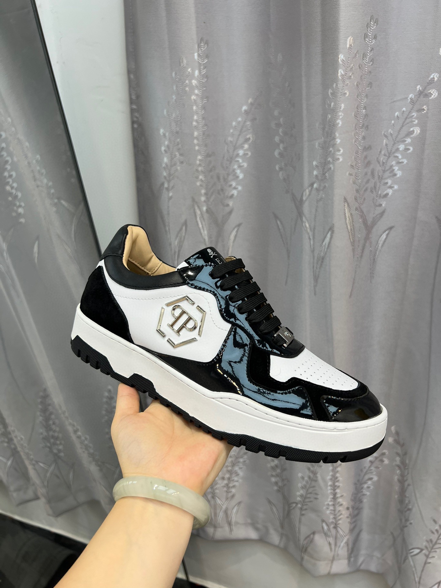 这款鞋子是AAAAA 1:1 质量 (非常棒). 使用了和原版一模一样的材料. 商标部分也保持了和菲利普·普林/Philipp Plein一样. 图片拍摄是实物鞋子拍摄, 您所收到的实物保证和我们图片一模一样.