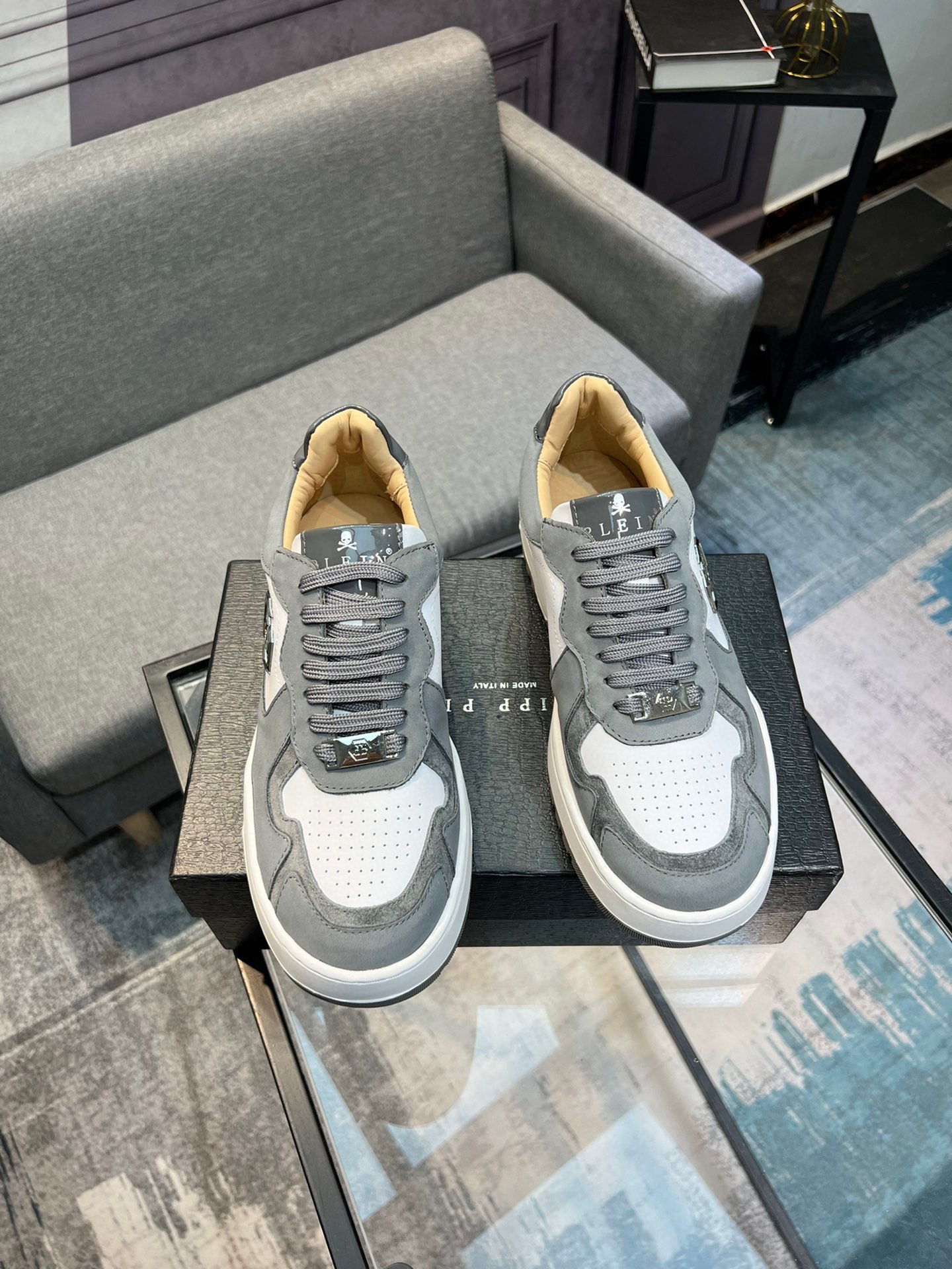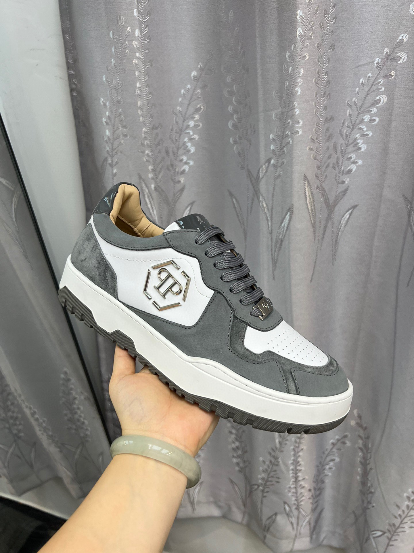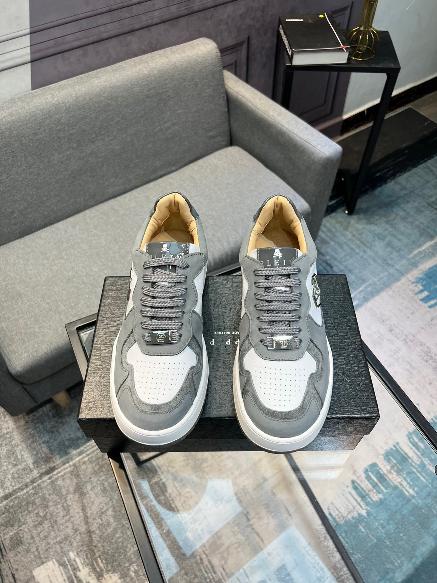 这款鞋子是AAAAA 1:1 质量 (非常棒). 使用了和原版一模一样的材料. 商标部分也保持了和菲利普·普林/Philipp Plein一样. 图片拍摄是实物鞋子拍摄, 您所收到的实物保证和我们图片一模一样.