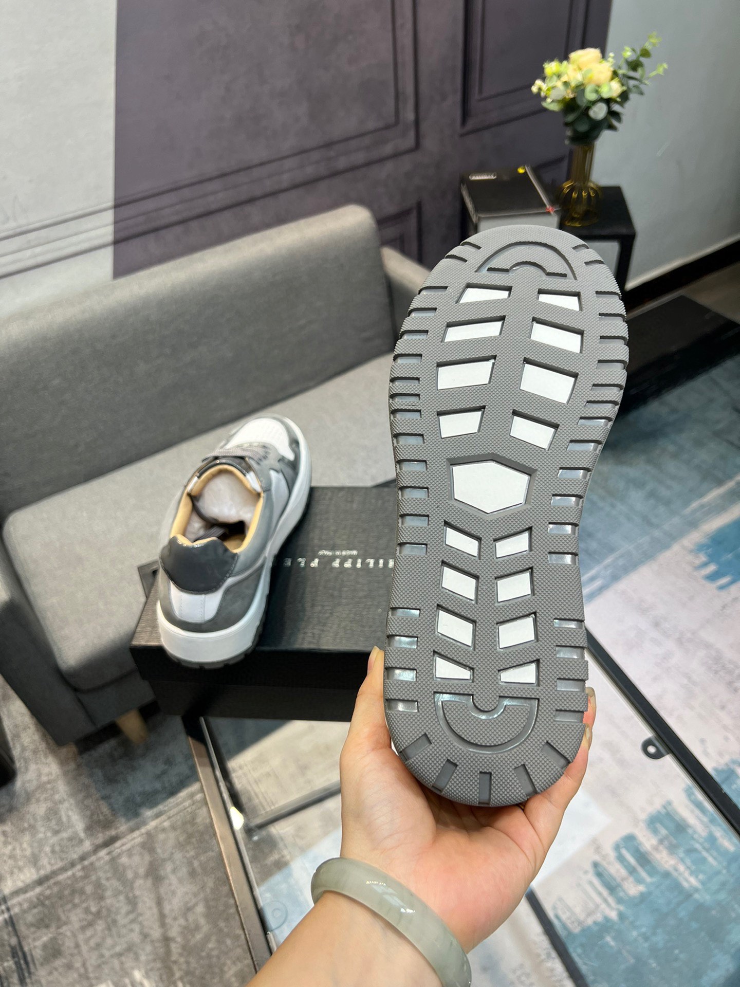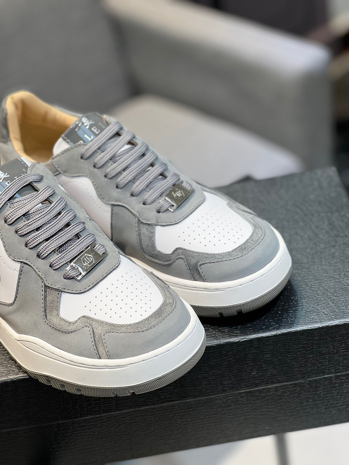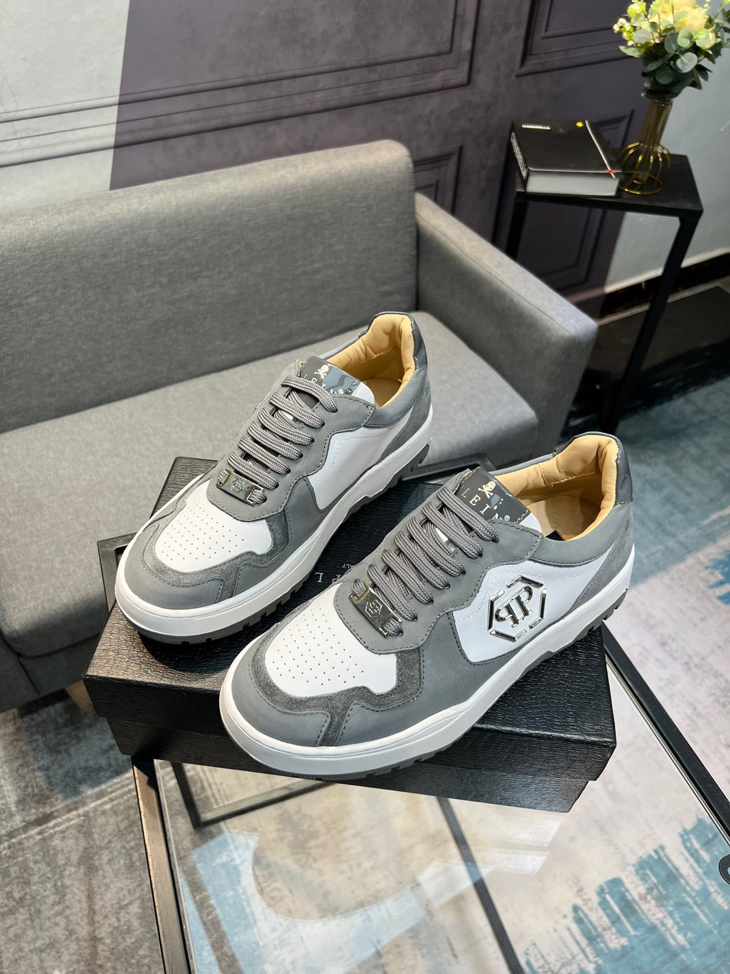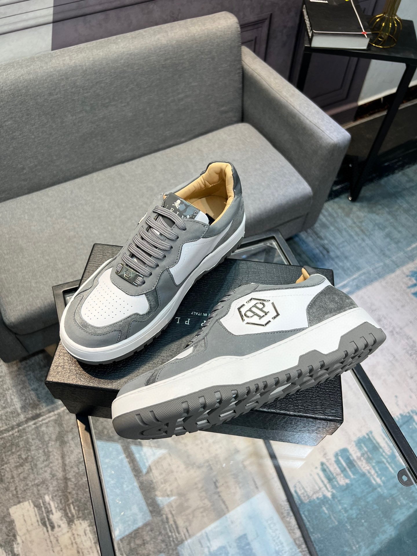 这款鞋子是AAAAA 1:1 质量 (非常棒). 使用了和原版一模一样的材料. 商标部分也保持了和菲利普·普林/Philipp Plein一样. 图片拍摄是实物鞋子拍摄, 您所收到的实物保证和我们图片一模一样.