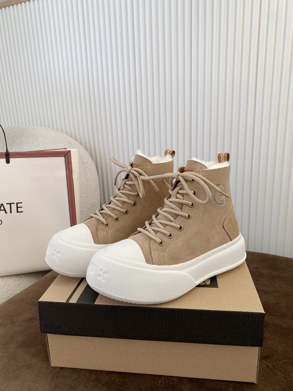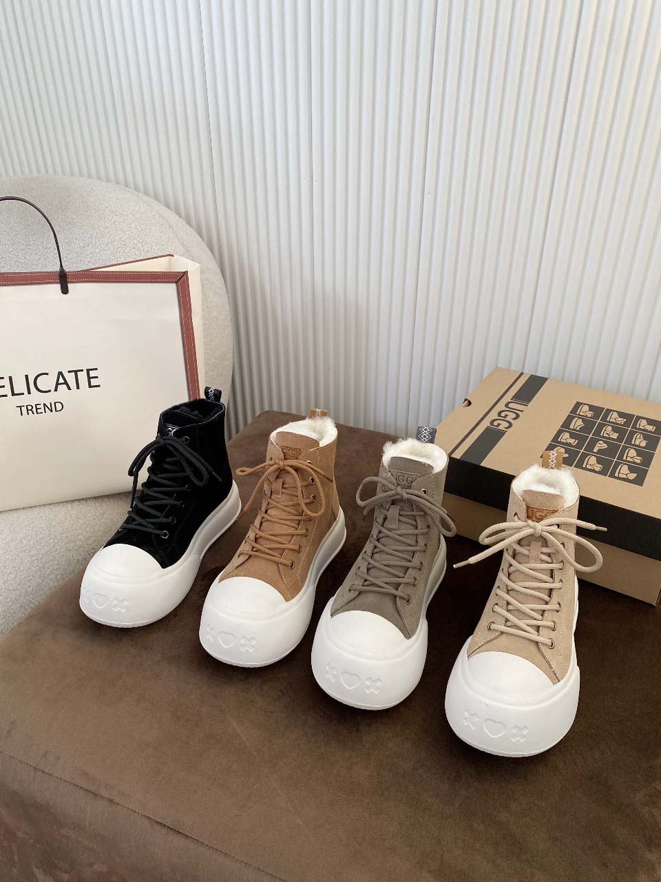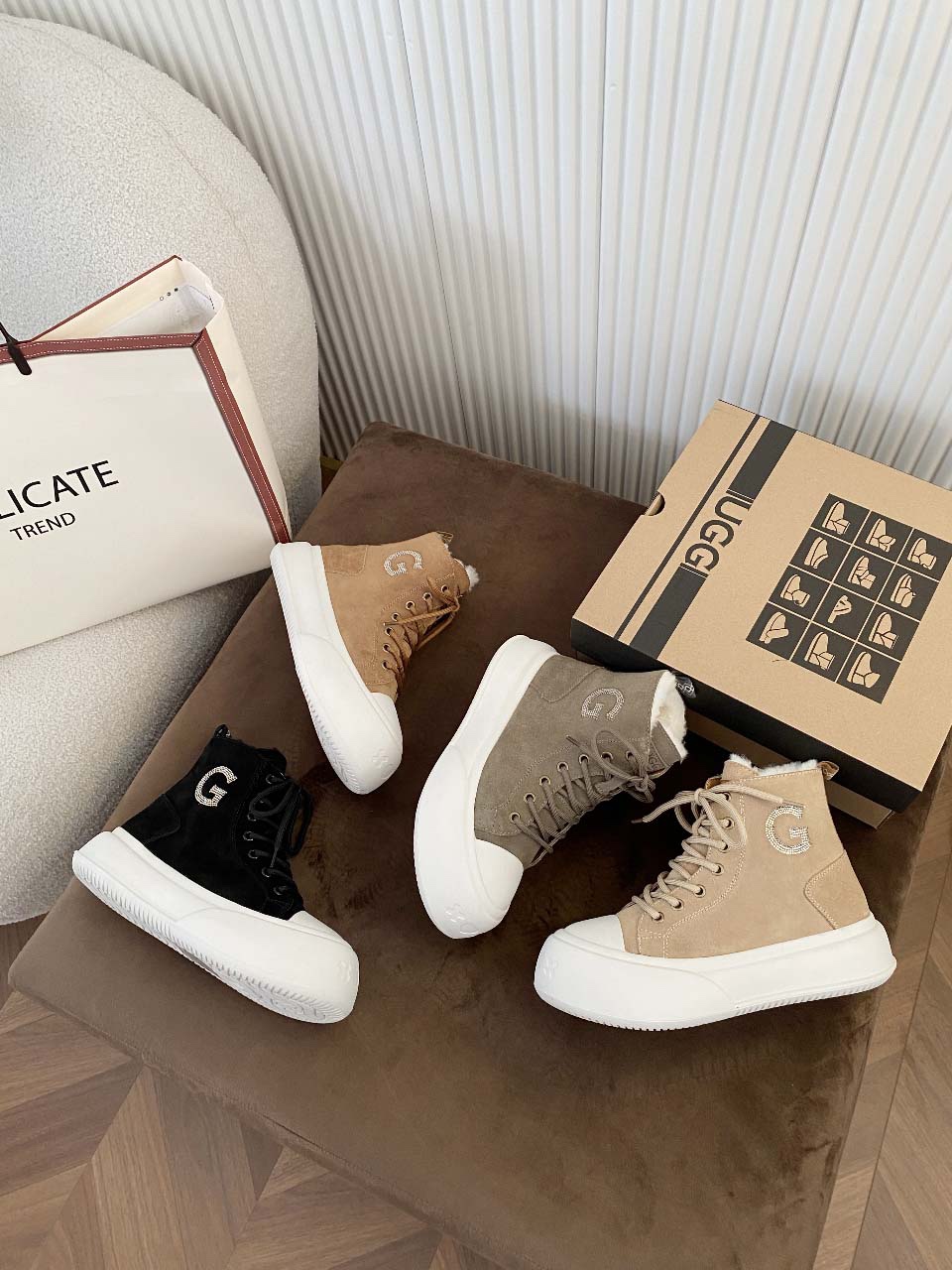 这款鞋子是AAAAA 1:1 质量 (非常棒). 使用了和原版一模一样的材料. 商标部分也保持了和UGG雪地靴一样. 图片拍摄是实物鞋子拍摄, 您所收到的实物保证和我们图片一模一样.